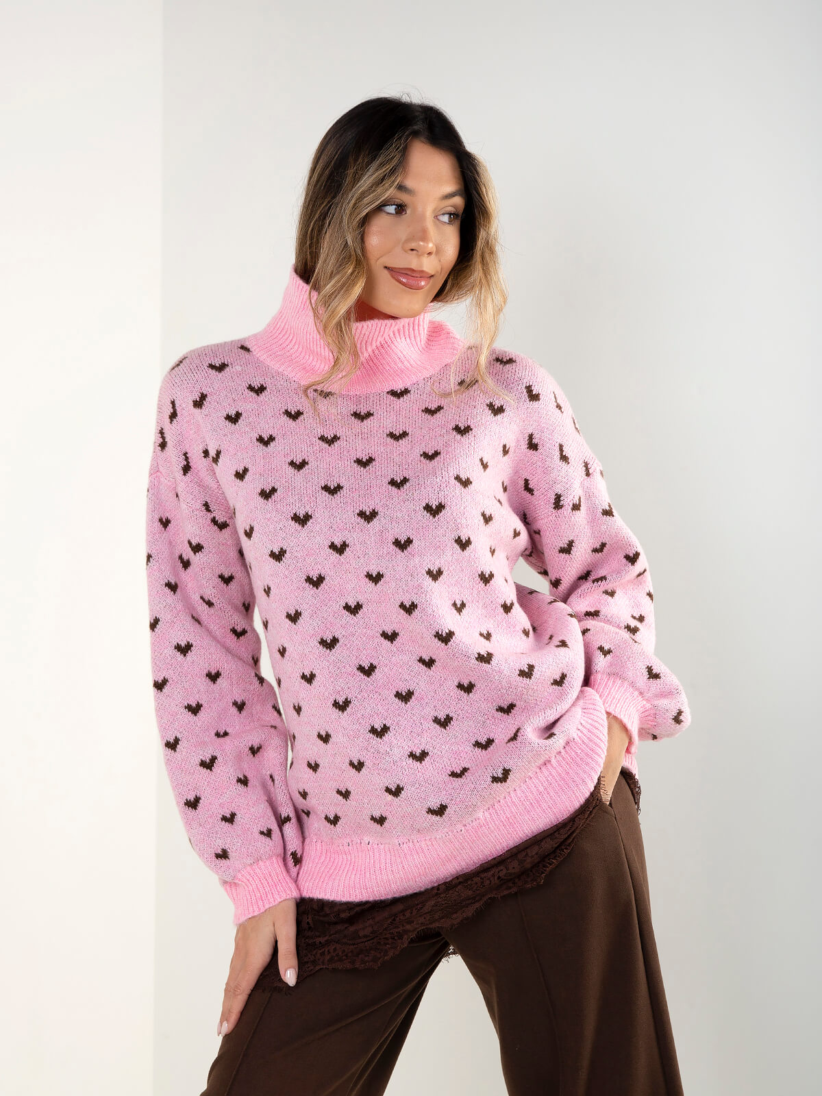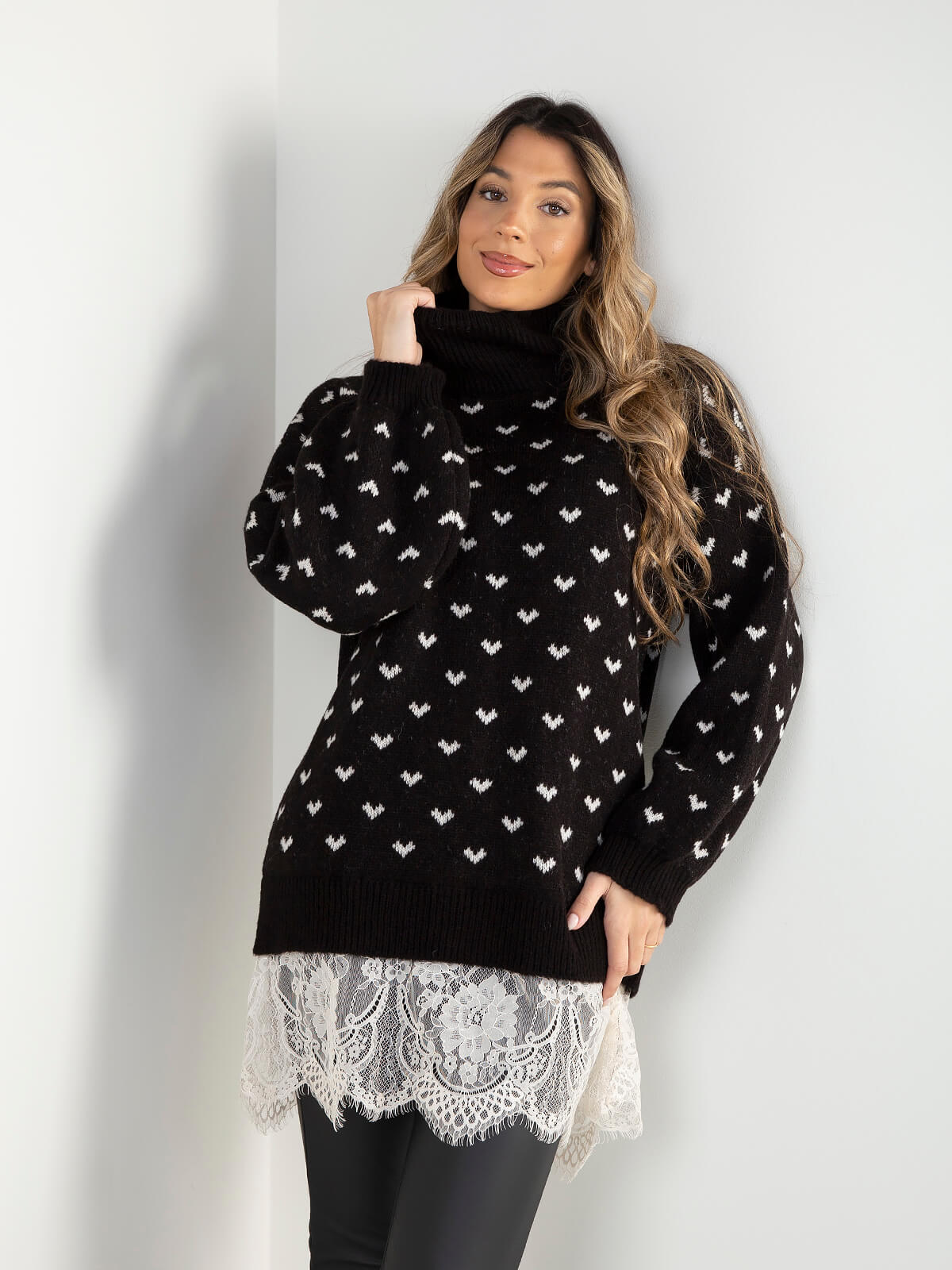 Camisola de malha com gola alta, padrão de pequenos corações em contraste e acabamento em renda aplicada na barra, dando um efeito mais feminino e elegante. Perfeita para usar com leggings, jeans ou botas.