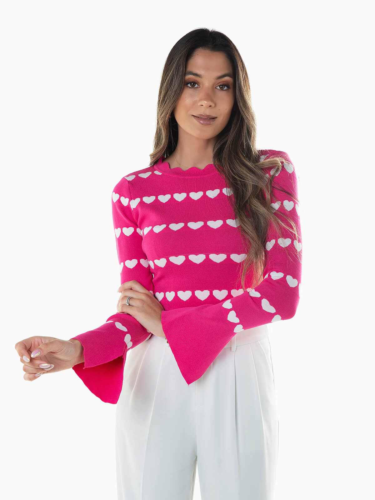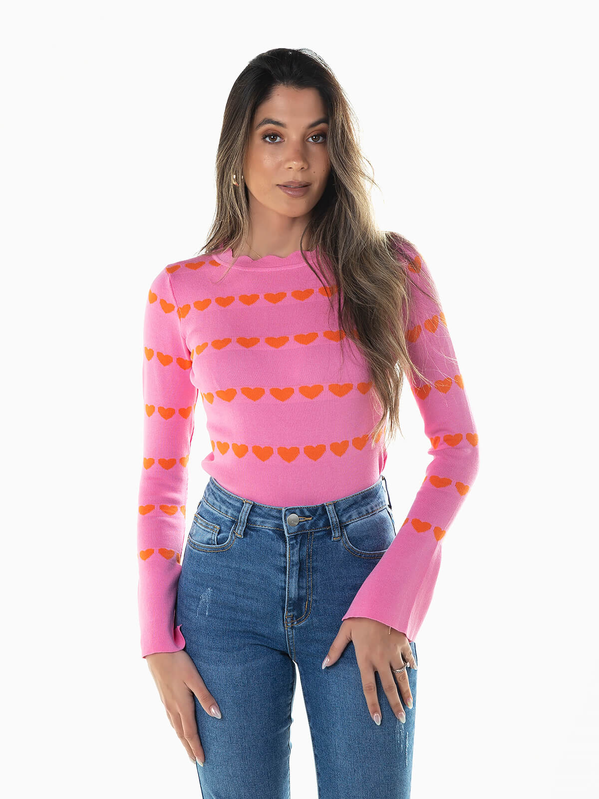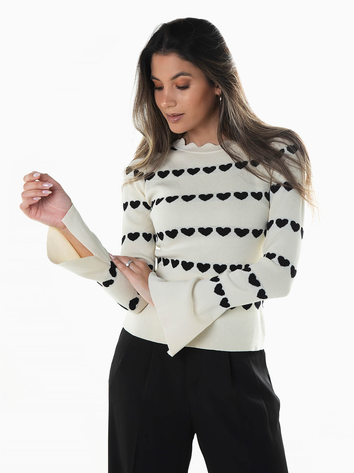 Camisola malha com corações em contraste. Camisola manga comprida com punhos à boca de sino. Decote redondo recortado.
