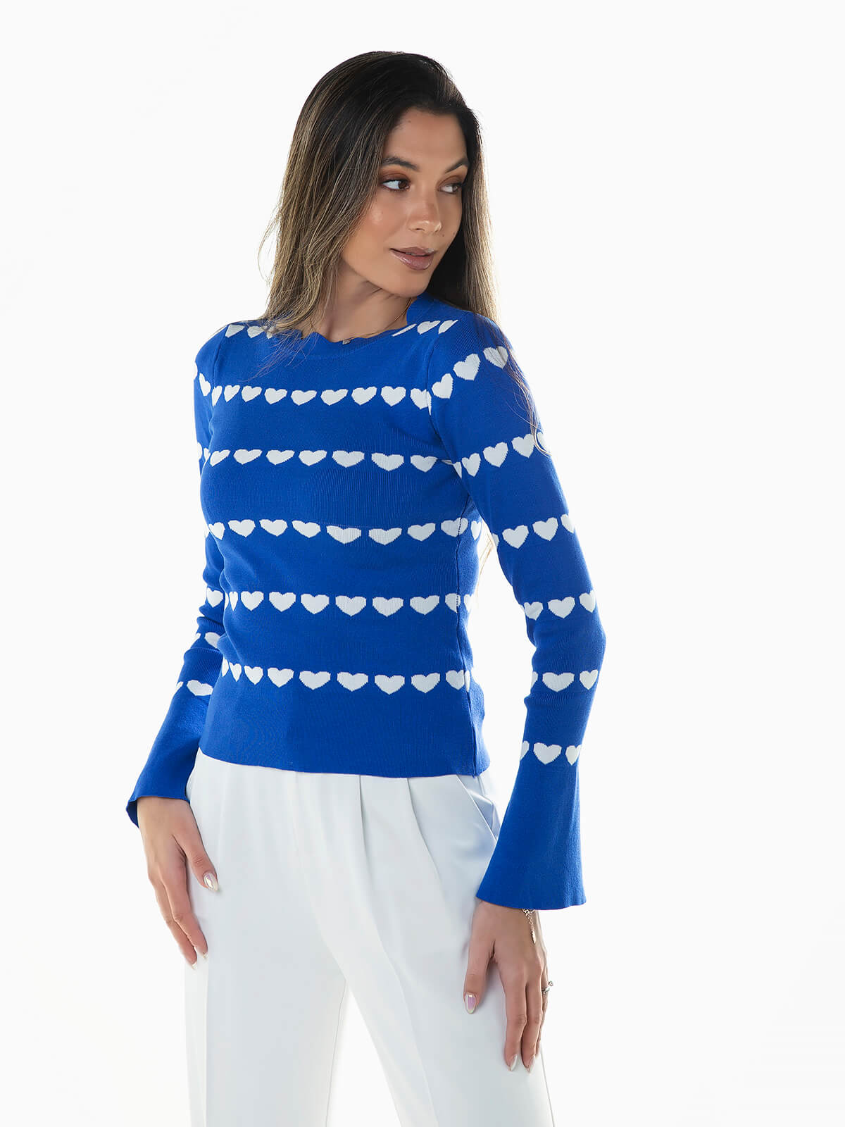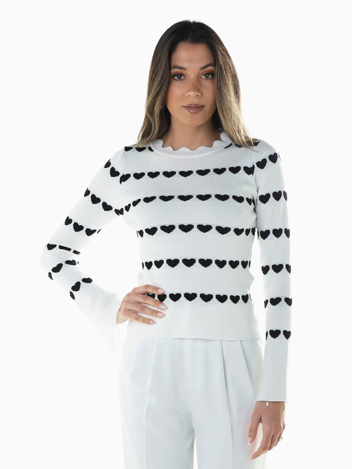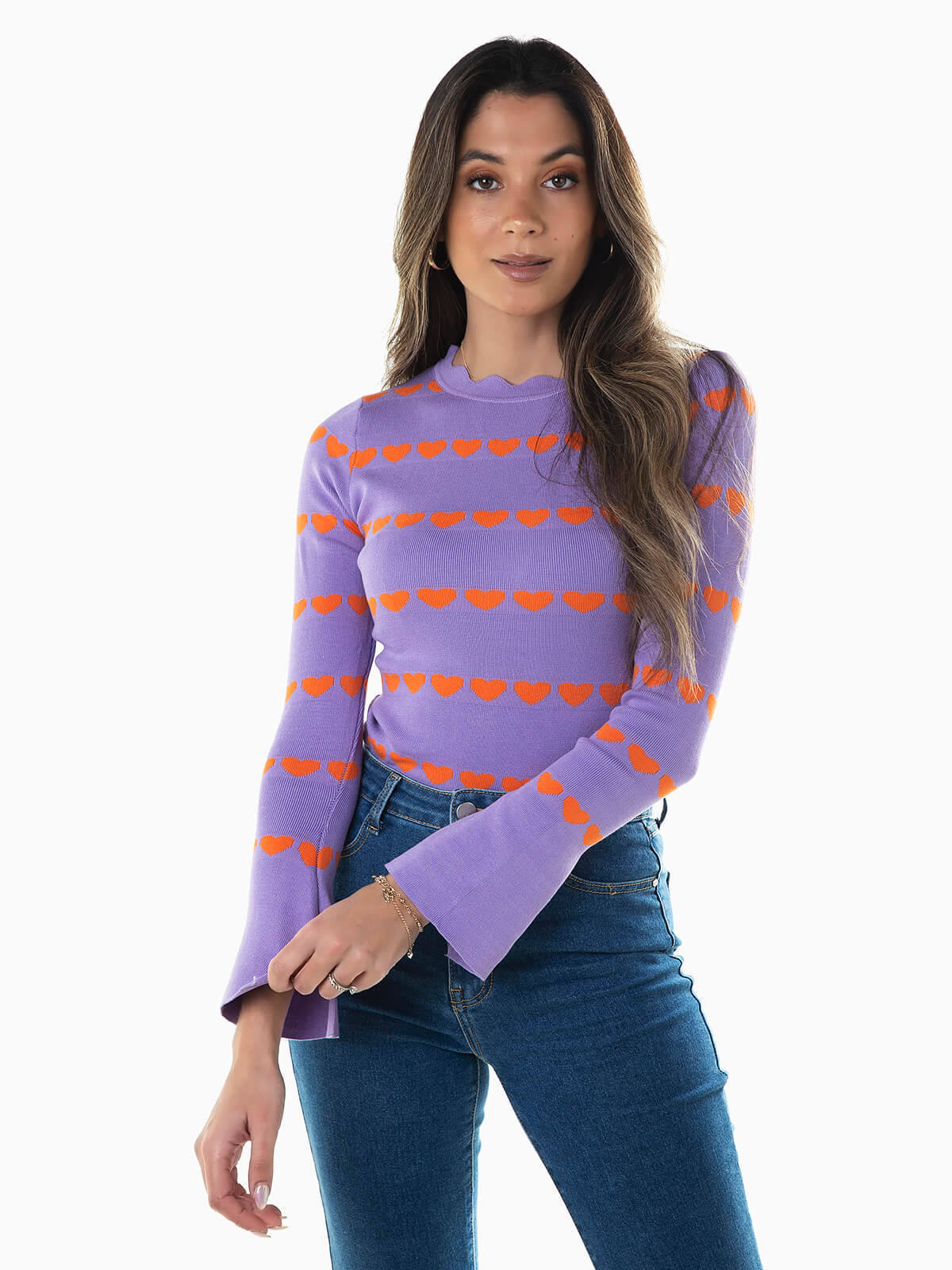 Camisola malha com corações em contraste. Camisola manga comprida com punhos à boca de sino. Decote redondo recortado.