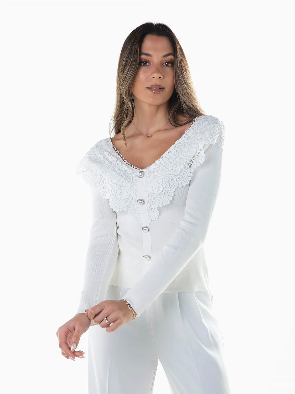 Camisola malha com aplicação de folho em crochet. Camisola manga comprida com botões decorativos. Decote em bico.