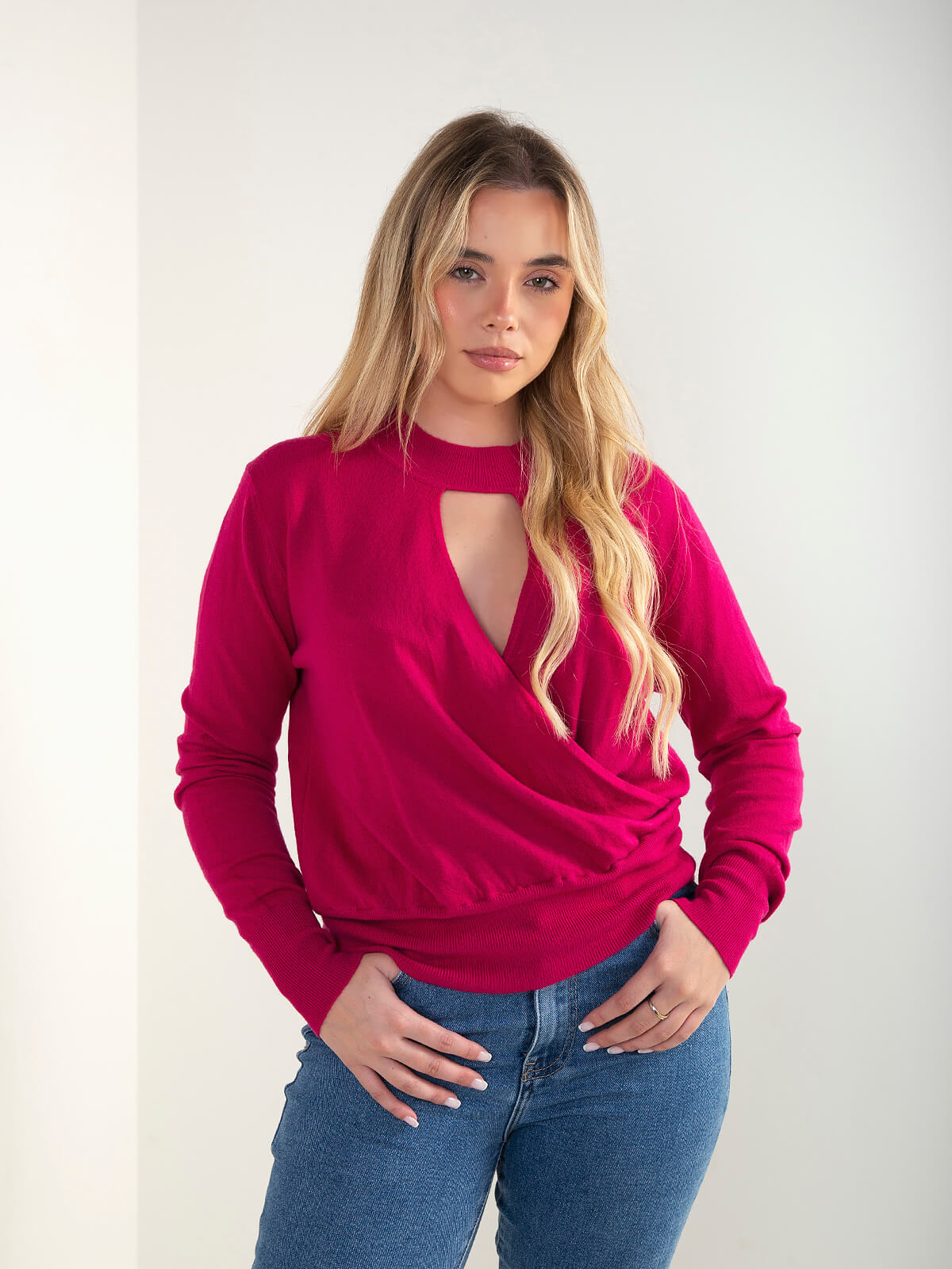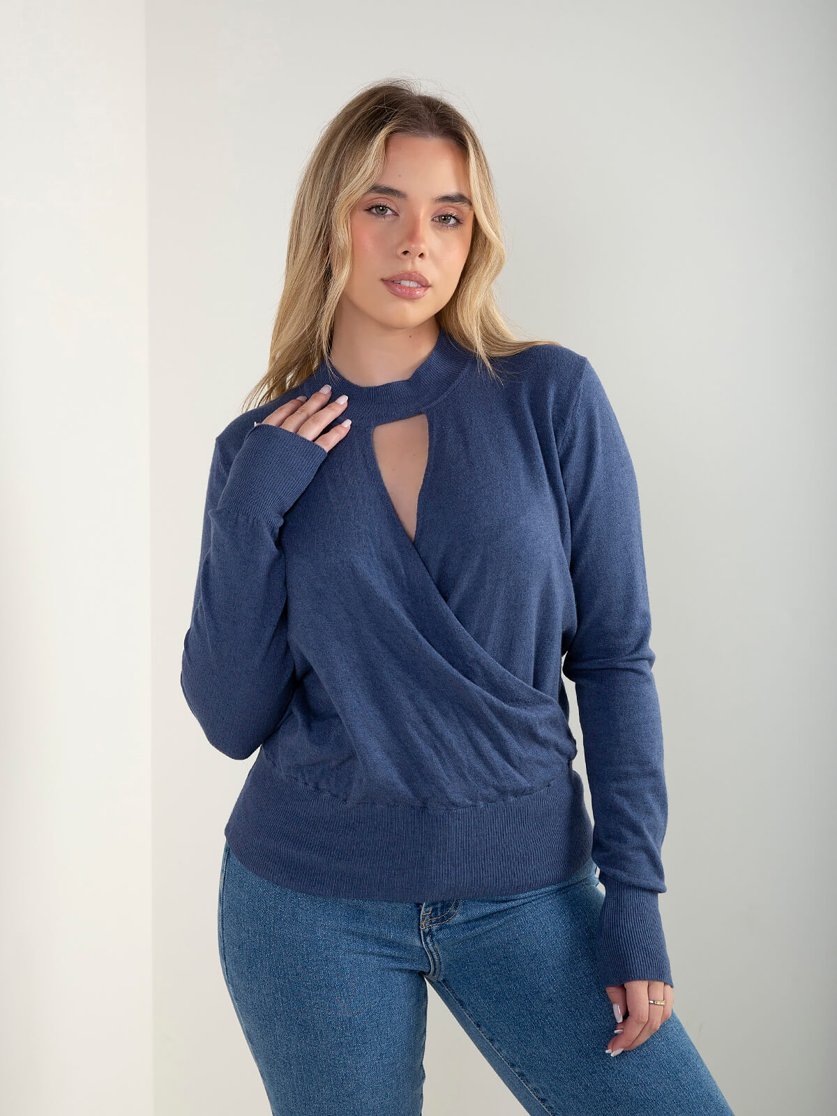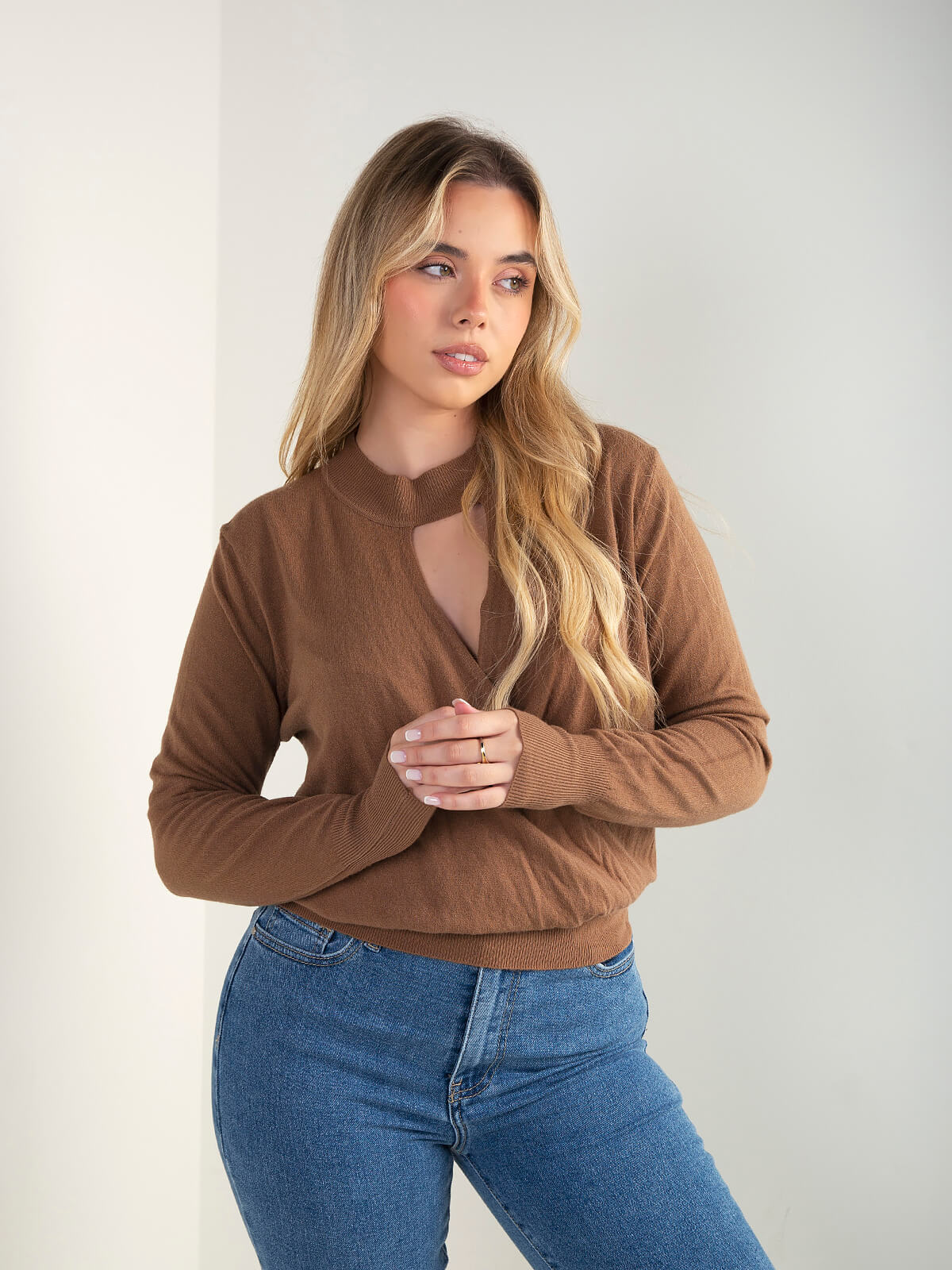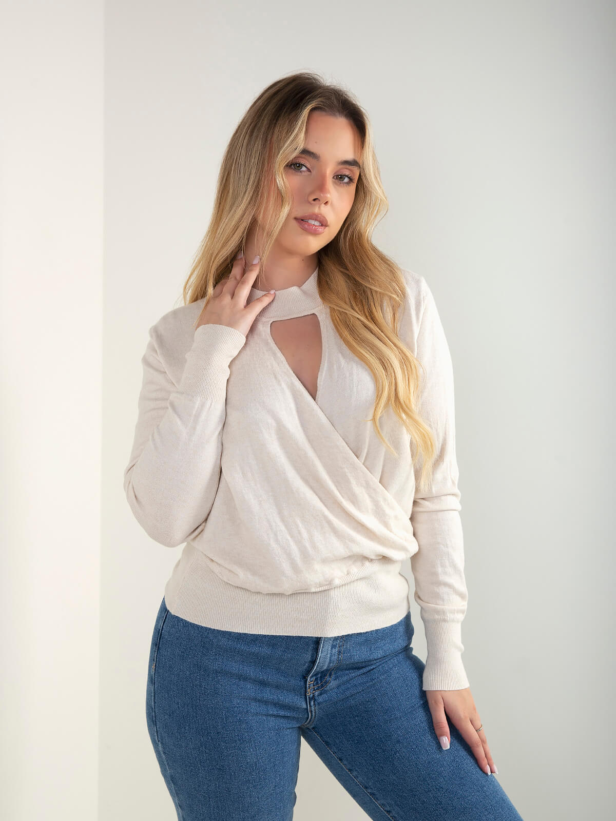 Camisola de malha com detalhe cruzado à frente, recorte na gola e manga comprida. Confortável e com bom caimento, ideal para looks do dia a dia com um toque mais arranjado.