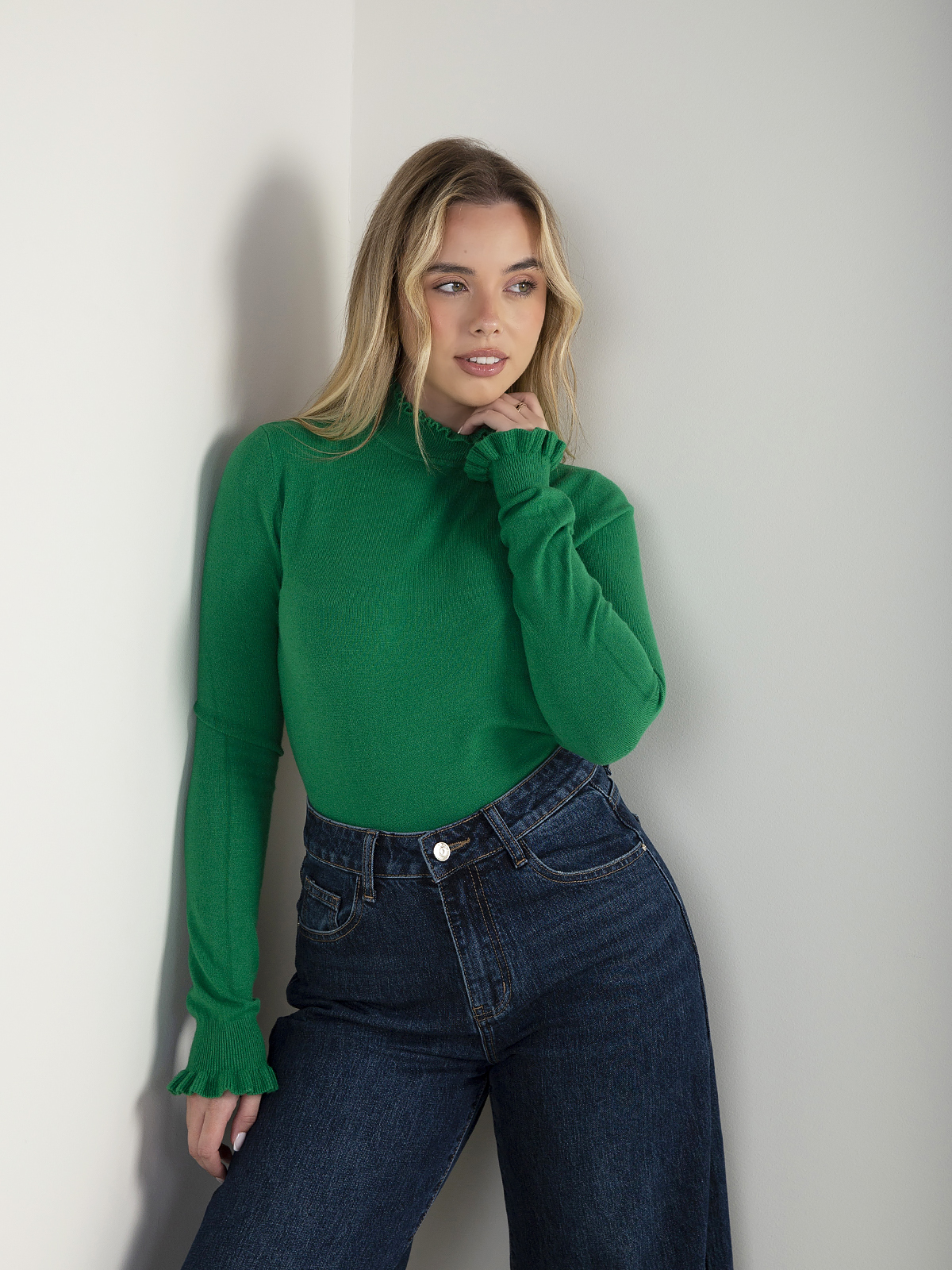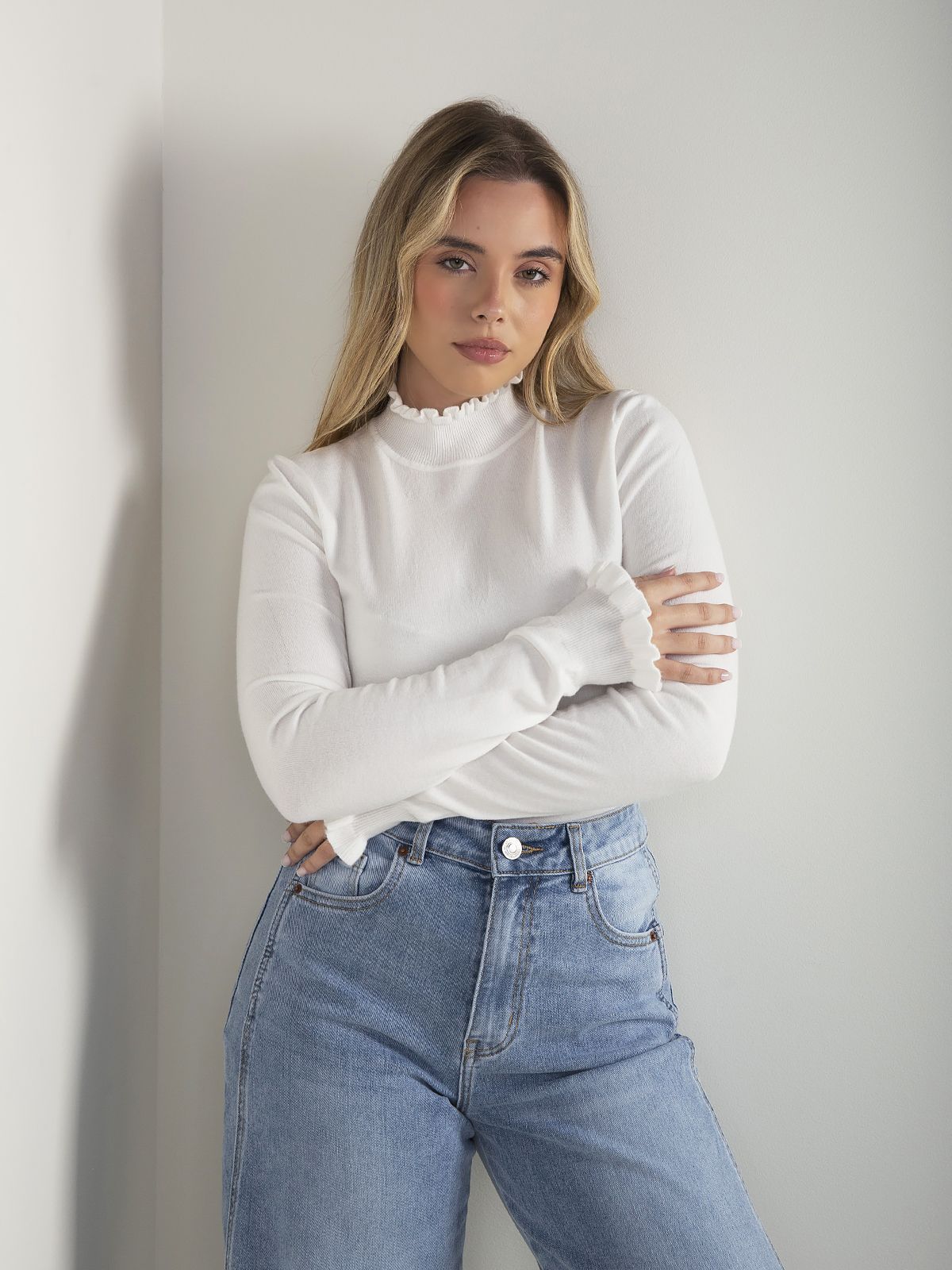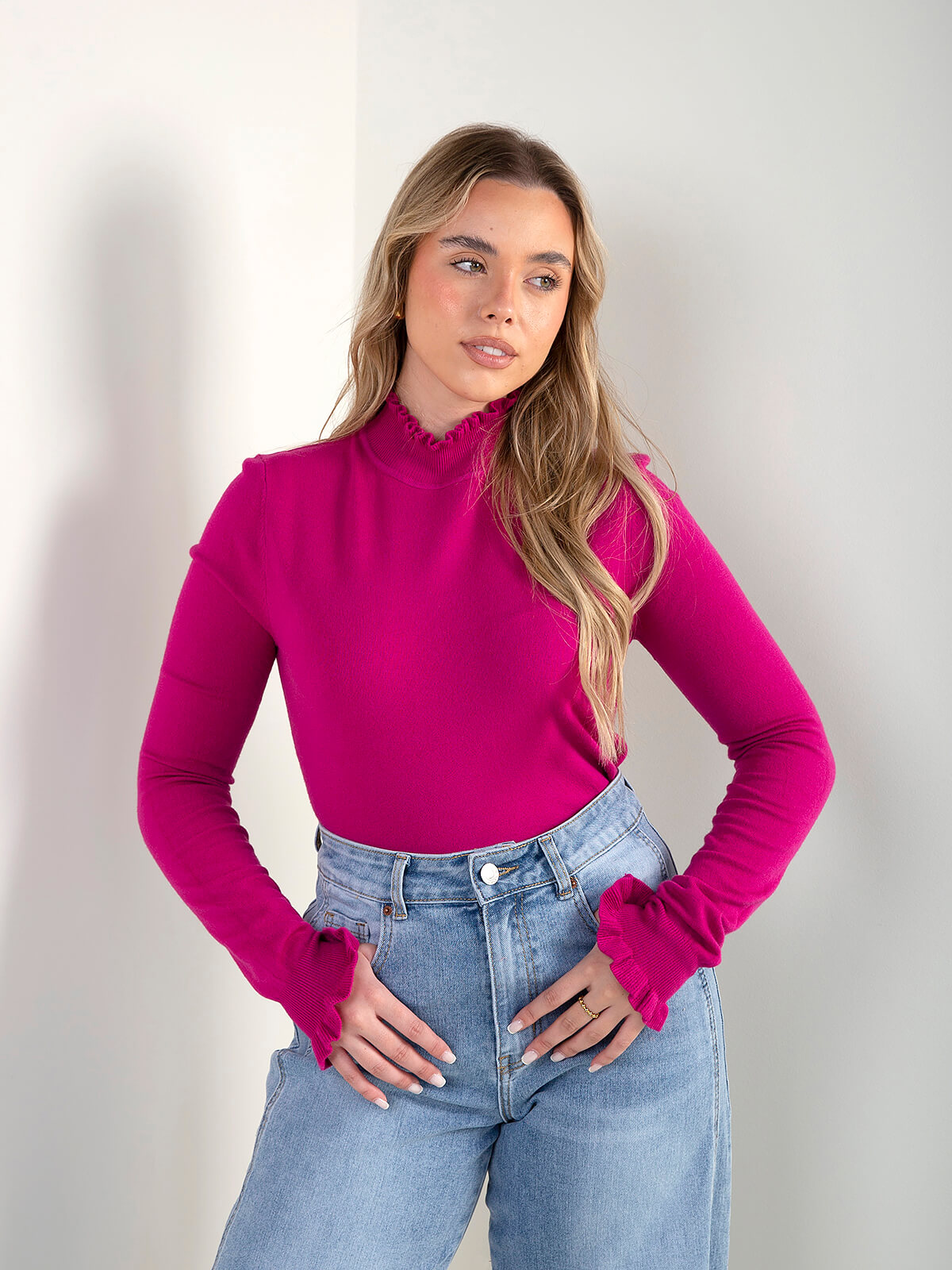 Camisola de malha fina com detalhe de folhos na gola perkins e nos punhos. Modelo leve, confortável ideal para looks simples e elegantes.Camisola malha com detalhe de folhos