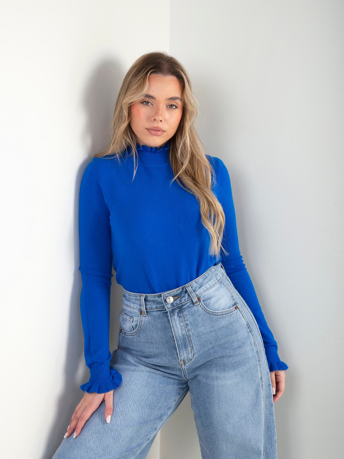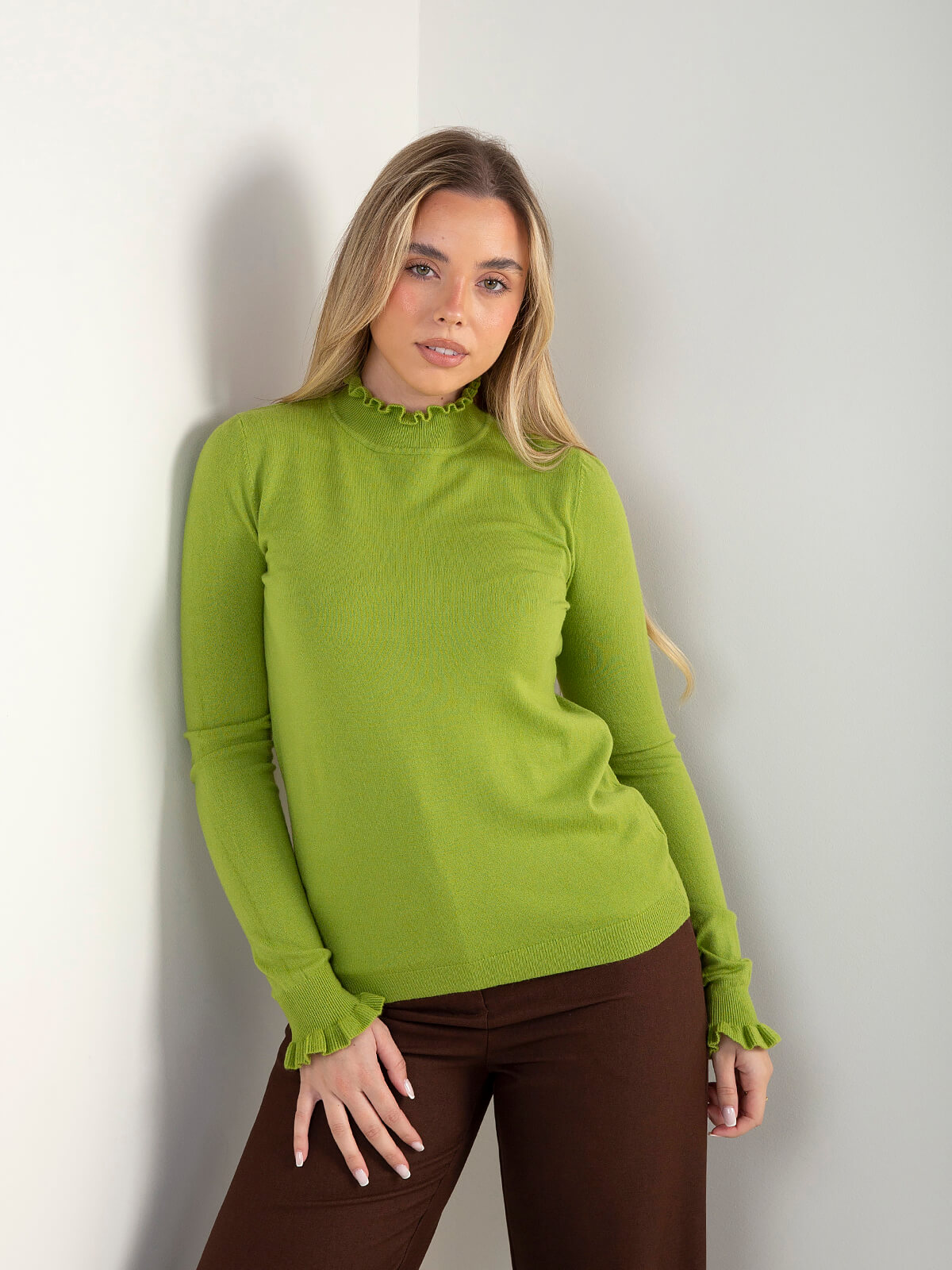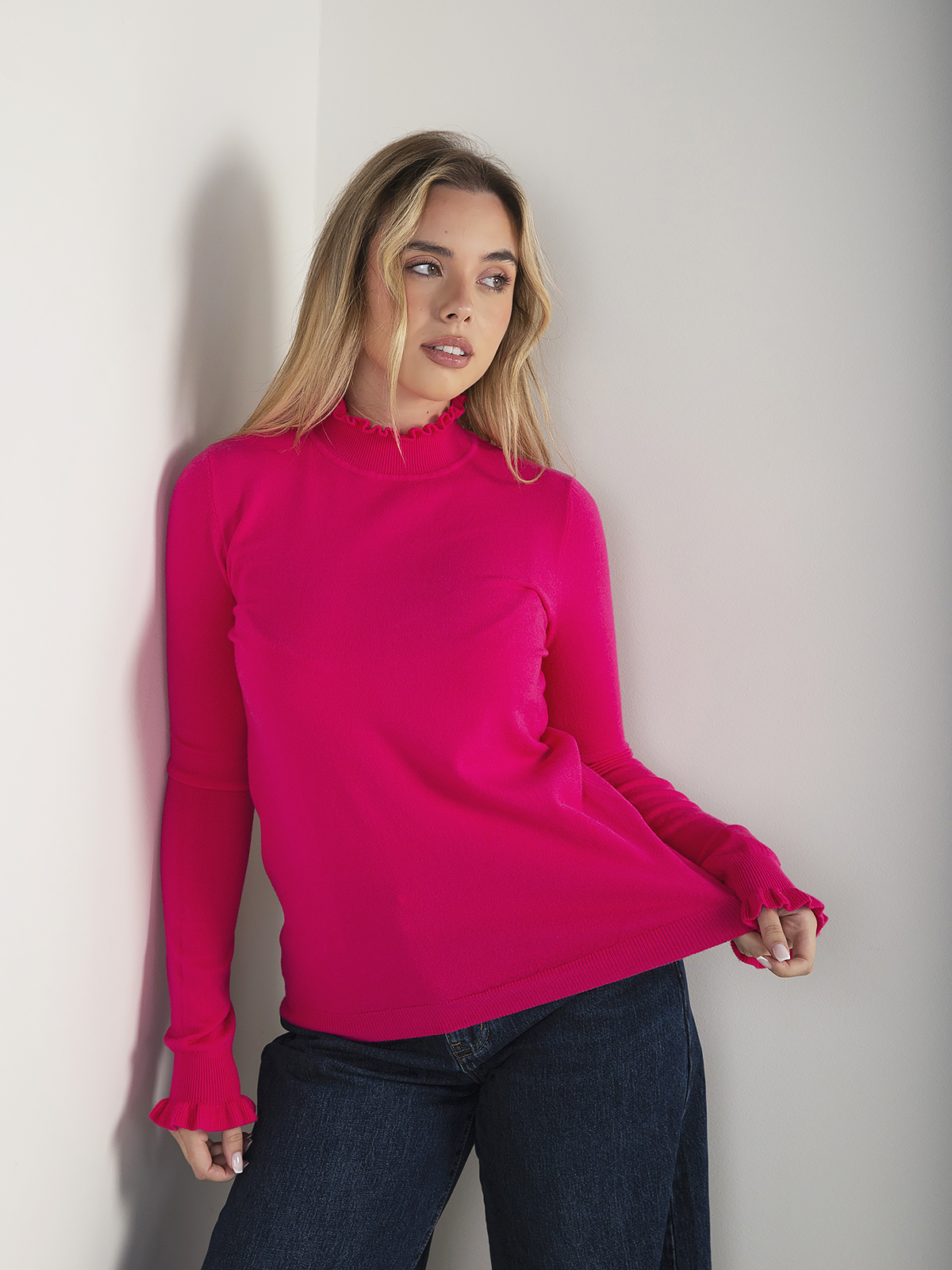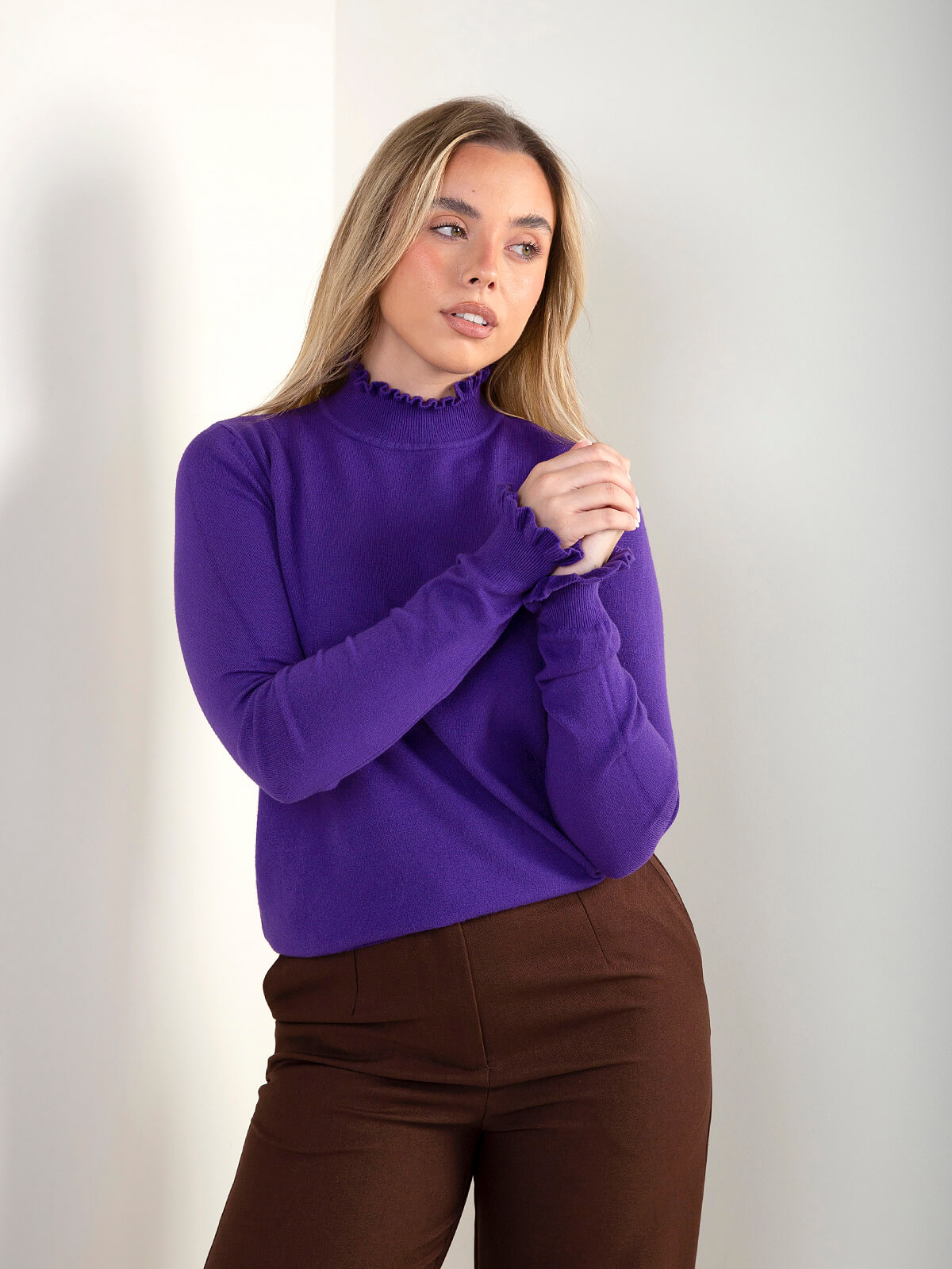 Camisola de malha fina com detalhe de folhos na gola perkins e nos punhos. Modelo leve, confortável ideal para looks simples e elegantes.Camisola malha com detalhe de folhos