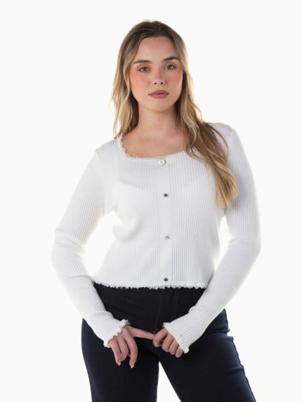 Camisola de malha canelada com detalhes drapeados à frente e pérolas aplicadas. Camisola de manga comprida com punhos abotoados e decote coração.