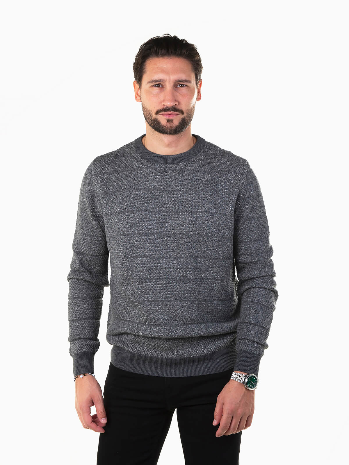 Camisola de malha com estrutura e riscas, decote redondo e acabamentos canelados. Um modelo confortável e moderno, perfeito para a nova temporada. Combina com jeans ou calças chino para um look casual e atual.