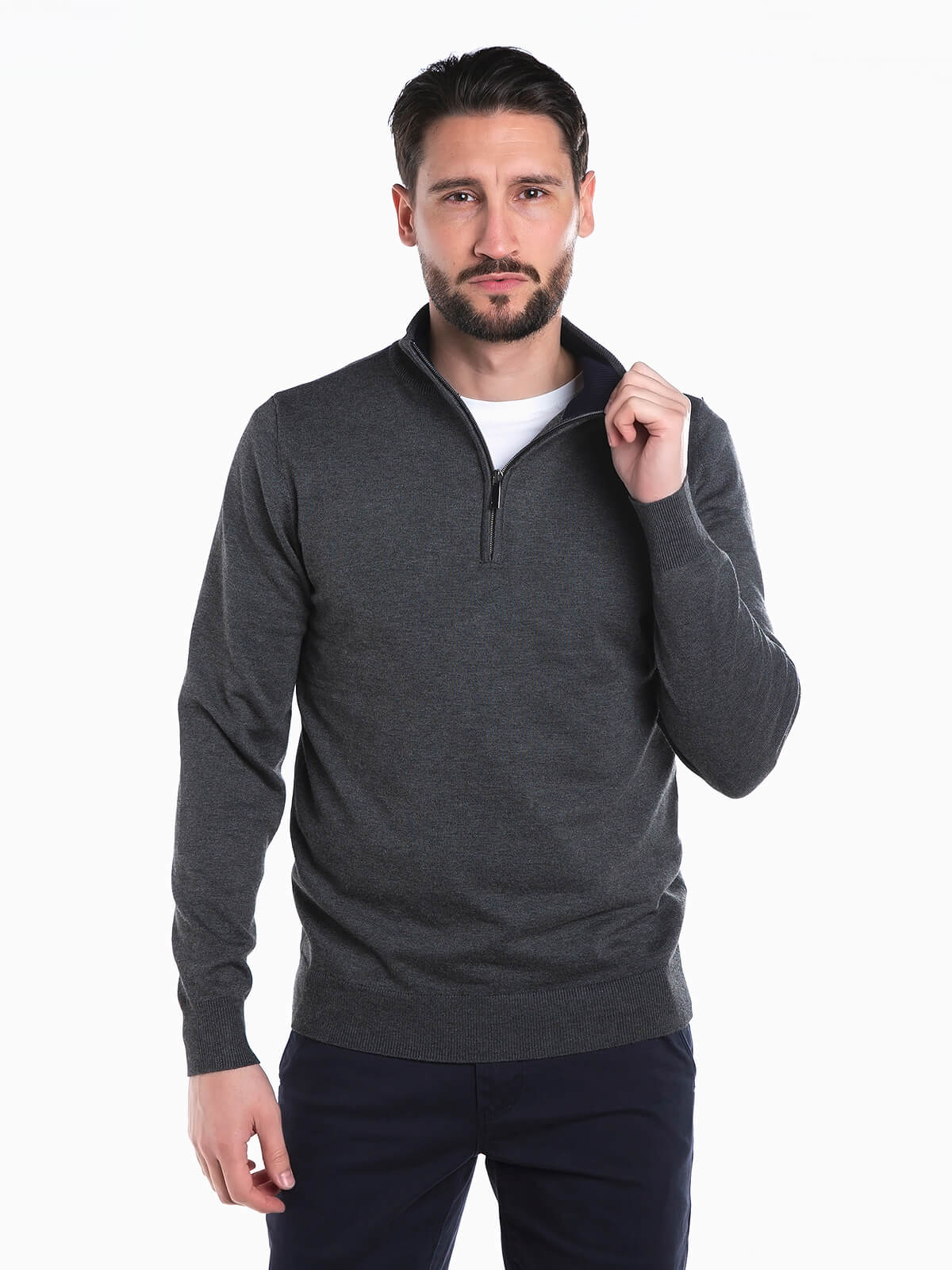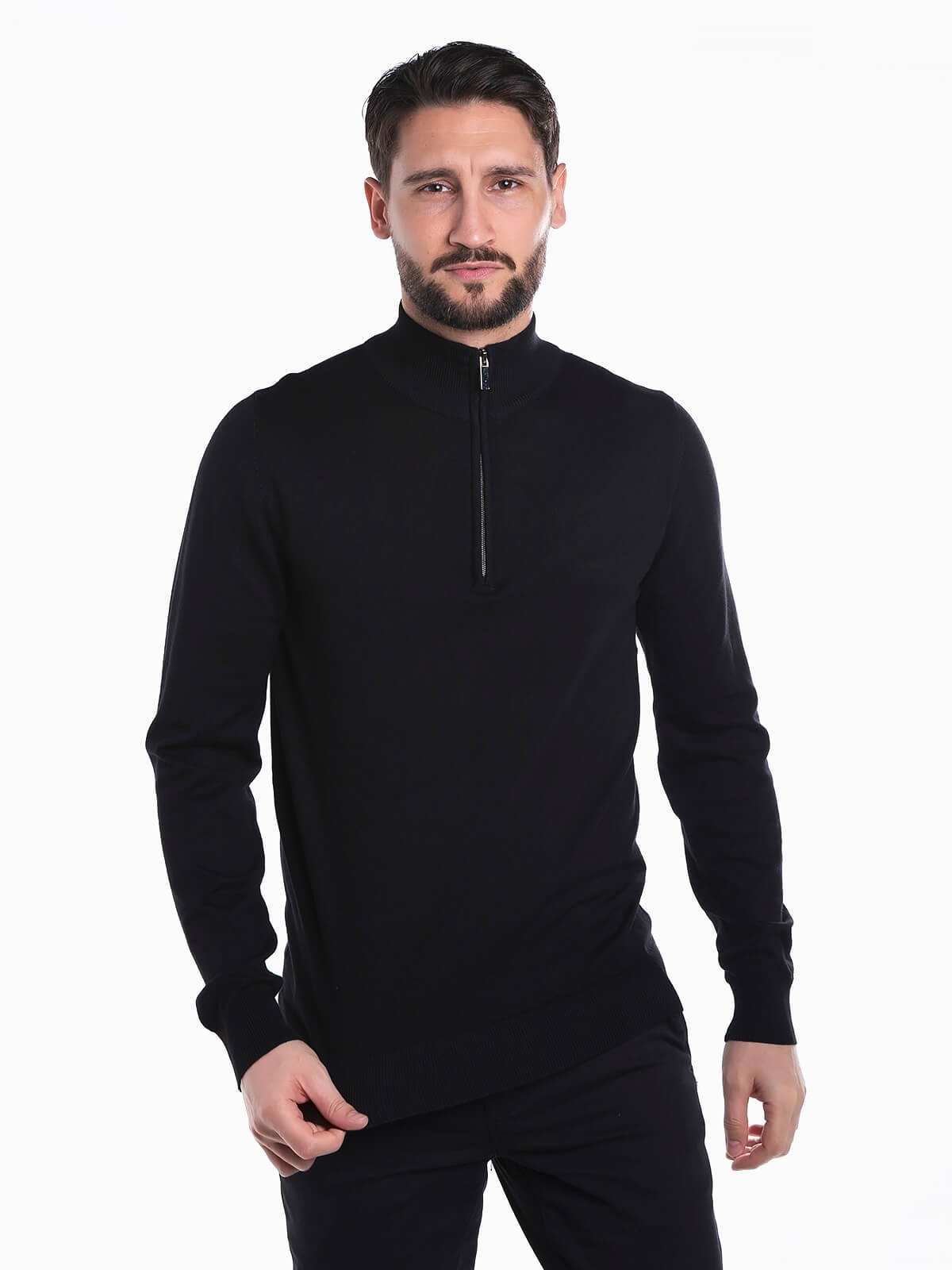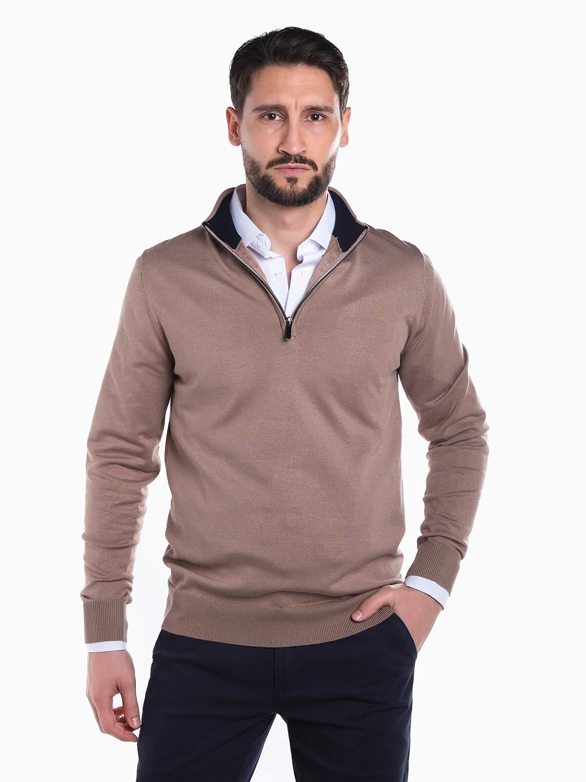 Camisola malha com gola subida e fecho éclair. Camisola em mistura de viscose. Manga comprida. Acabamentos em nervuras.