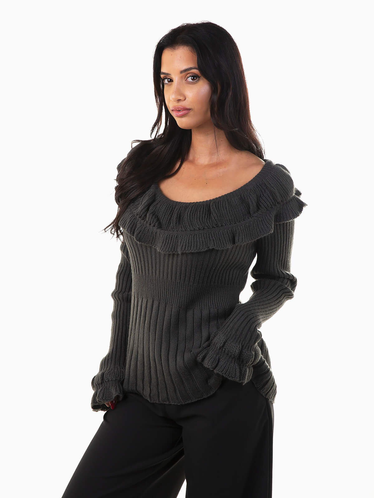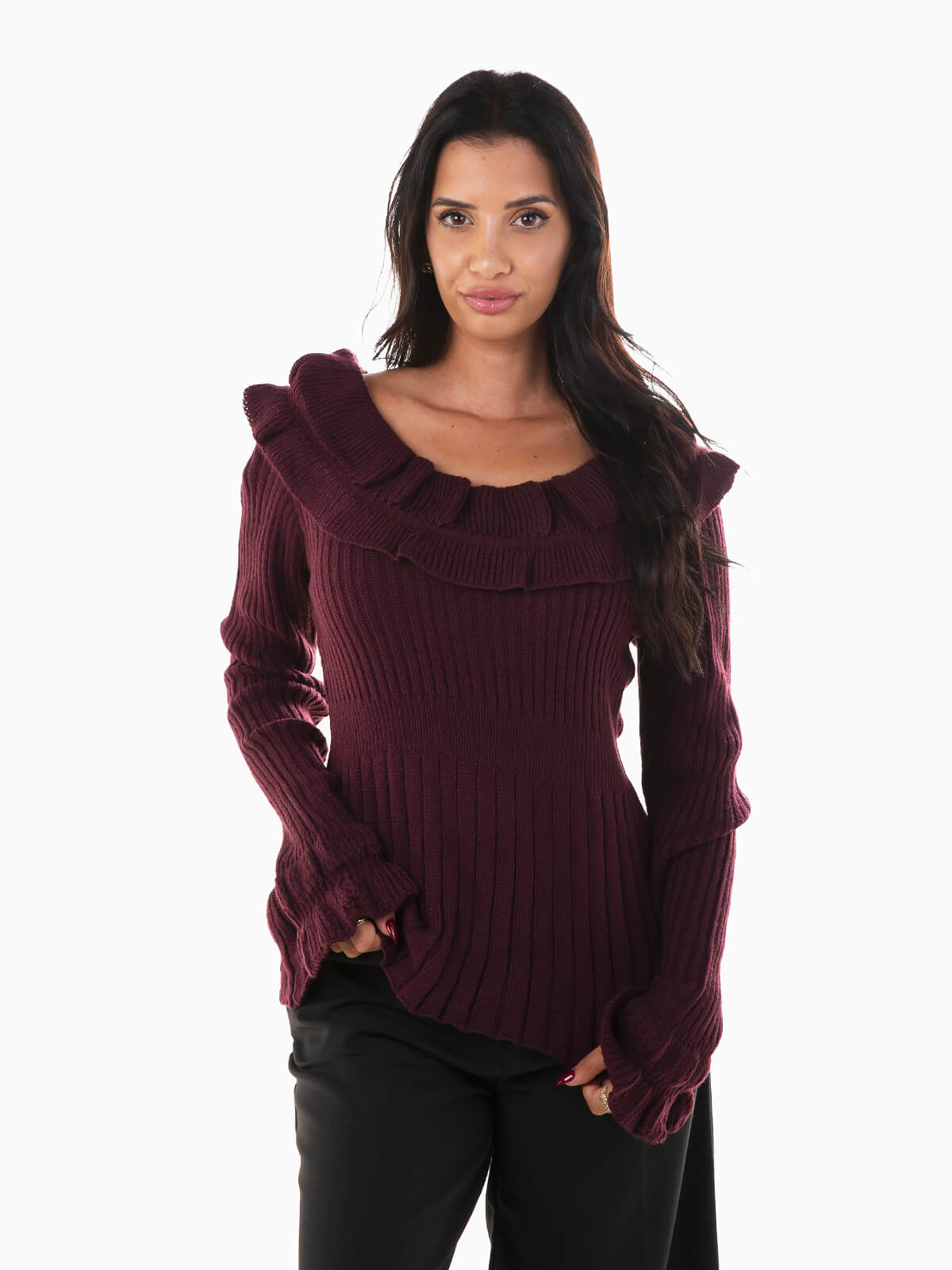 Camisola malha canelada com encaixe de folhos. Camisola cintada de manga comprida com decote barco.