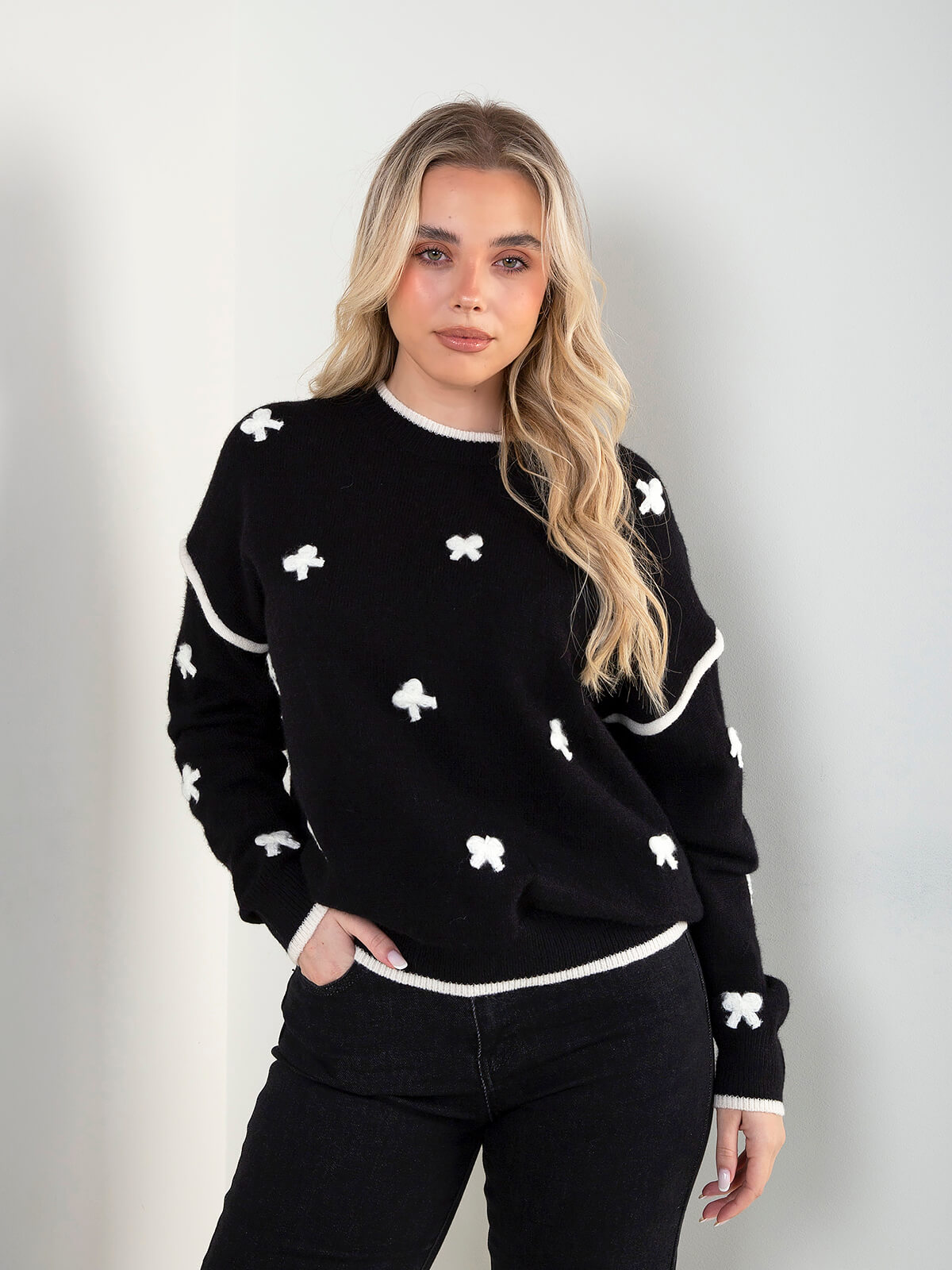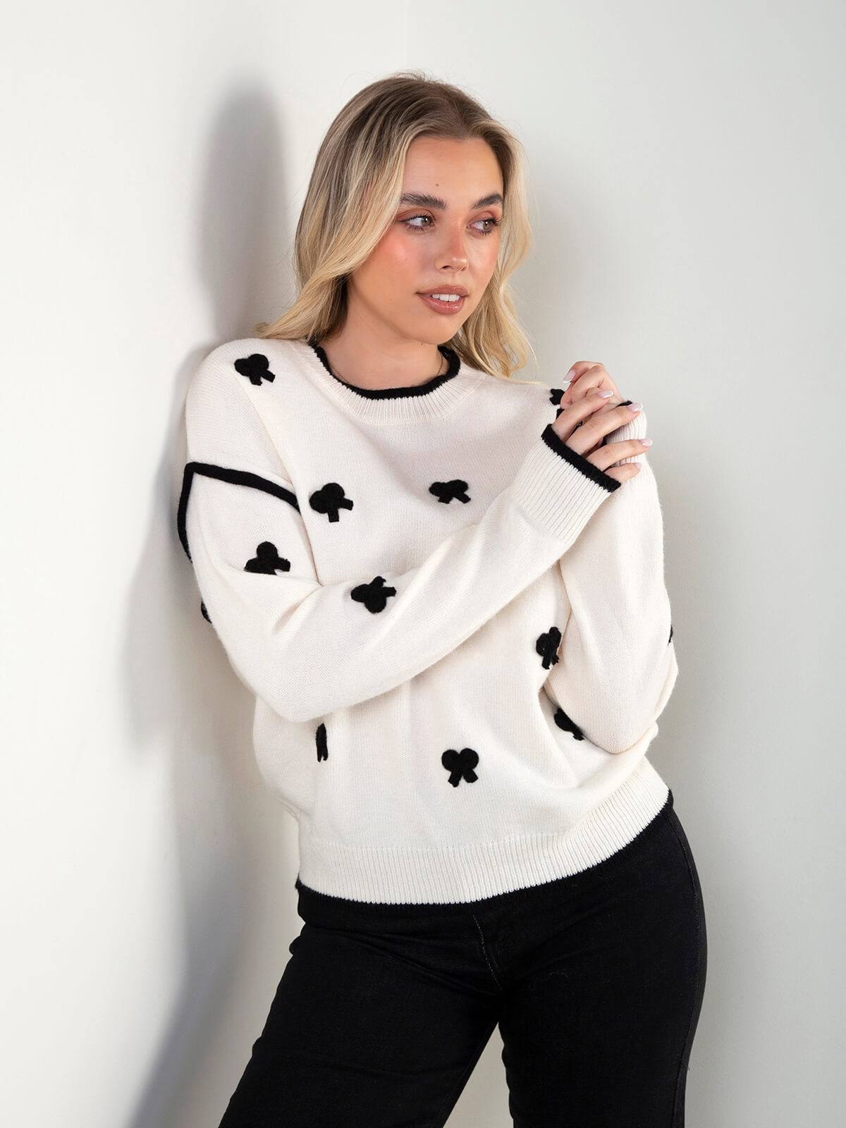 Camisola de malha com aplicações de laços em contraste e decote redondo. Modelo de manga comprida, com visual contemporâneo, ideal para looks urbanos e atuais.