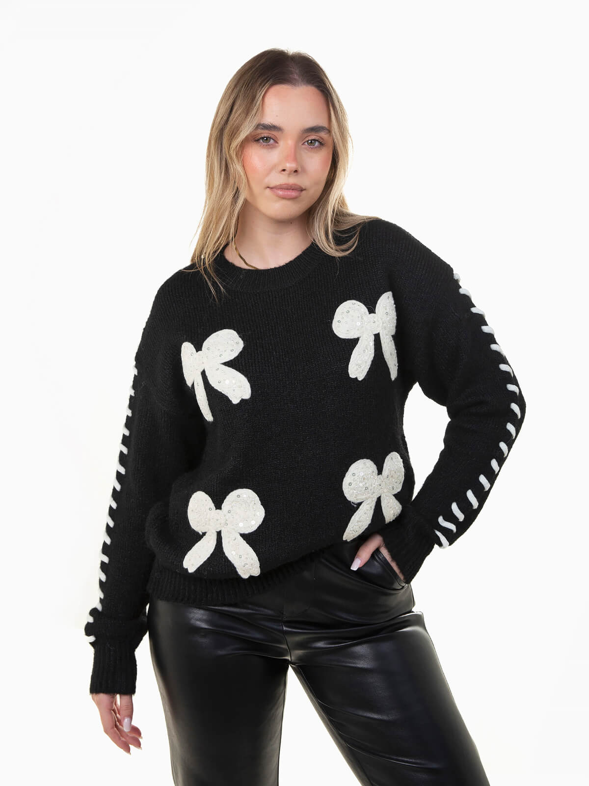 Camisola de malha com aplicação de laços em relevo e pequenos brilhos que dão um toque feminino e trendy. Mangas com detalhe entrelaçado. Confortável e perfeita para looks de inverno mais delicados.