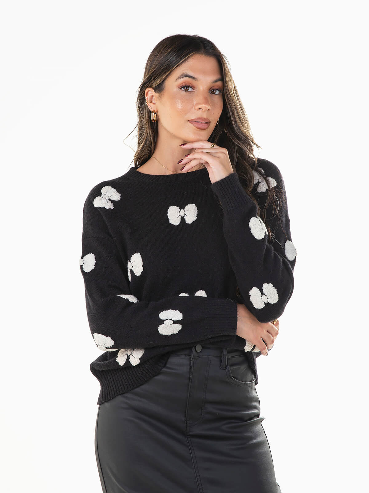 Camisola de malha com laços bordados em contraste. Camisola de manga comprida com decote redondo e acabamentos canelados.