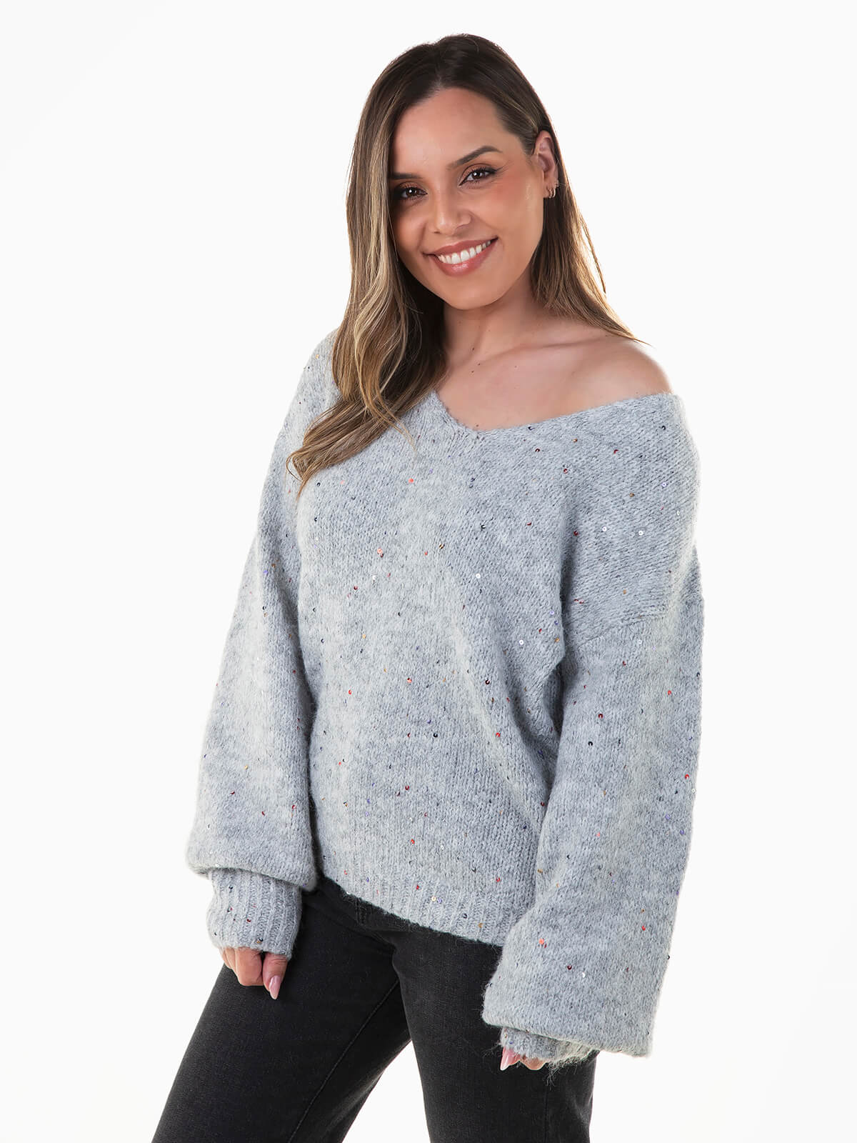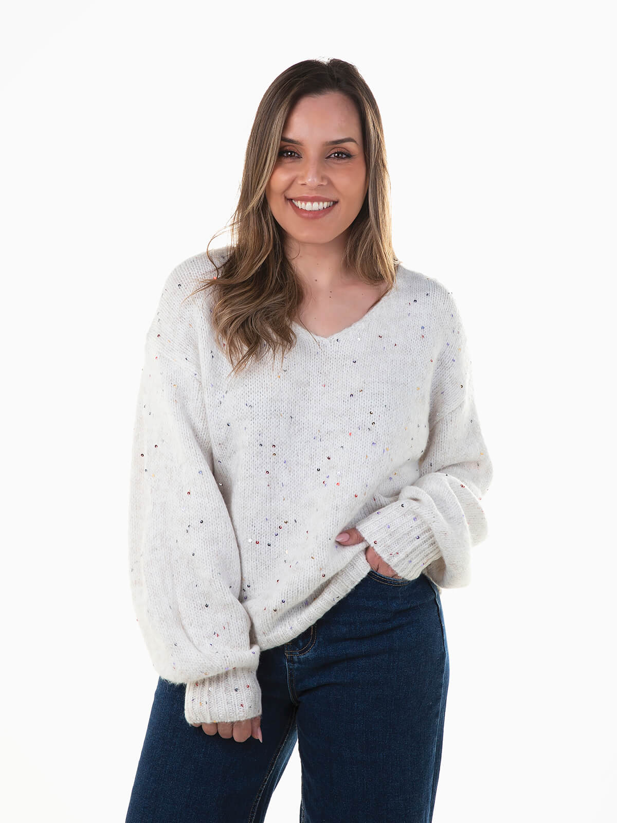 Camisola de malha com lantejoulas coloridas aplicadas. Camisola de manga comprida com acabamentos canelados. Decote em V. Ombros descaídos.
