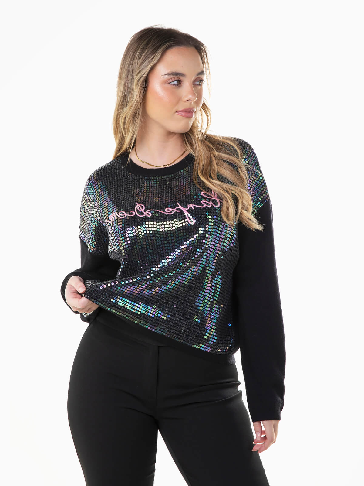 Camisola de malha com lantejoulas e pormenores bordados no peito. Camisola oversize de manga comprida com decote redondo. Acabamentos canelados.