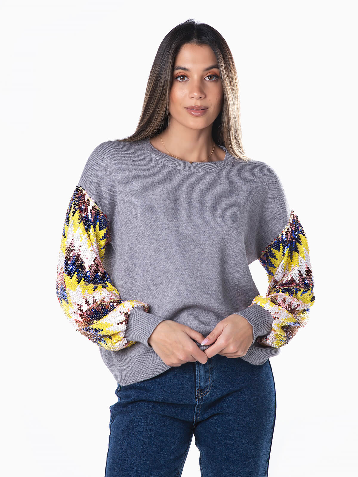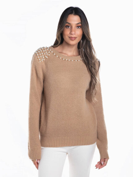 Camisola malha de manga comprida com lantejoulas coloridas. Camisola para senhora com decote redondo e acabamentos canelados.