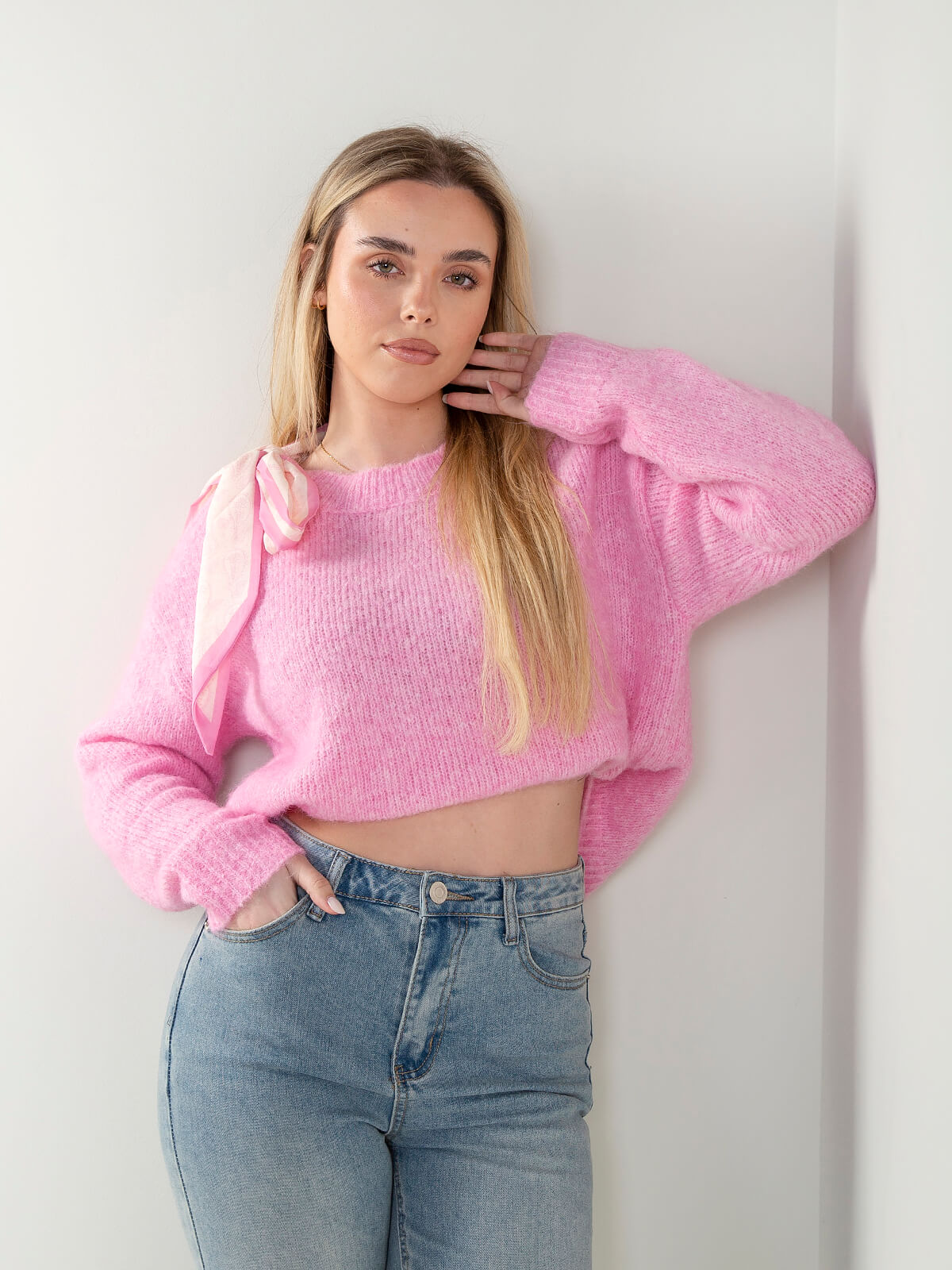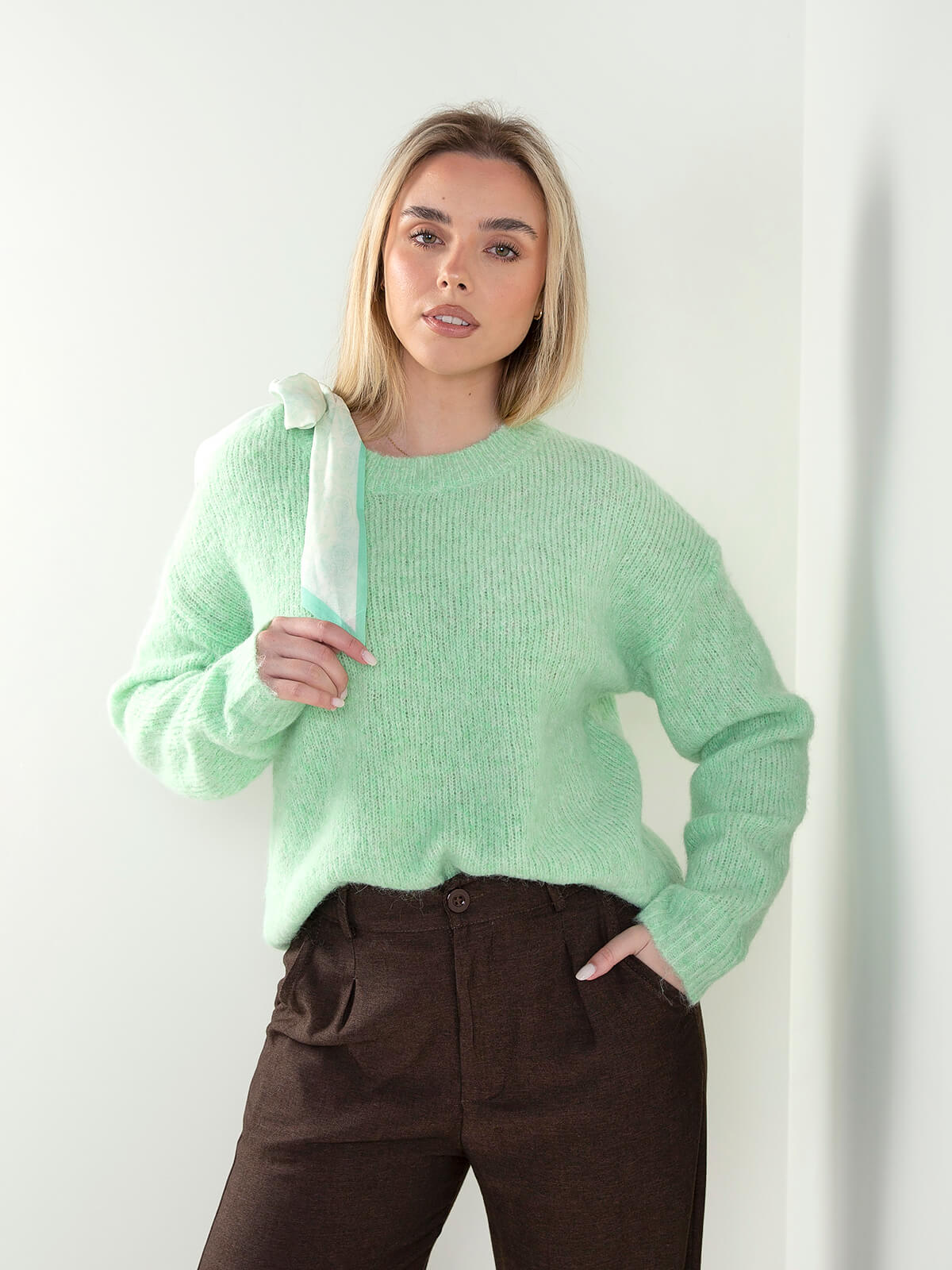 Camisola de malha com mistura de lã e decote redondo, acompanhada de lenço decorativo para um toque elegante e atual. Confortável e versátil, ideal para combinar com jeans mom fit, straight, wide leg ou calças de alfaiataria na meia estação.
