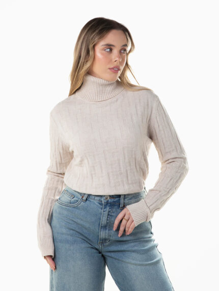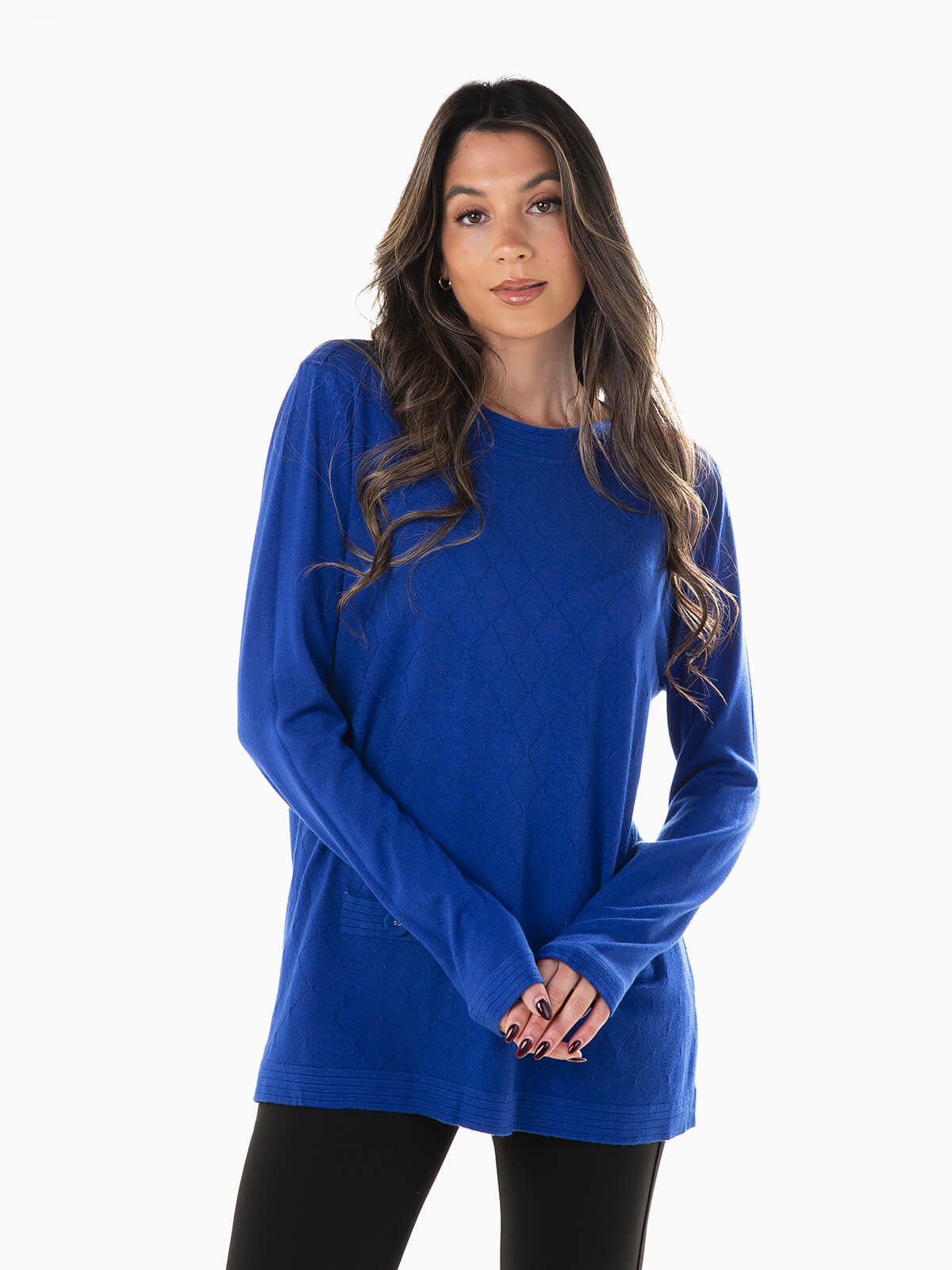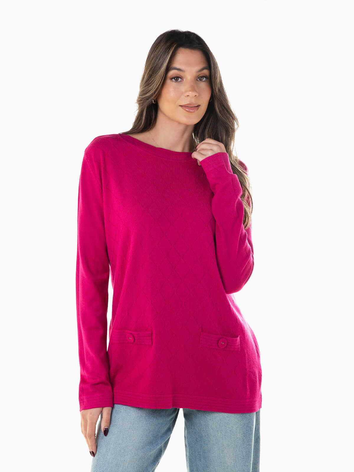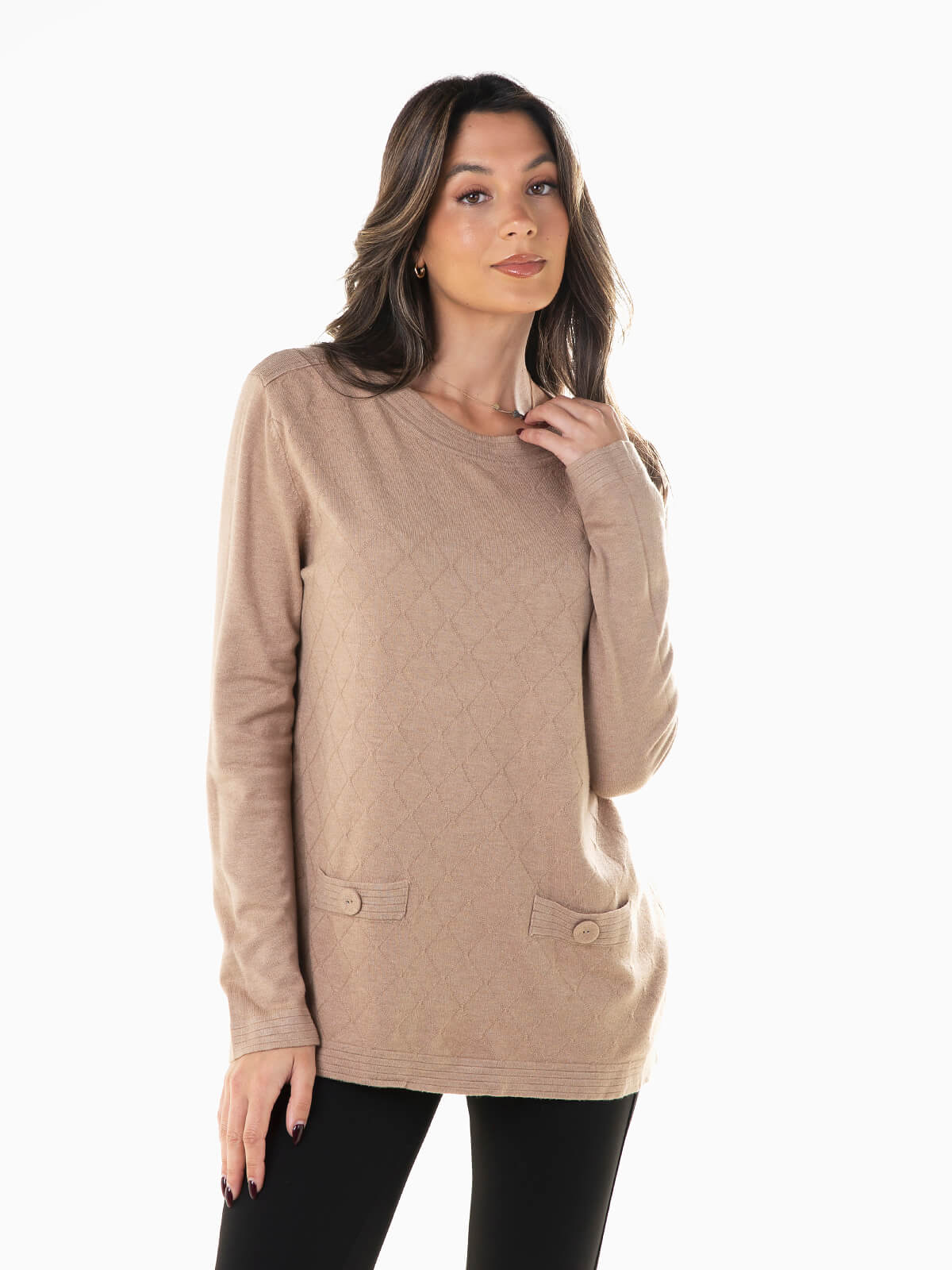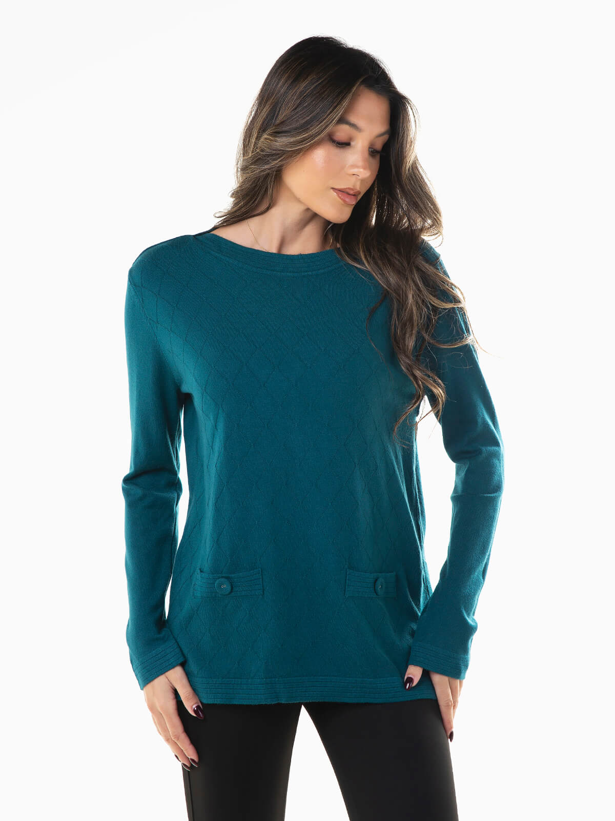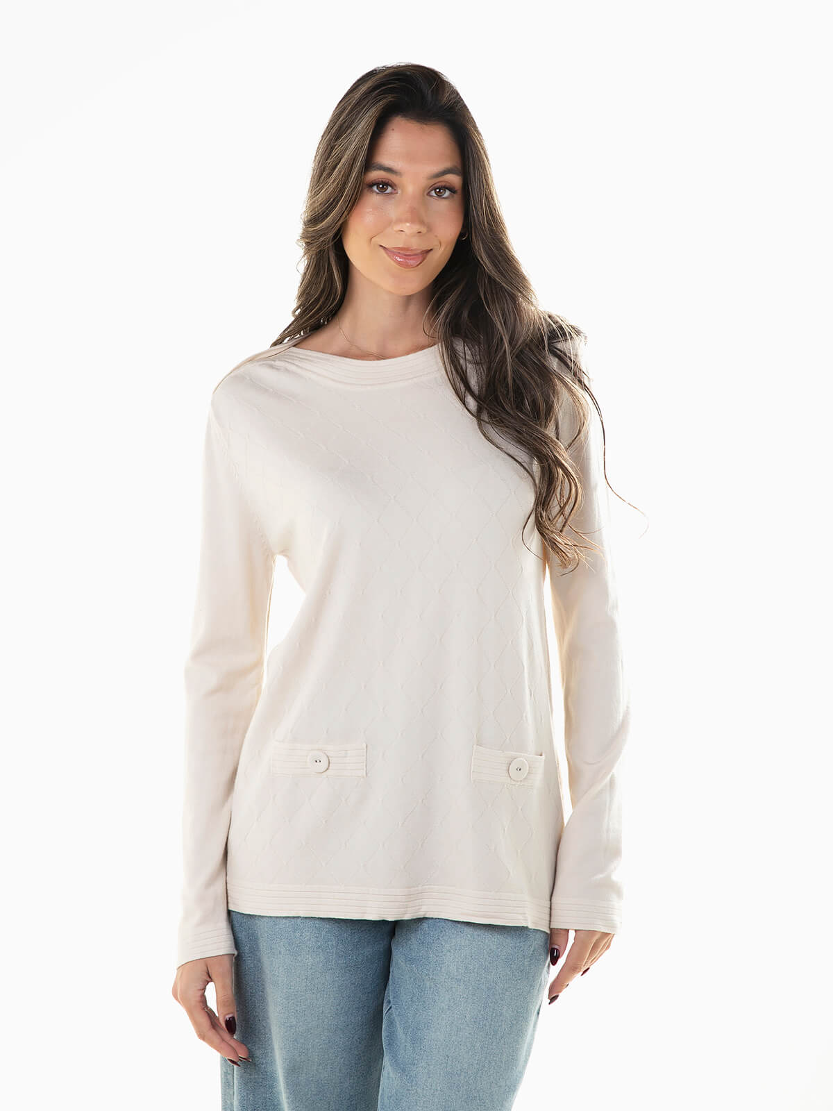 Camisola de malha com estrutura de losangos e bolsos decorativos à frente. Camisola de manga comprida com acabamentos canelagos e decote barco.