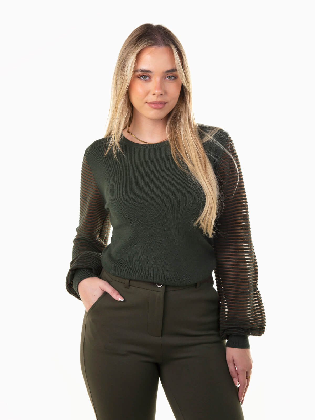 Camisola de malha com mangas de tule, detalhe riscado e punhos canelados. Um modelo feminino e cheio de estilo — combina com jeans ou calças de alfaiataria para um look atual e elegante. Disponível em várias cores.