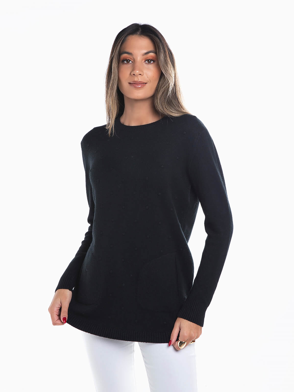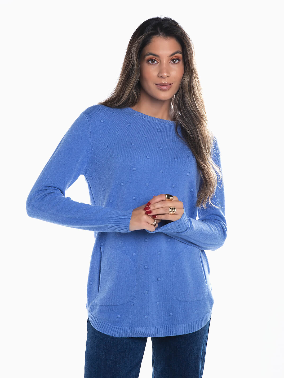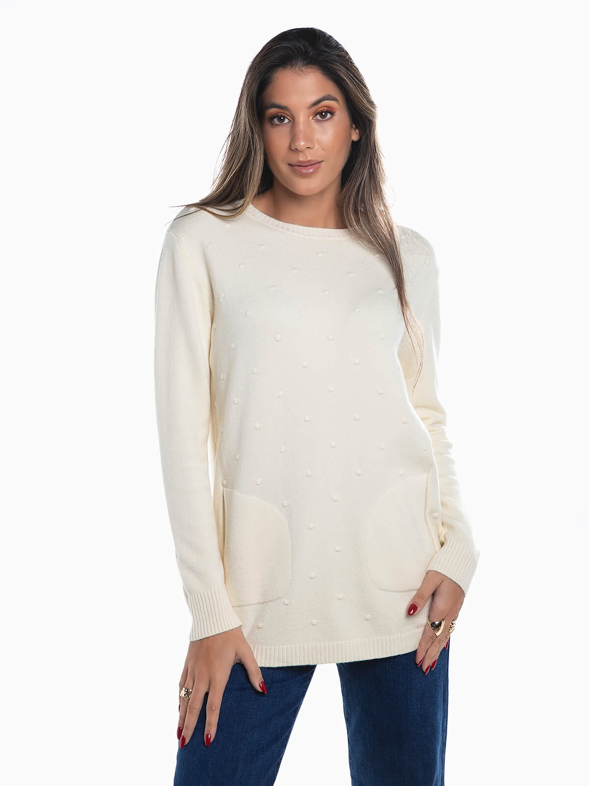 Camisola em malha com relevo para senhora. Camisola manga comprida com 2 bolsos à frente. Decote redondo e acabamentos canelados.