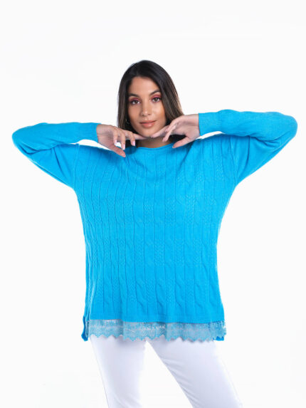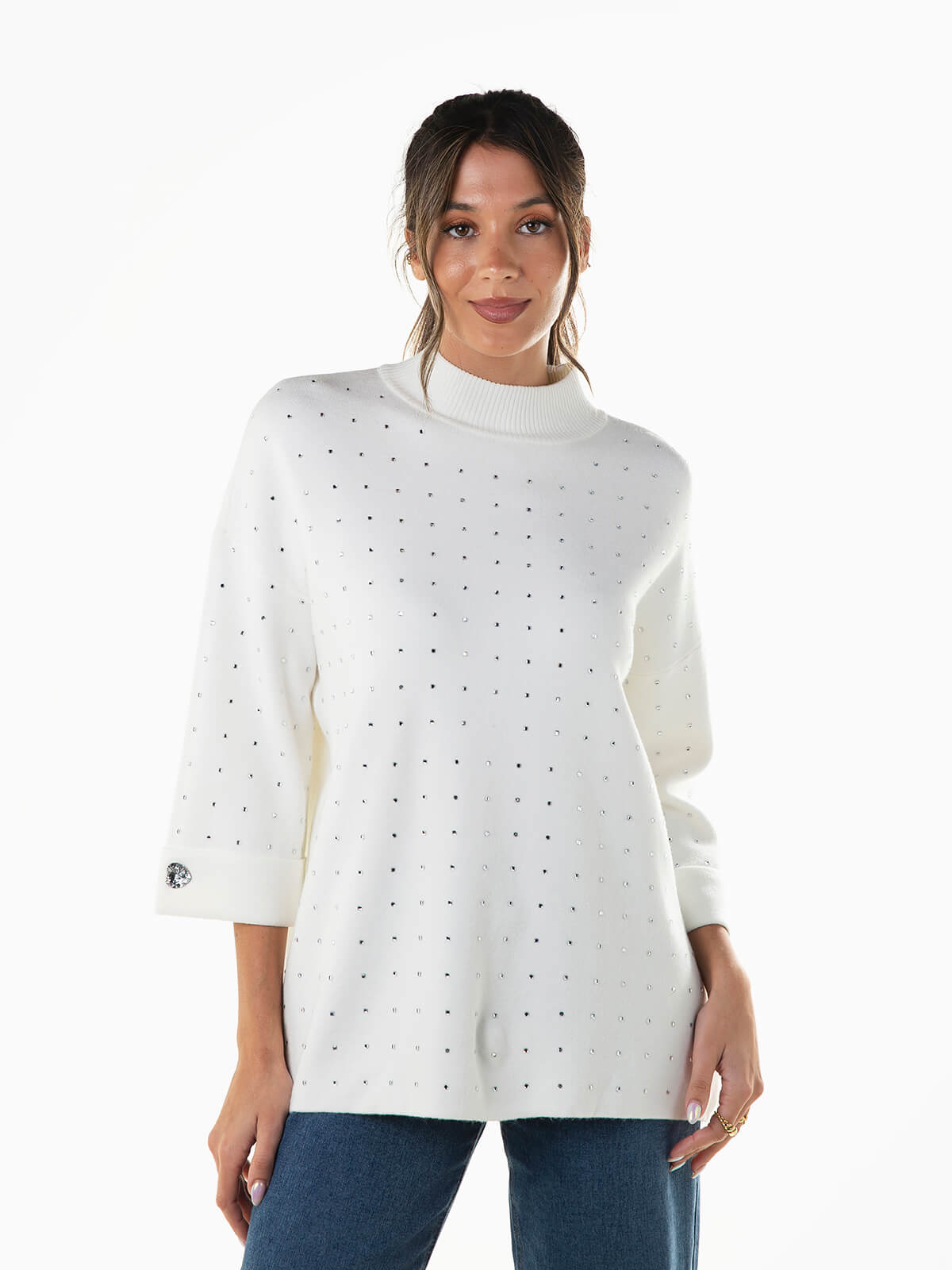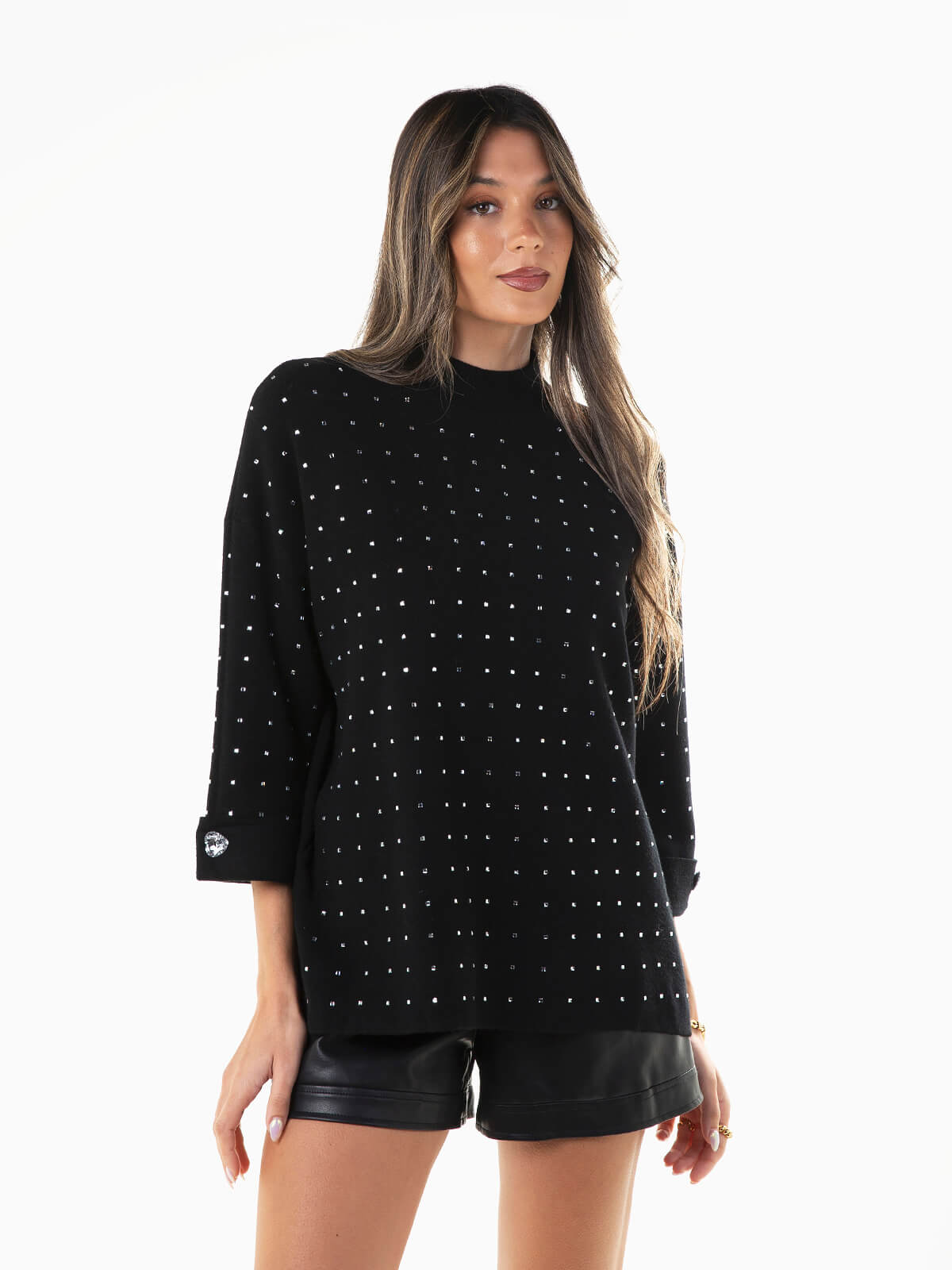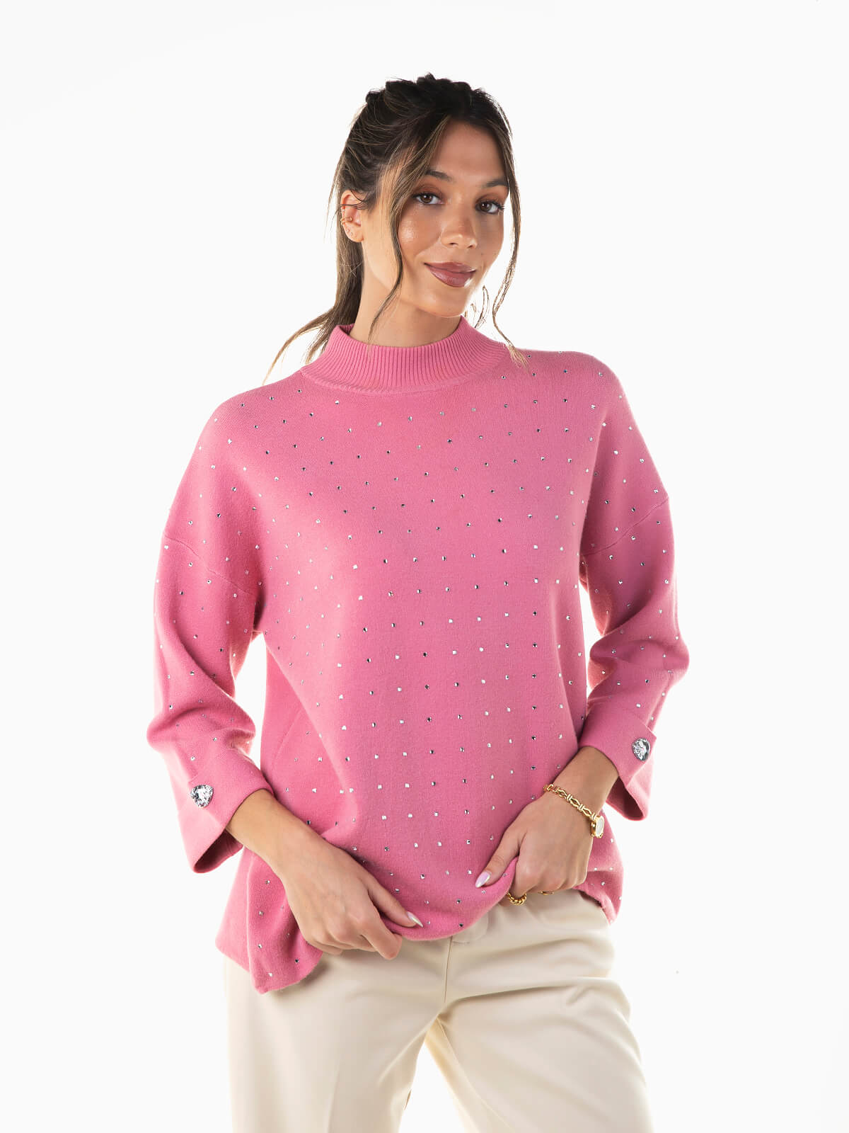 Camisola de malha com strass e mangas 3/4 para senhora. Camisola com gola perkins e coração brilhante aplicado no punho.