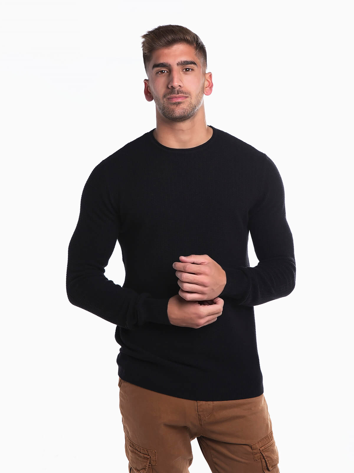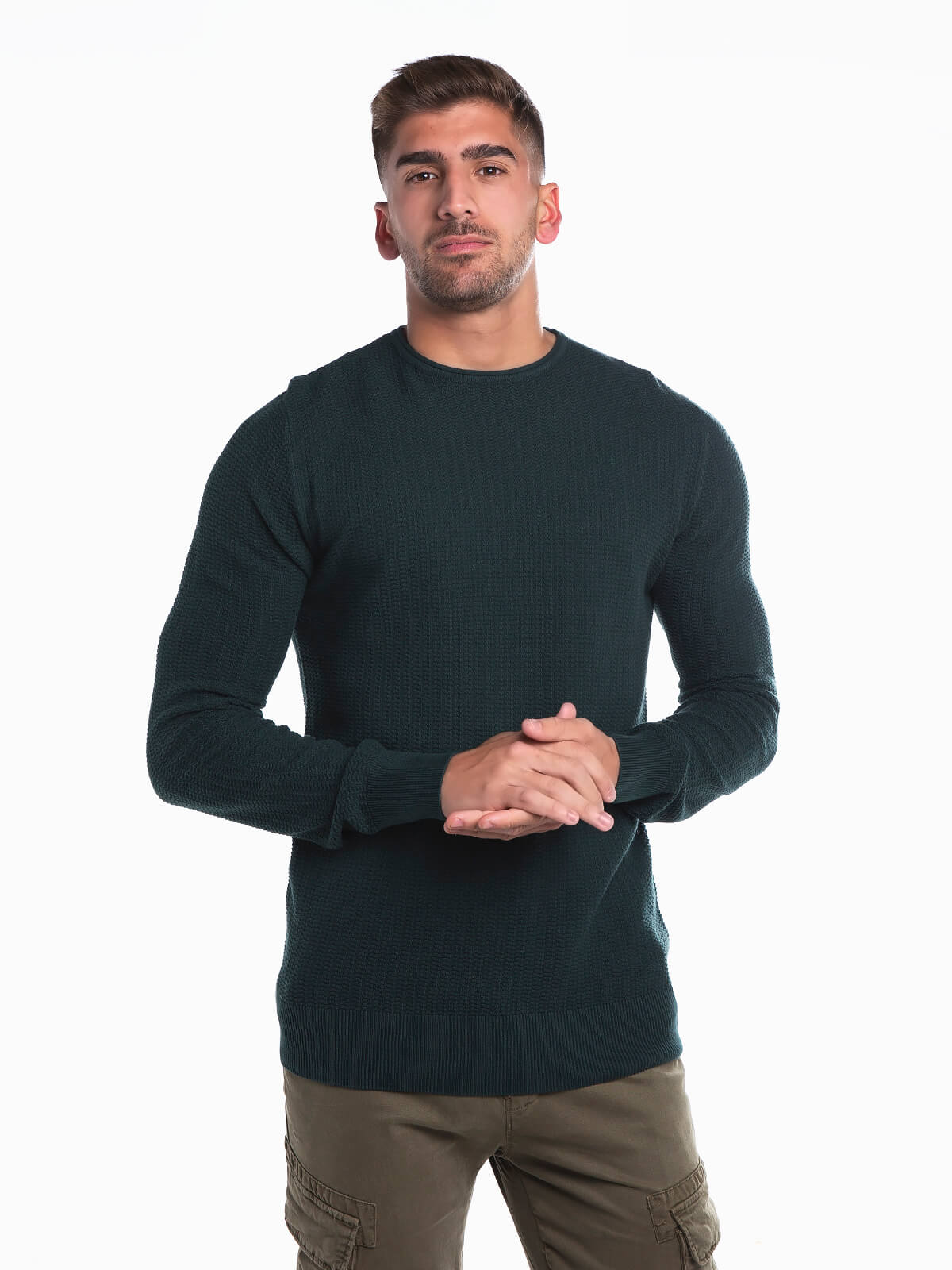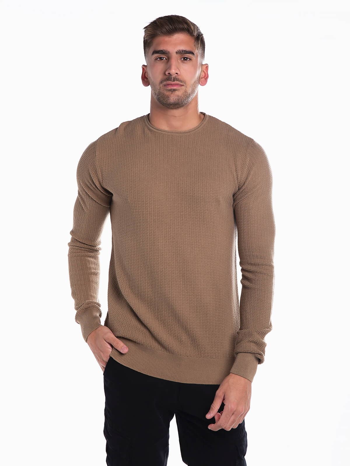 Camisola de malha com textura para homem. Camisola manga comprida 100% algodão com decote redondo e acabamentos canelados.