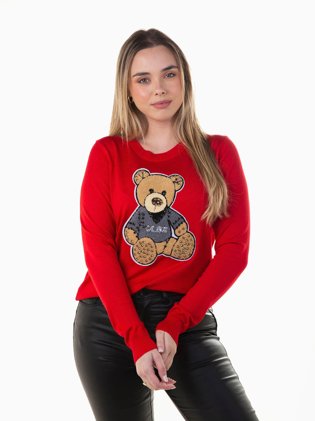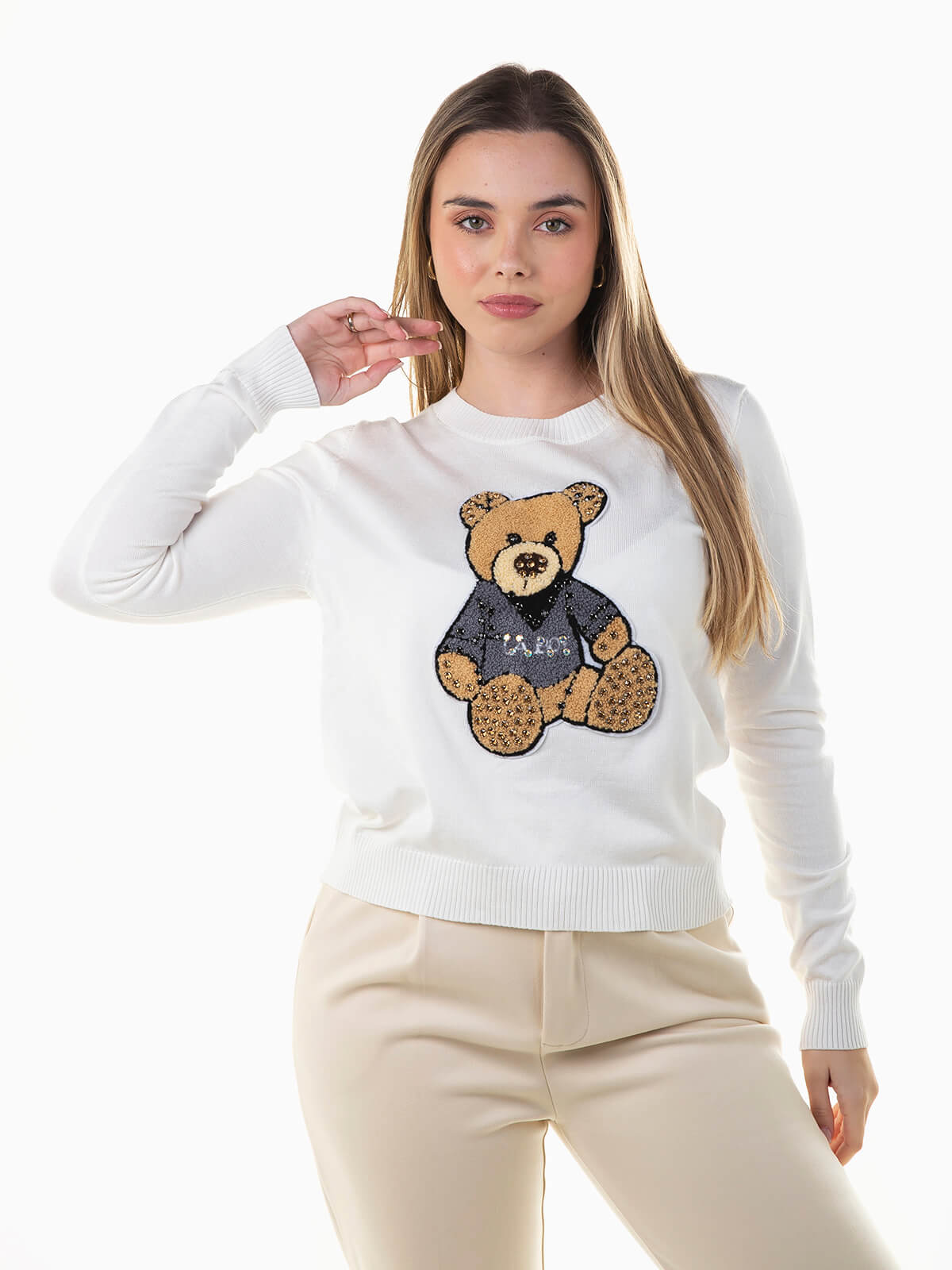 Camisola de malha para mulher com urso bordado e brilhos aplicados. Camisola de manga comprida com decote redondo e acabamentos canelados.