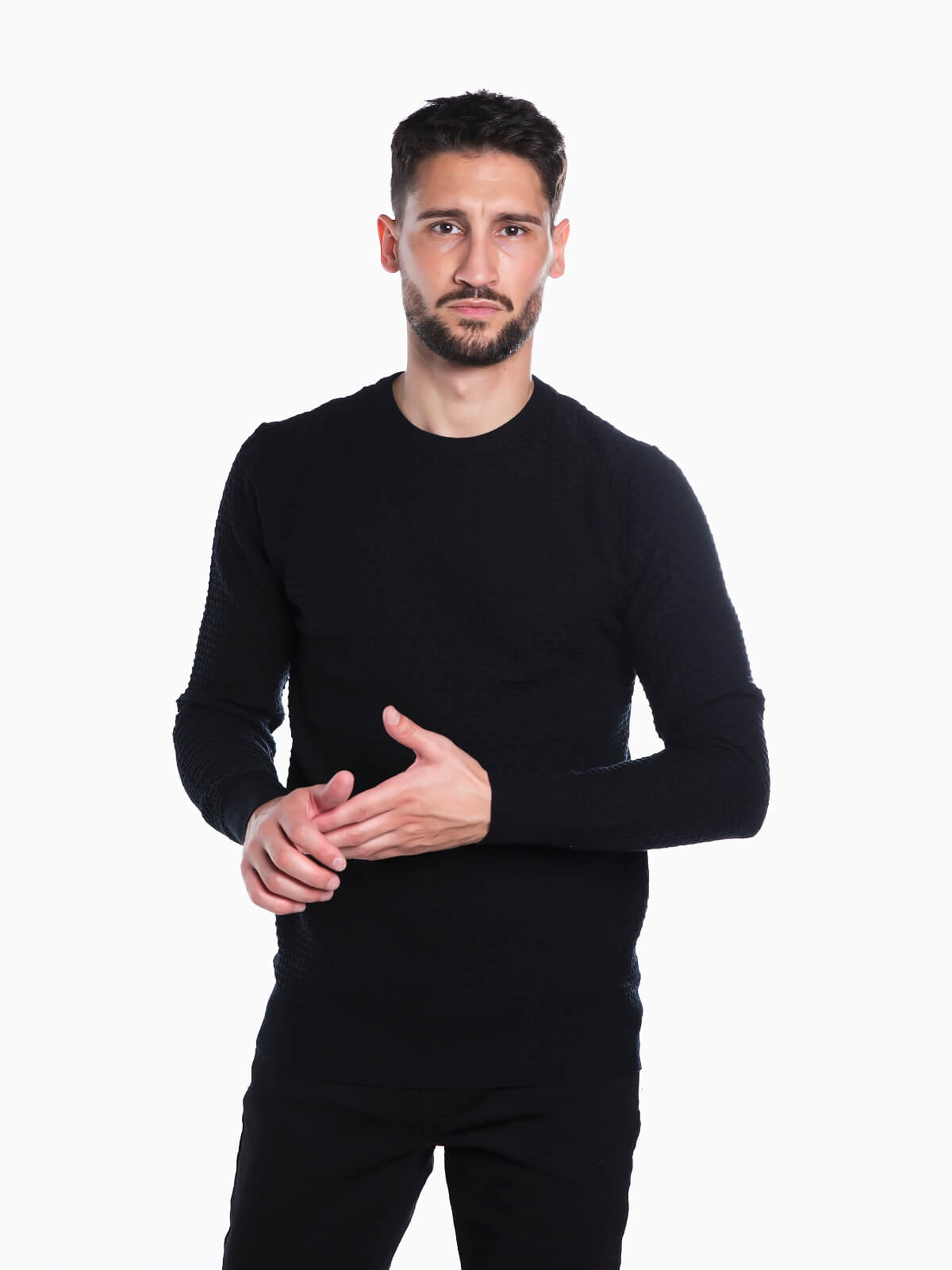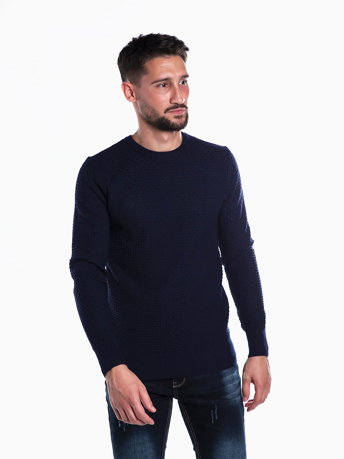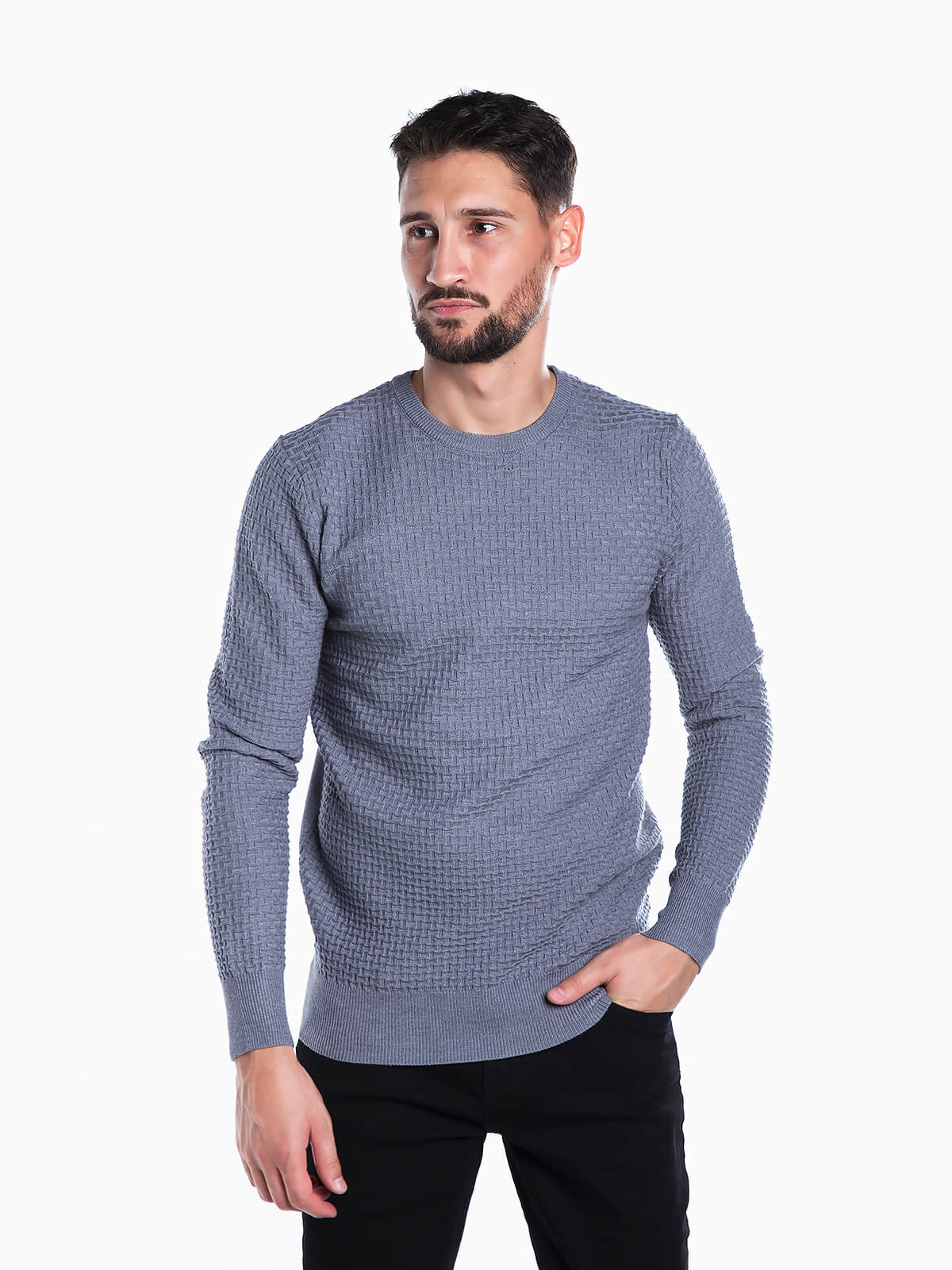 Camisola de malha combinada. Camisola malha homem manga comprida. Gola redonda.