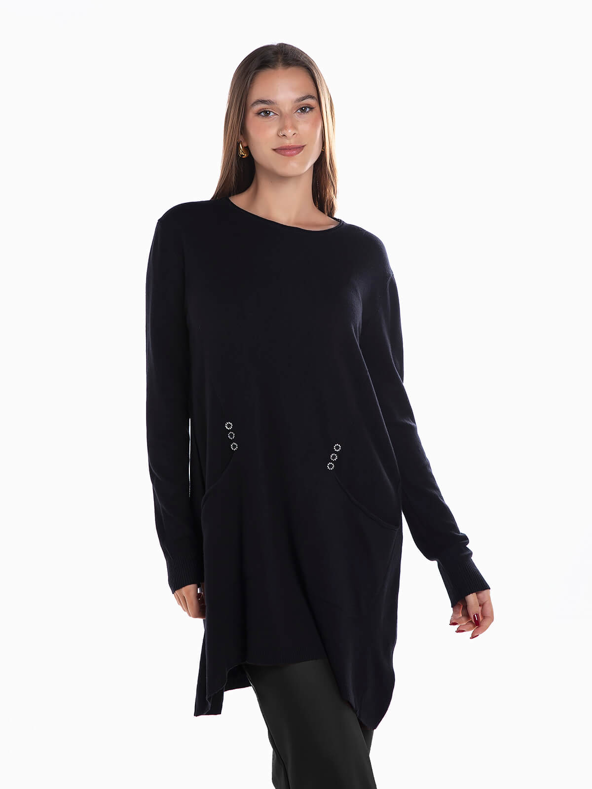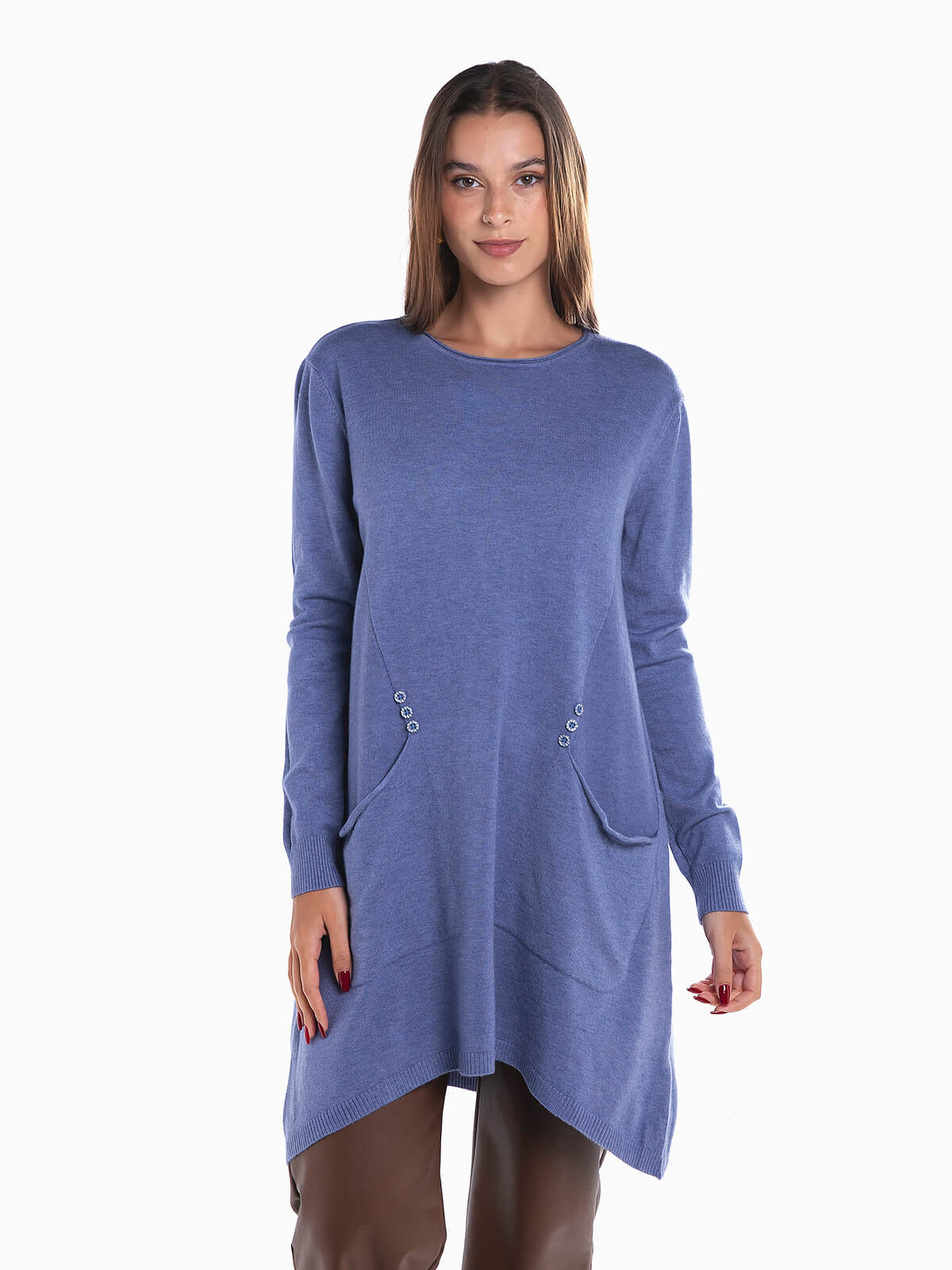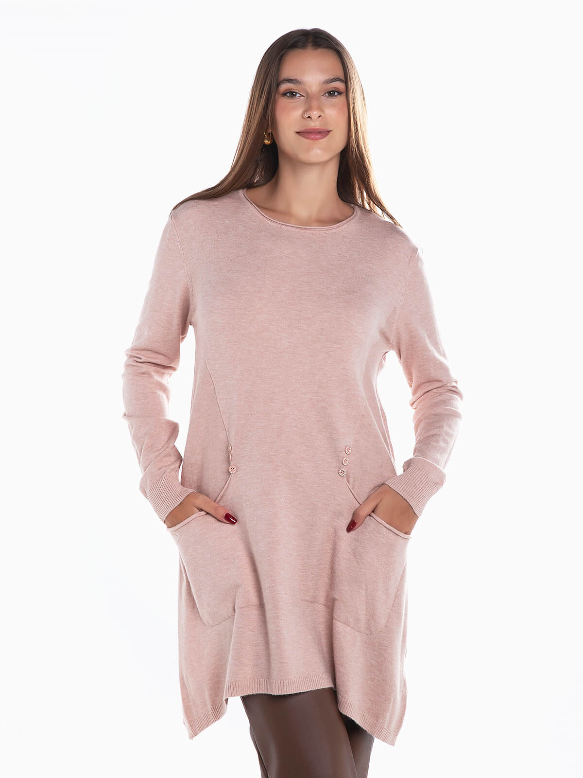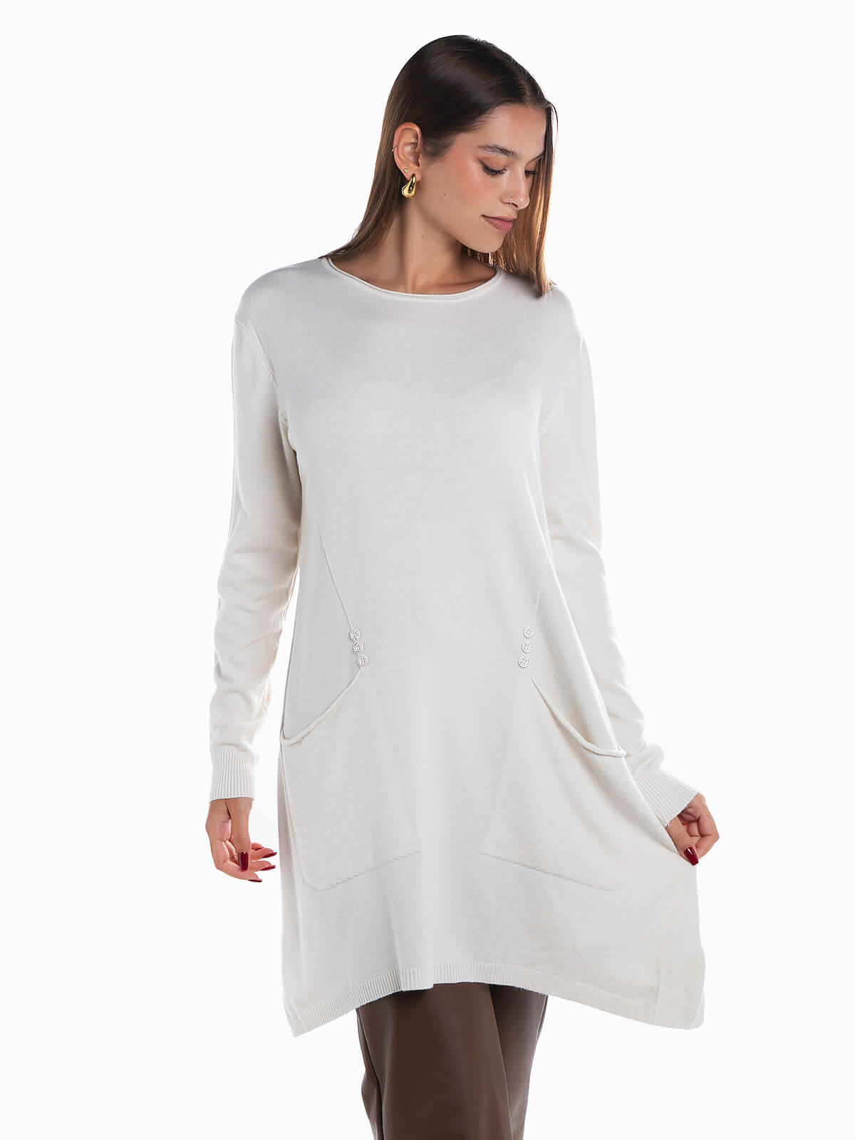 Camisola comprida em malha com mistura viscose para senhora. Camisola manga comprida com 2 bolsos e botões decorativos. Decote redondo.
