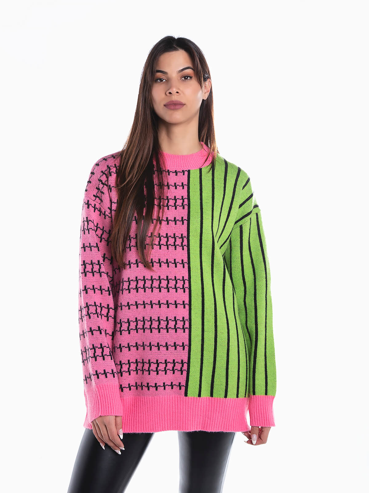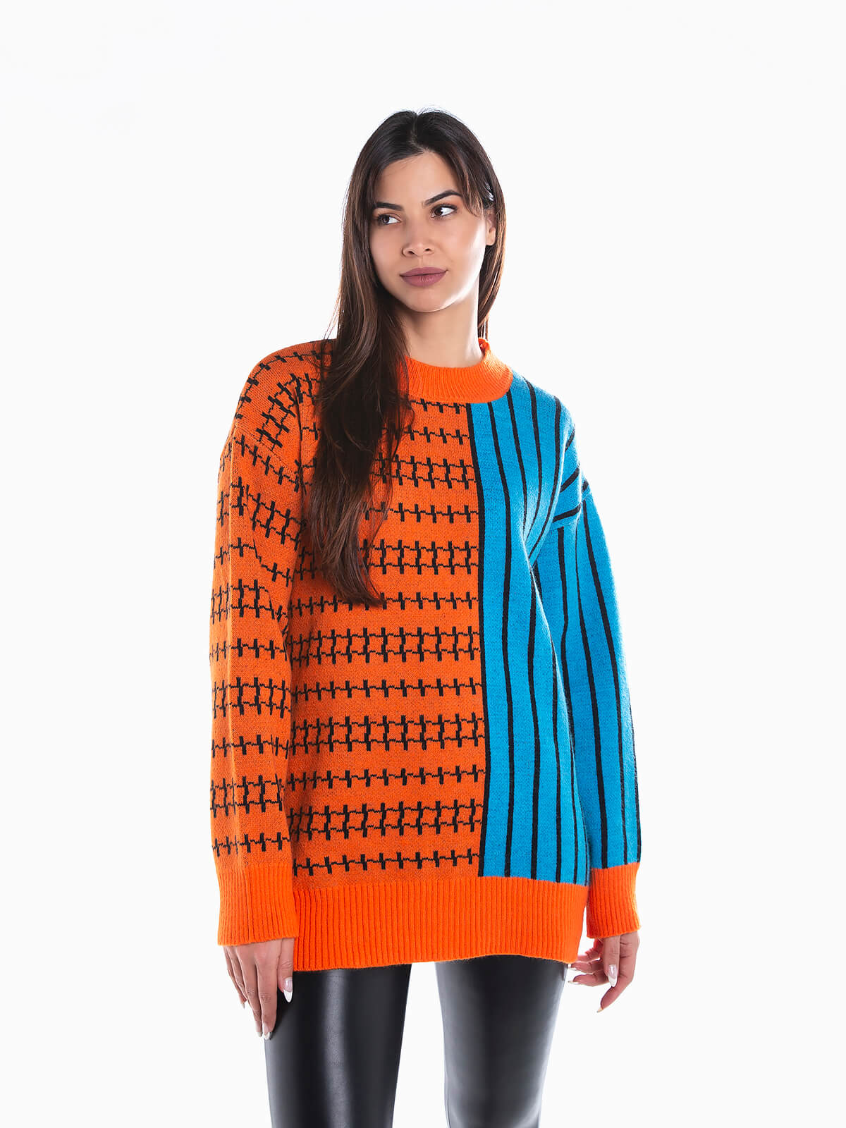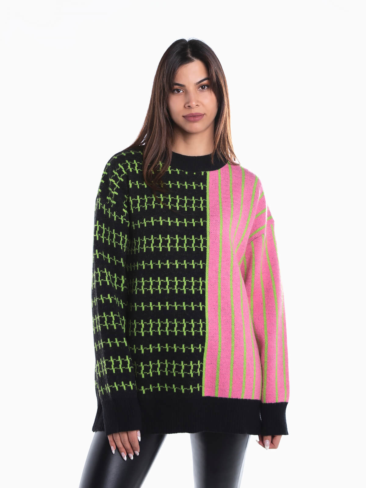 Camisola malha comprida com padrões abstratos. Camisola de manga comprida larga e ombros descaídos. Decote redondo. Acabamentos canelados.
