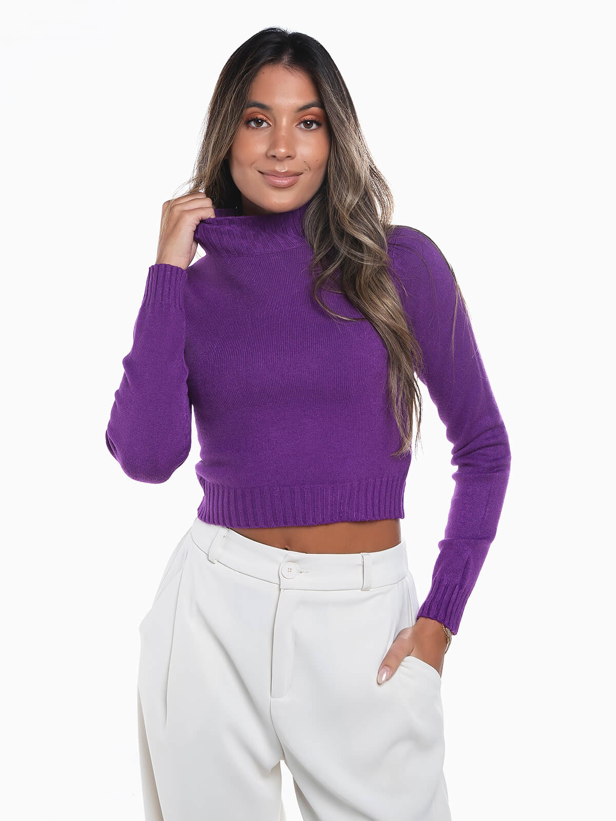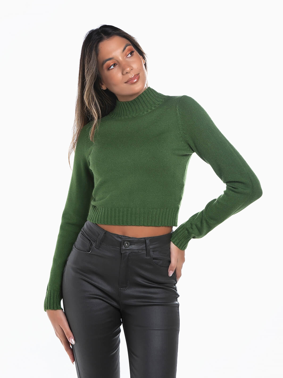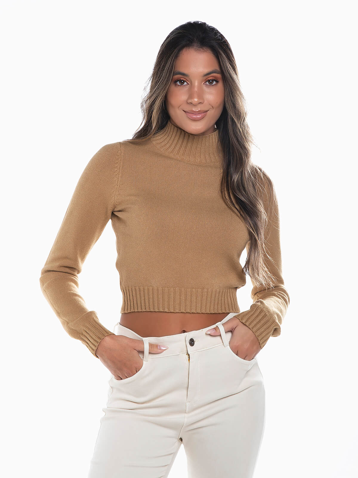 Camisola cropped em malha com mistura de viscose. Camisola de manga comprida com gola subida e acabamentos canelados.
