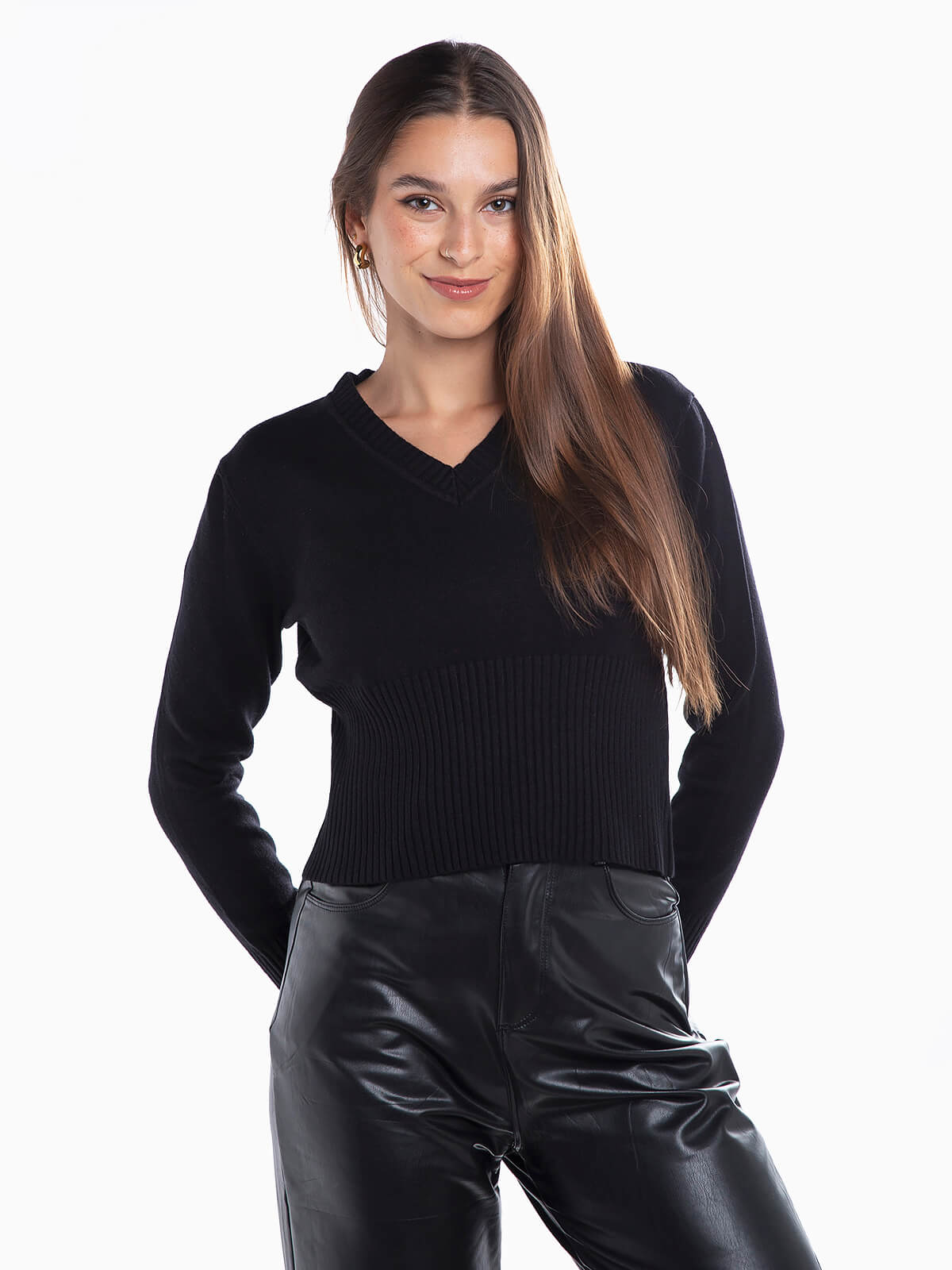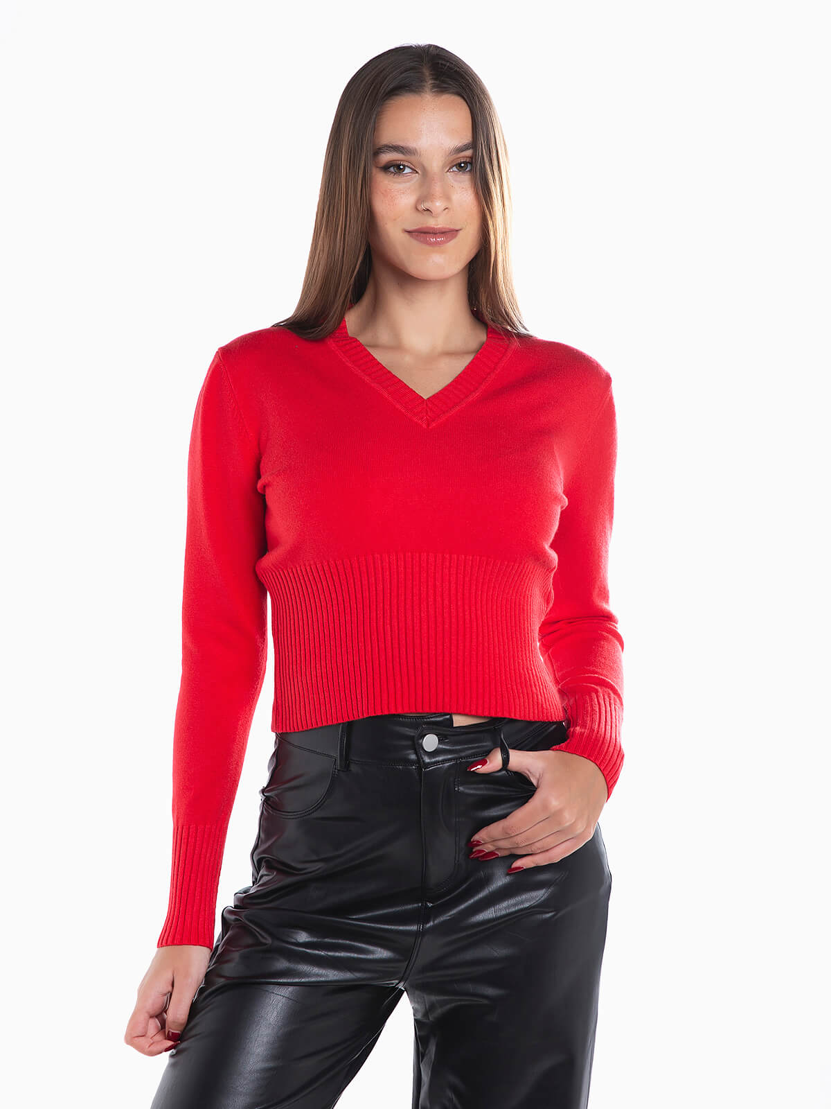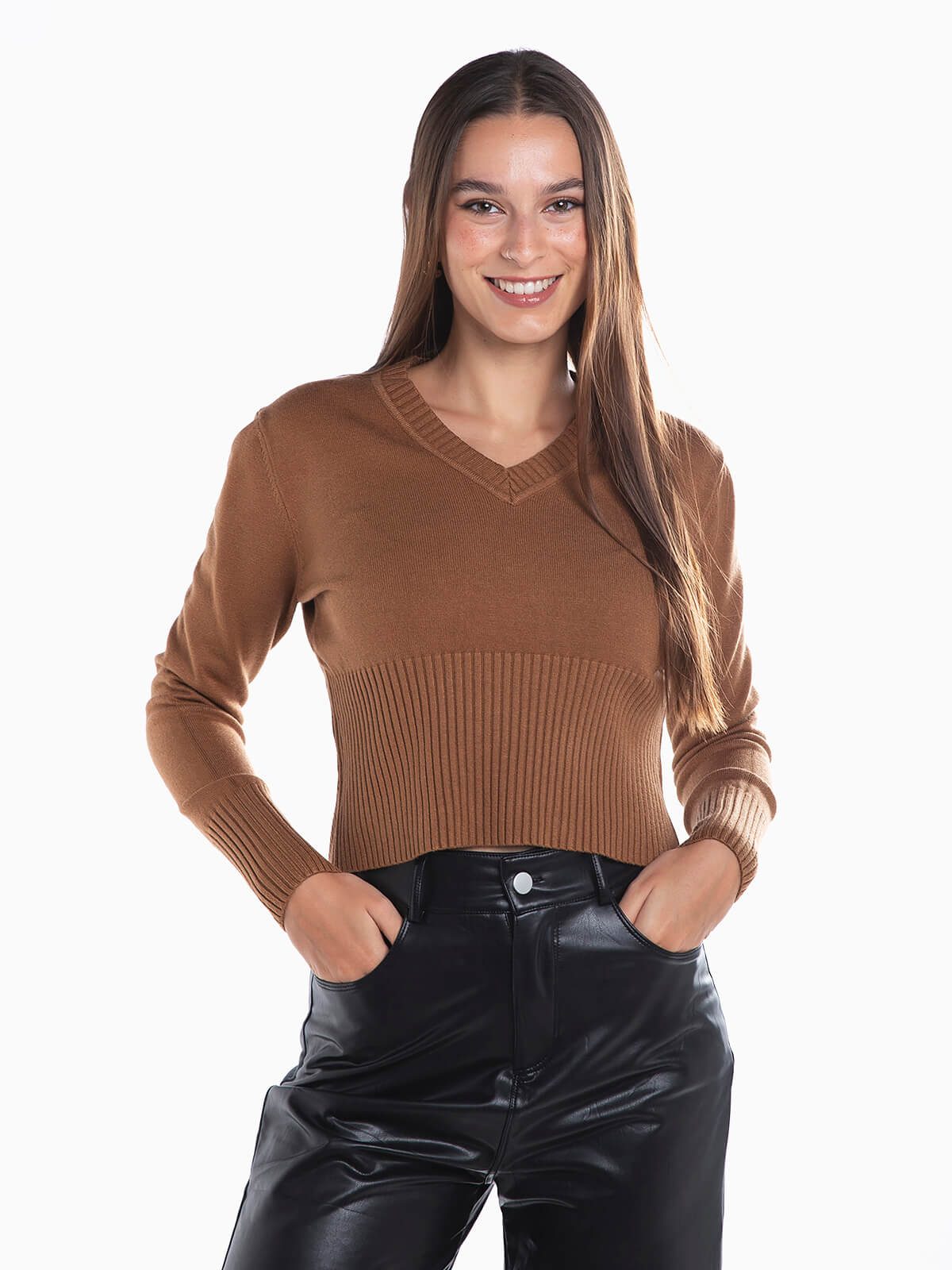 Camisola de malha curta com decote em V para senhora. Camisola manga comprida com extremidades caneladas.