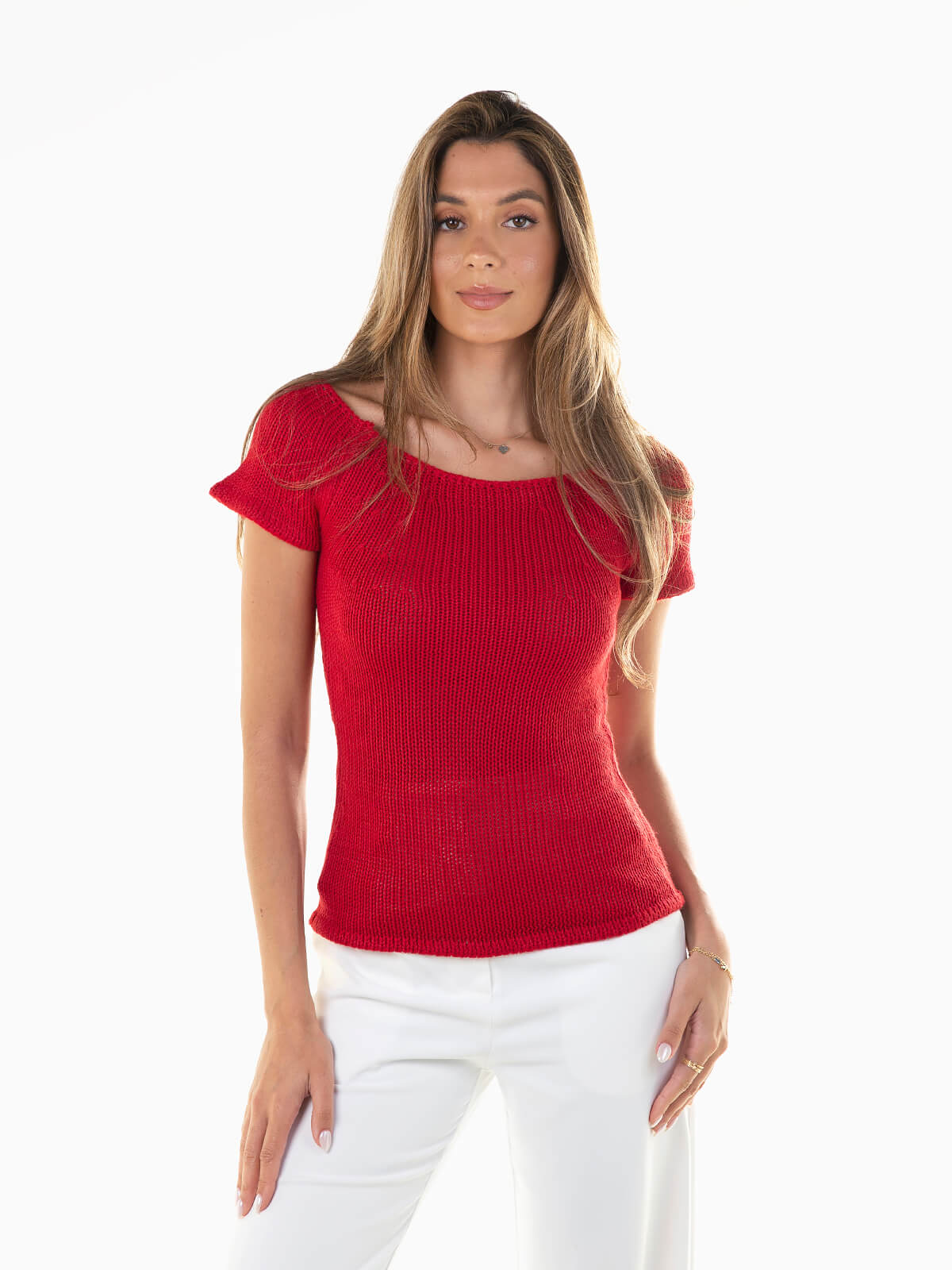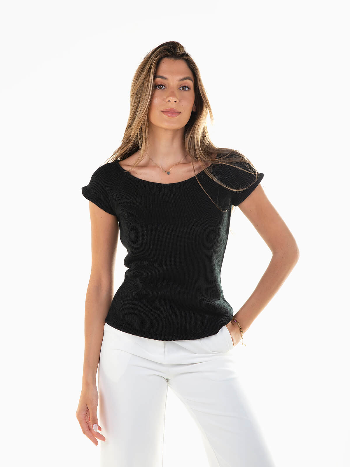 Camisola de malha com decote barco para senhora. Camisola de manga curta perfeita para combinar com jeans ou com umas calças clássicas.