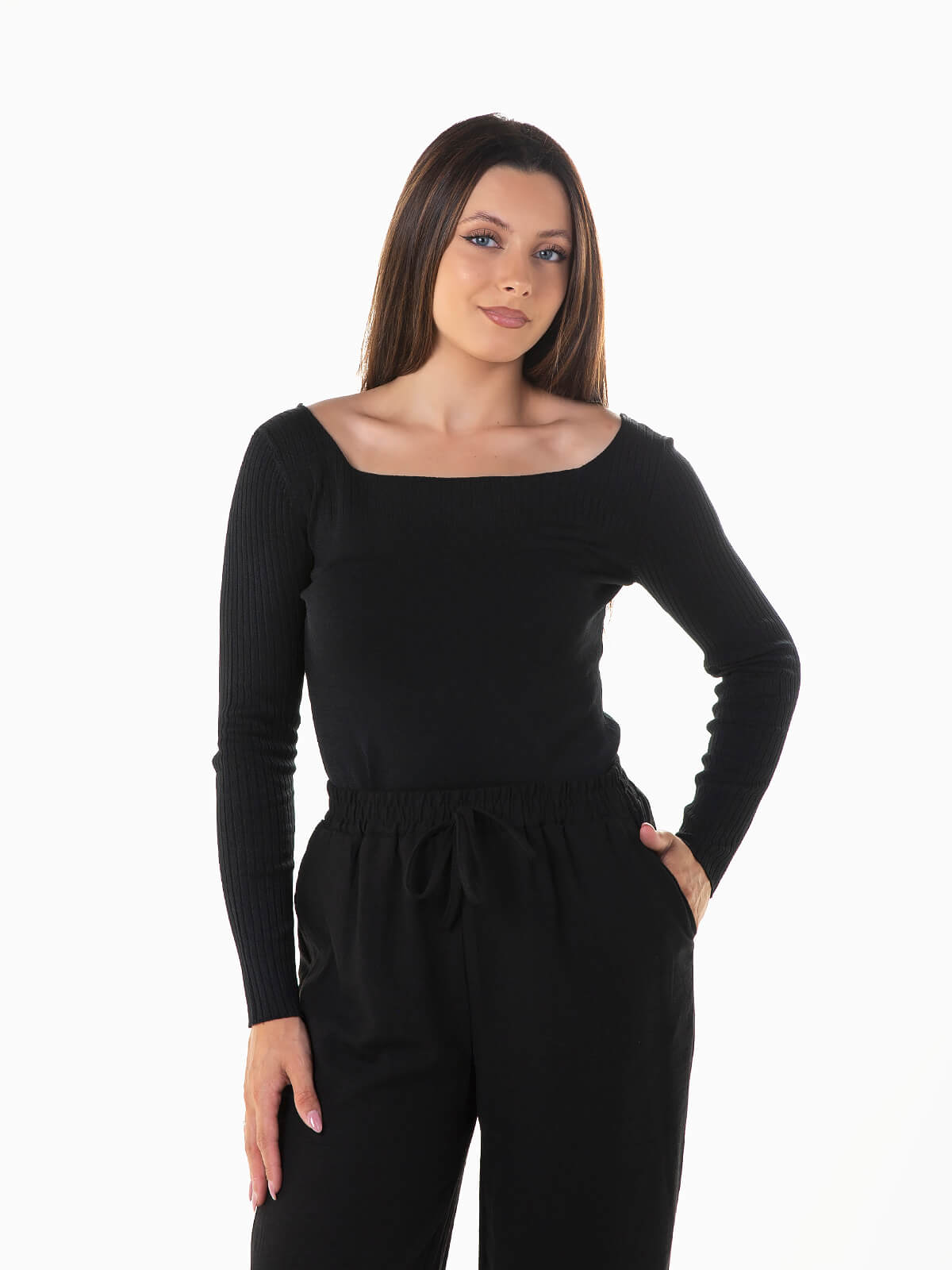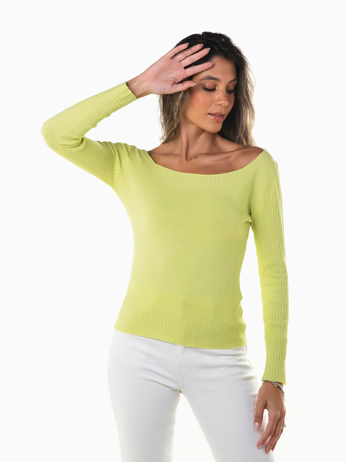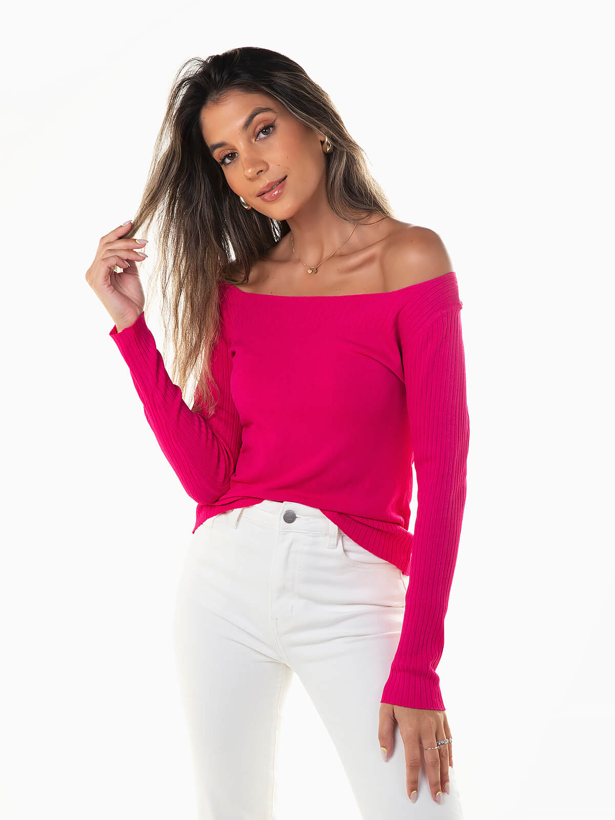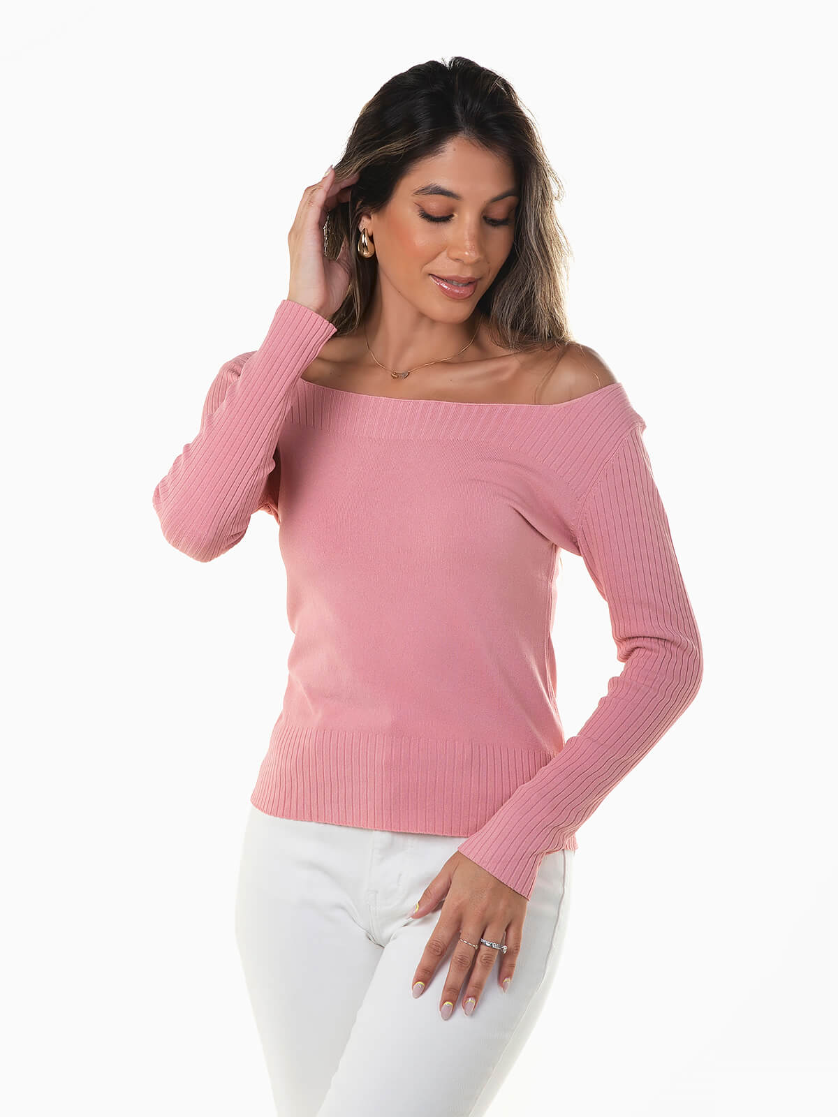 Camisola malha suave com decote barco. Camisola manga comprida para senhora com detalhes canelados.
