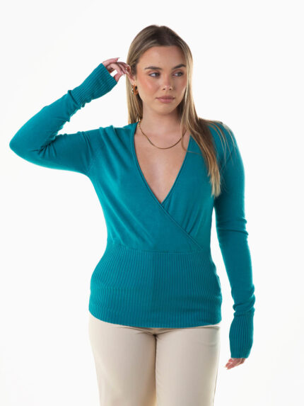 Camisola de malha com decote cruzado para senhora. Camisola manga comprida com extremidades caneladas.