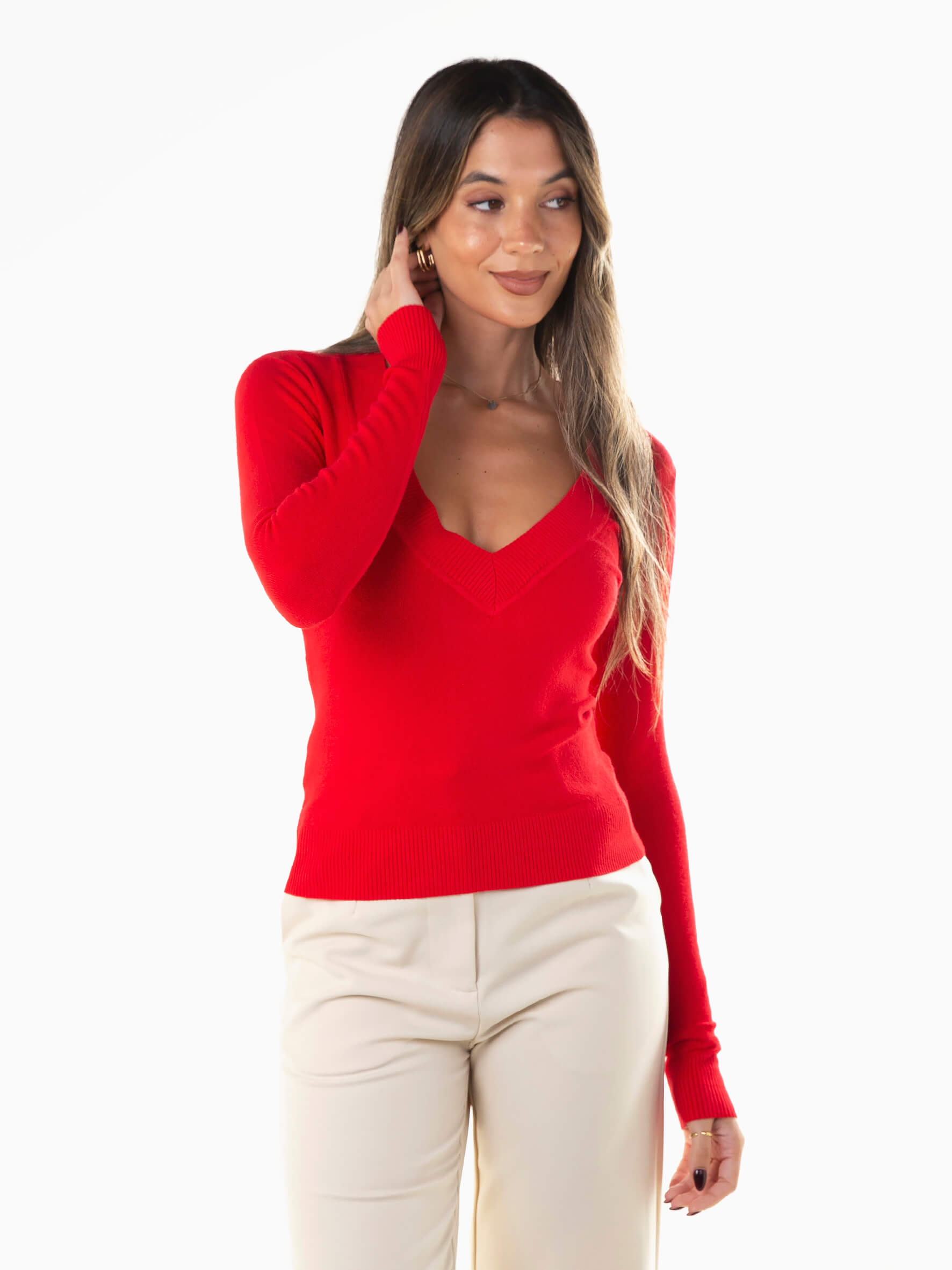 Camisola de malha com decote em V profundo para mulher. Camisola manga comprida com acabamentos canelados.