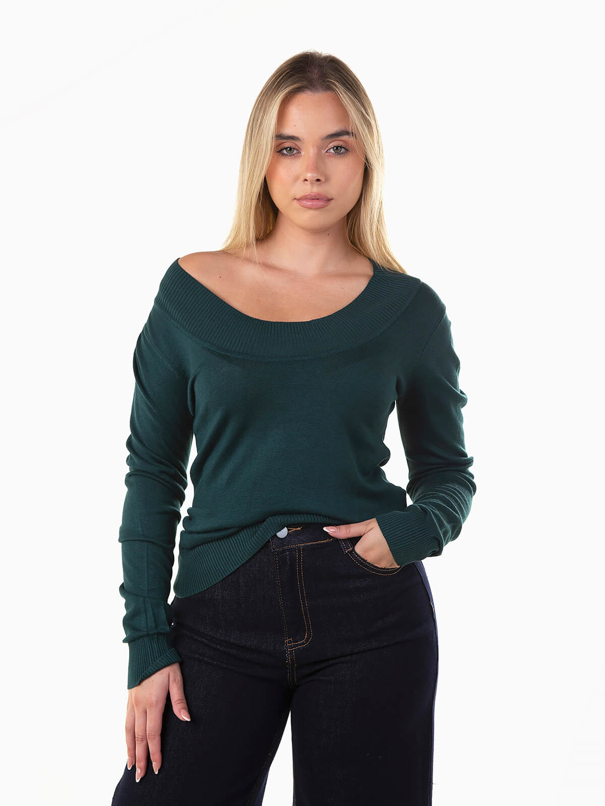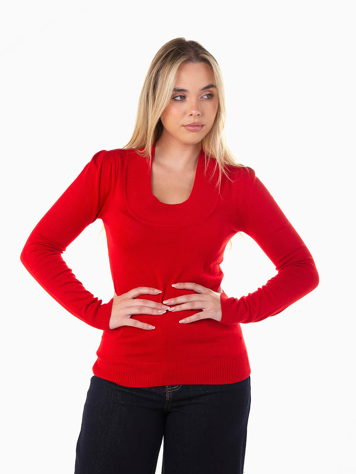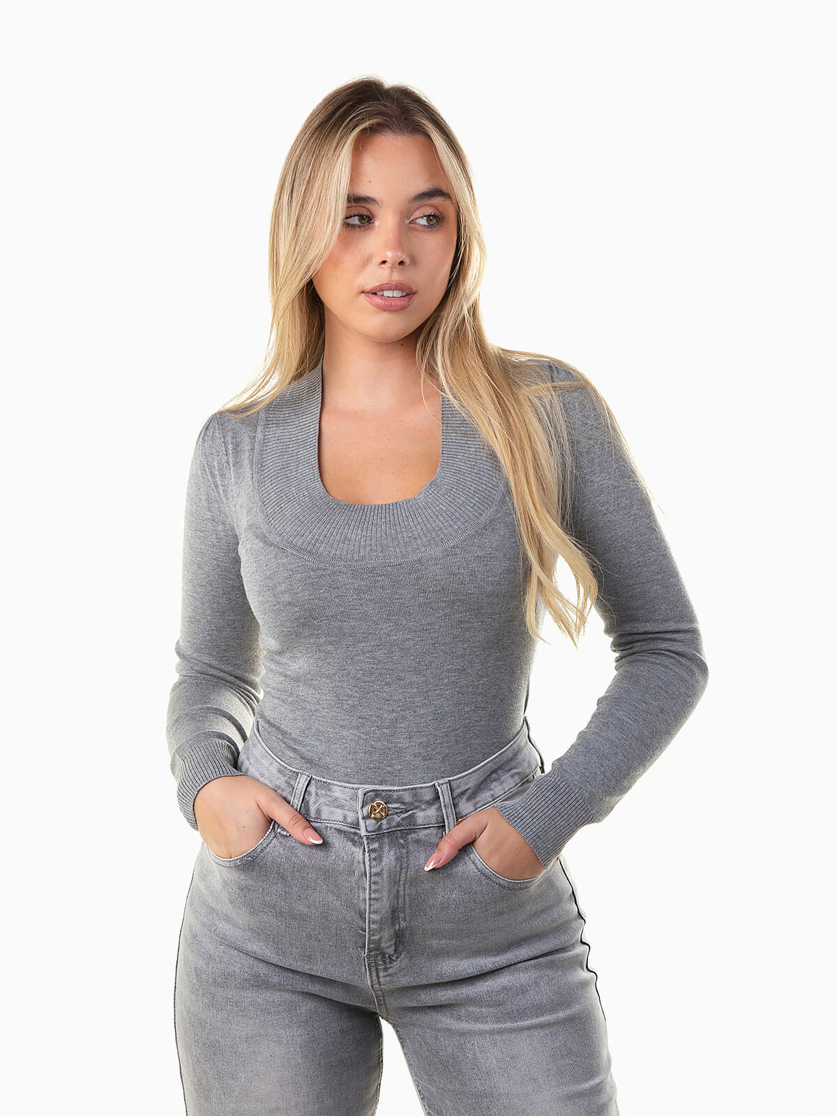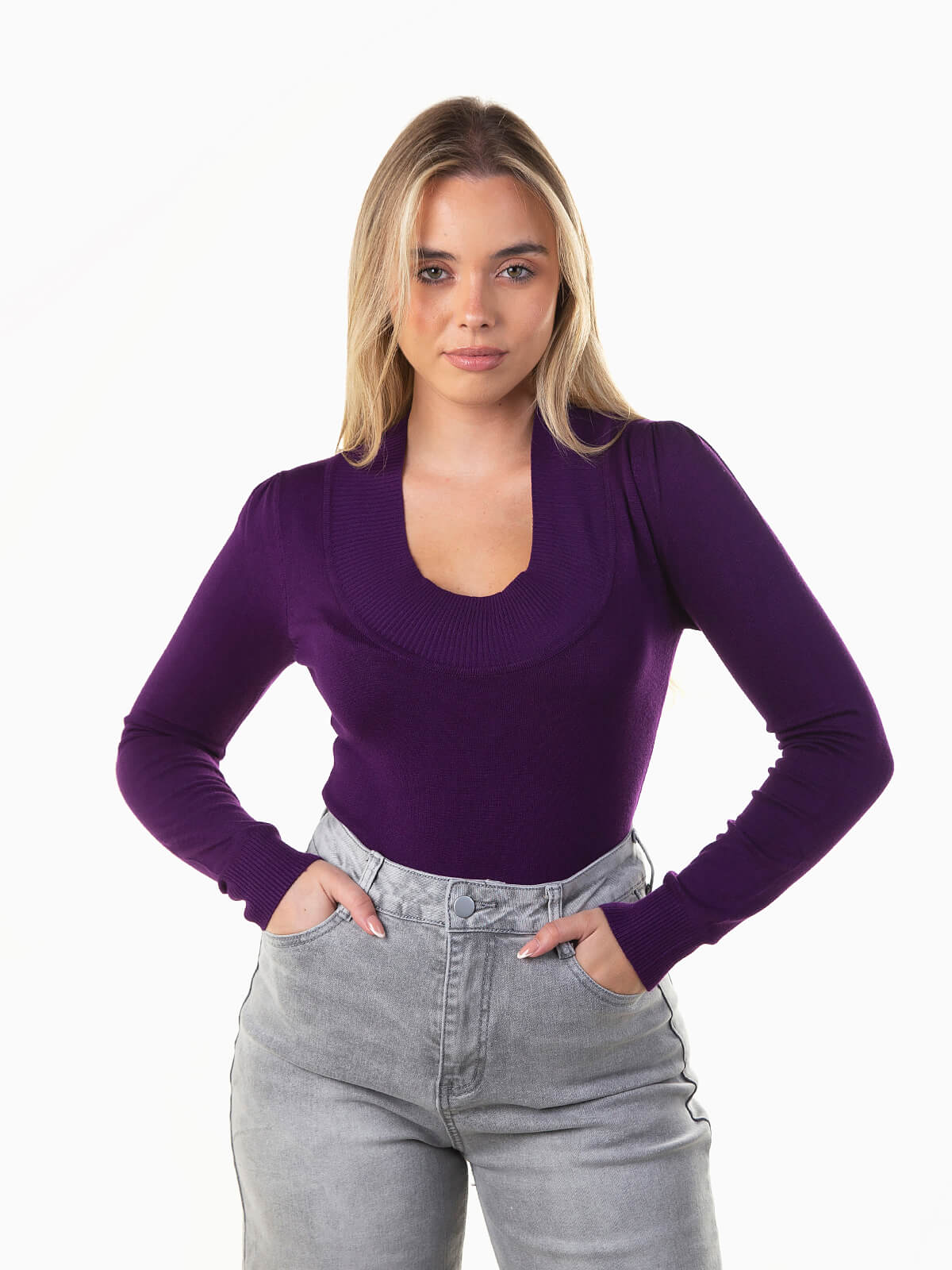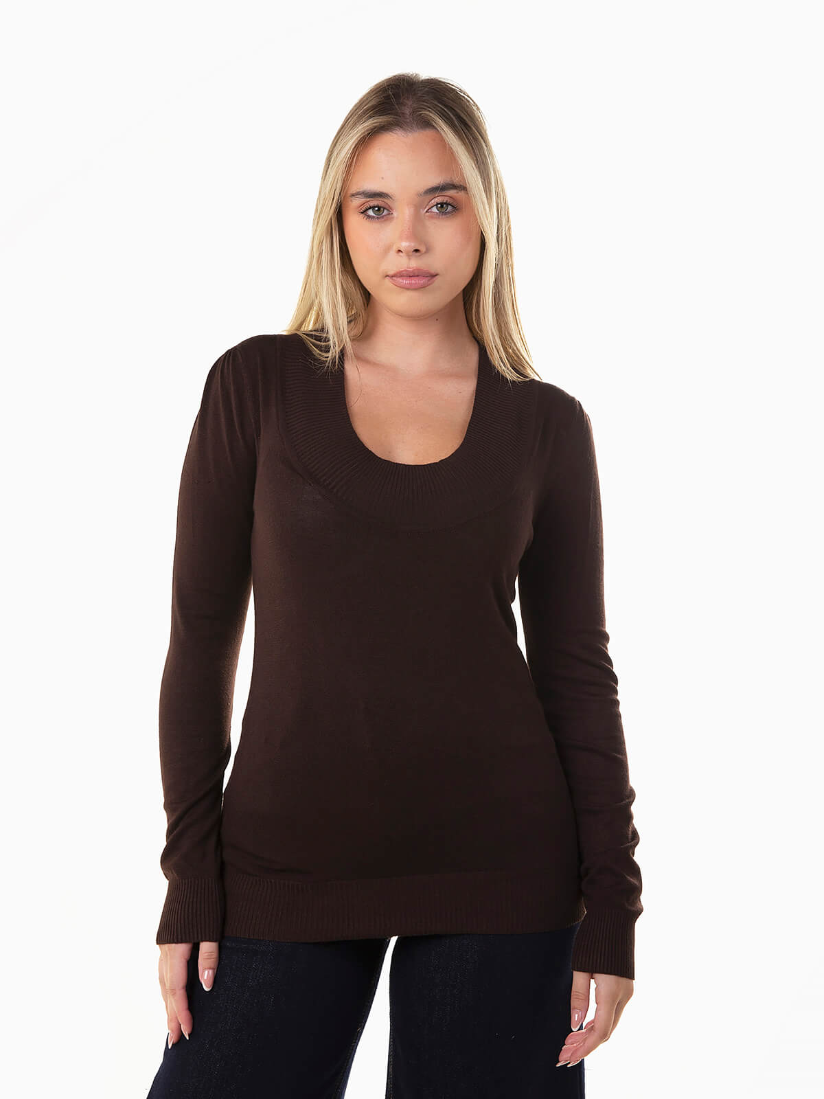Camisola de malha com decote redondo profundo versátil, manga comprida e acabamentos canelados. Perfeita para criar looks casuais ou coordenados mais elegantes.
