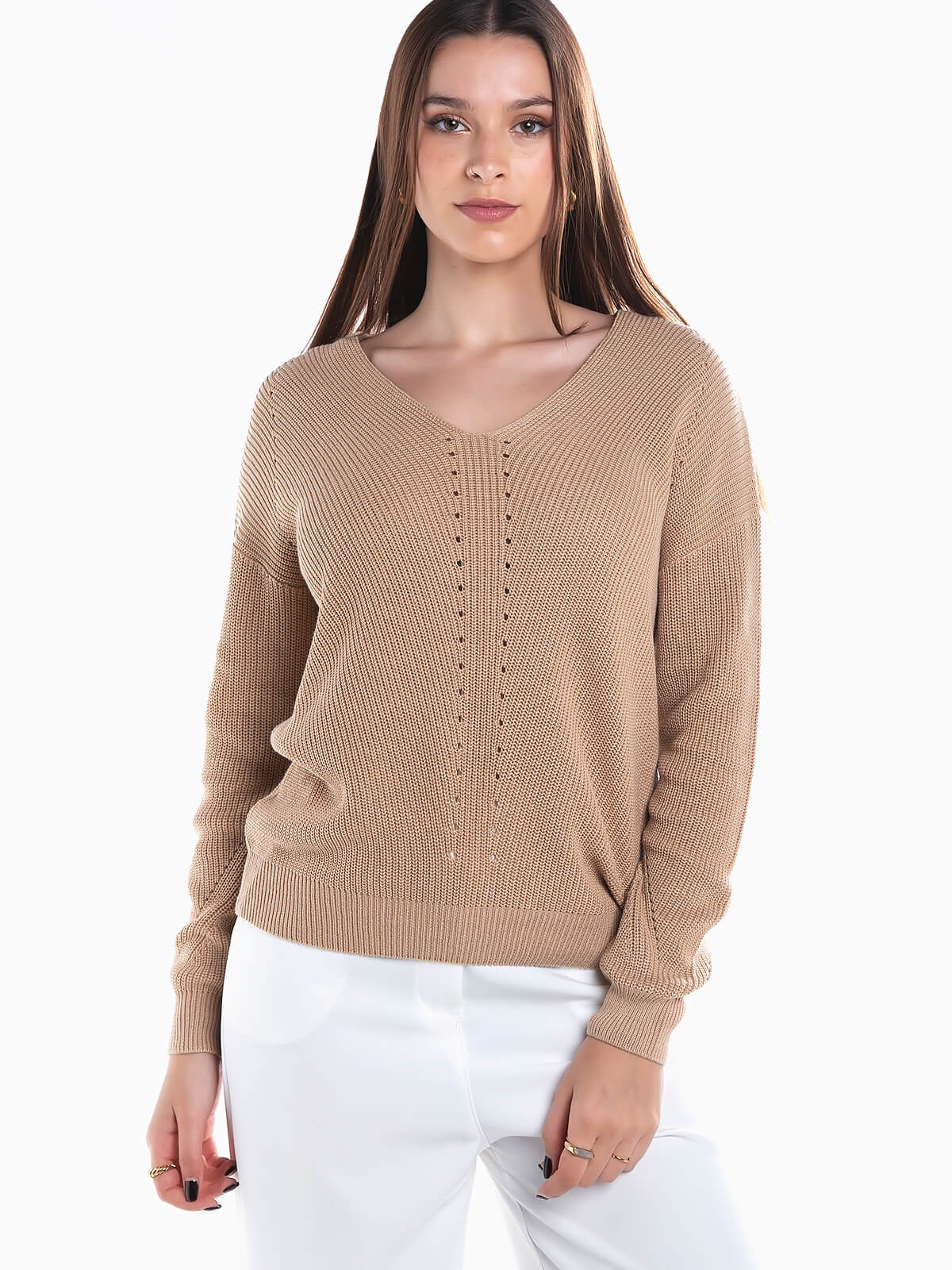 Camisola de malha com detalhes perfurados para senhora. Camisola de manga comprida com decote em bico. Acabamentos canelados.