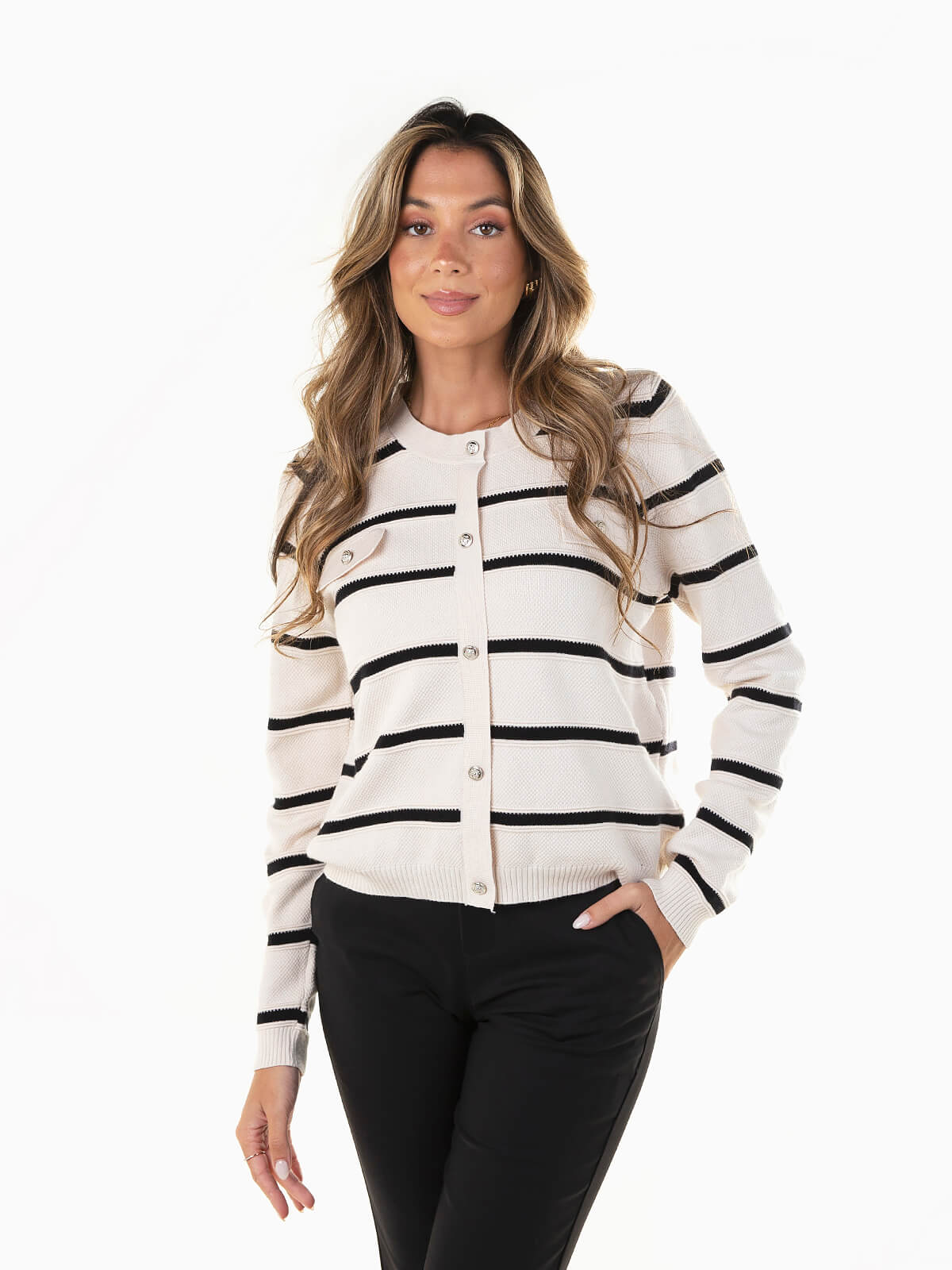Camisola de malha para senhora com efeito casaco, ideal para looks versáteis e modernos. Apresenta manga comprida, decote redondo e botões decorativos à frente, com acabamentos canelados que garantem conforto e estilo. Um essencial para combinar com calças, saias ou jeans, perfeito para criar outfits atuais e cheios de personalidade.