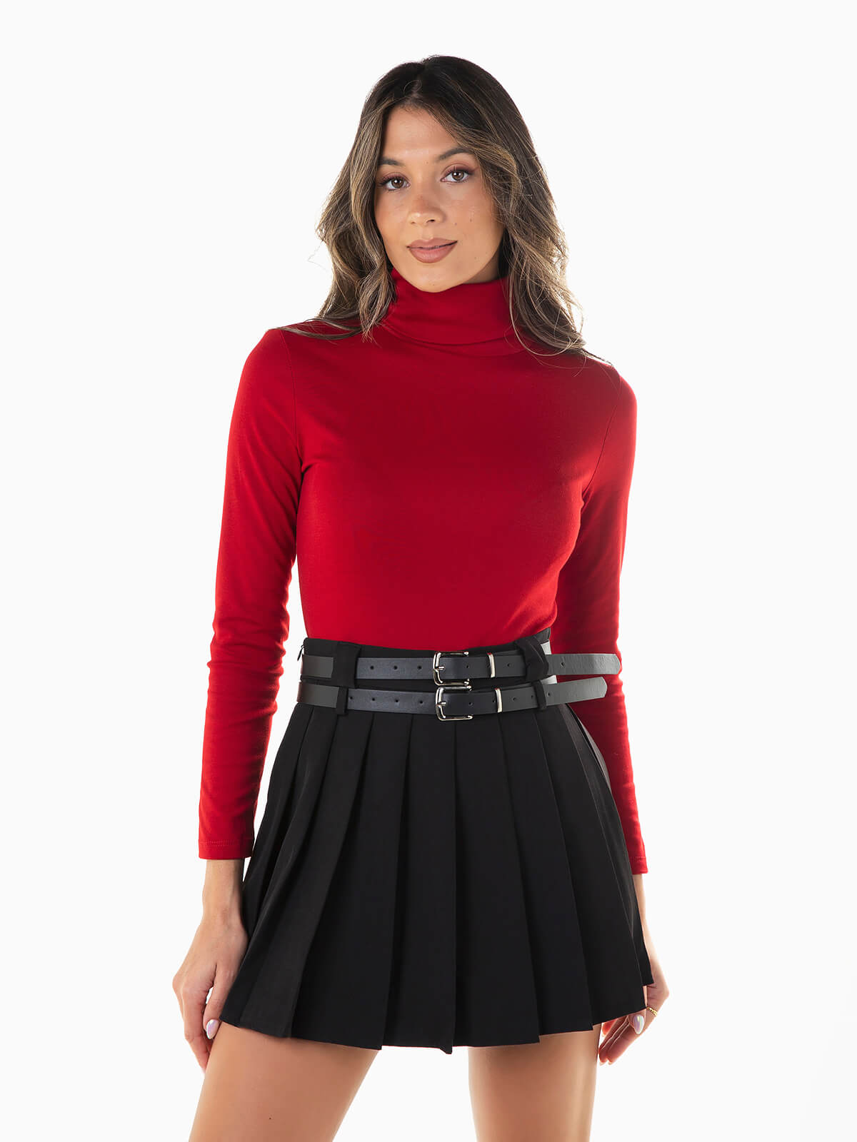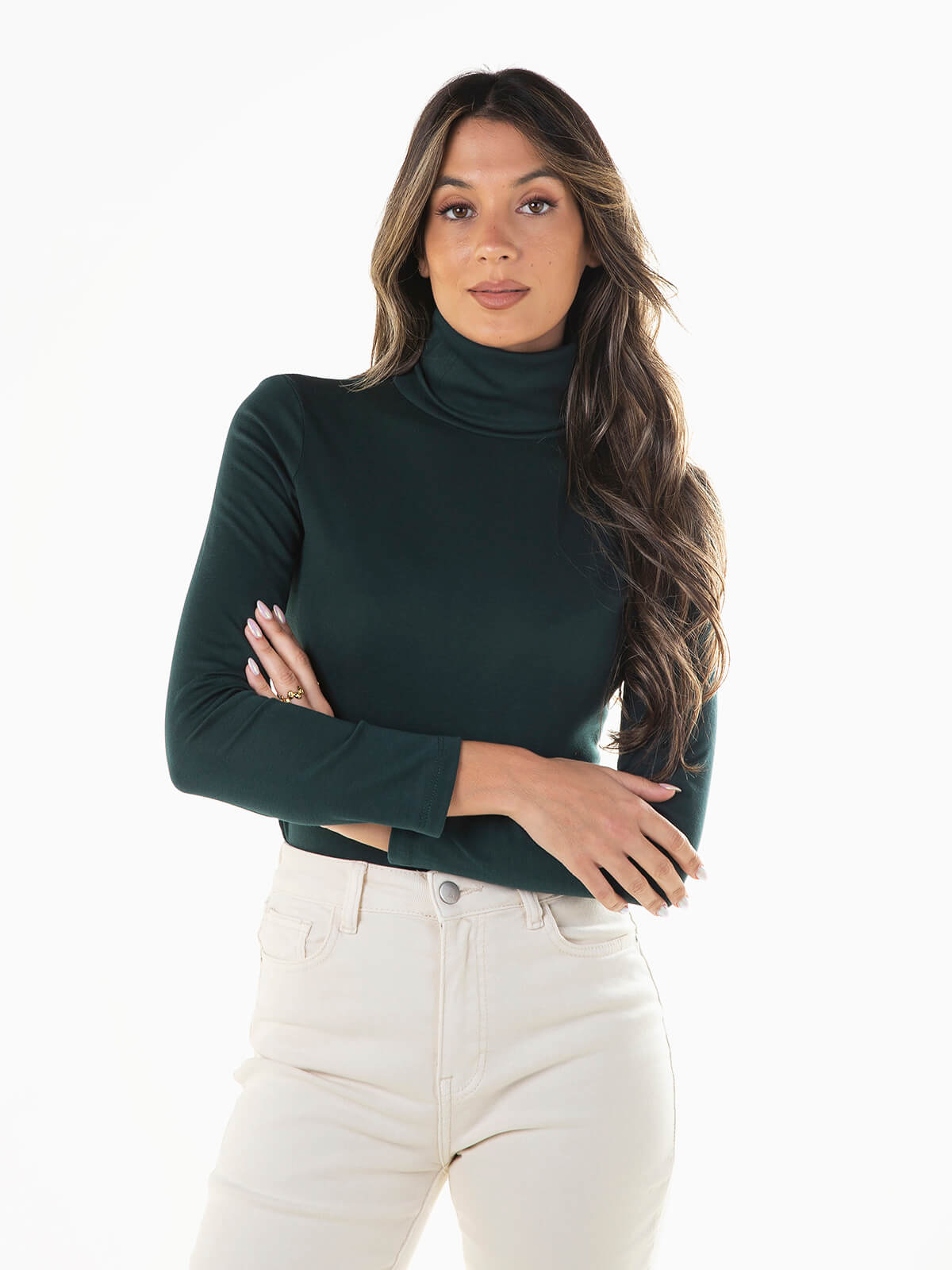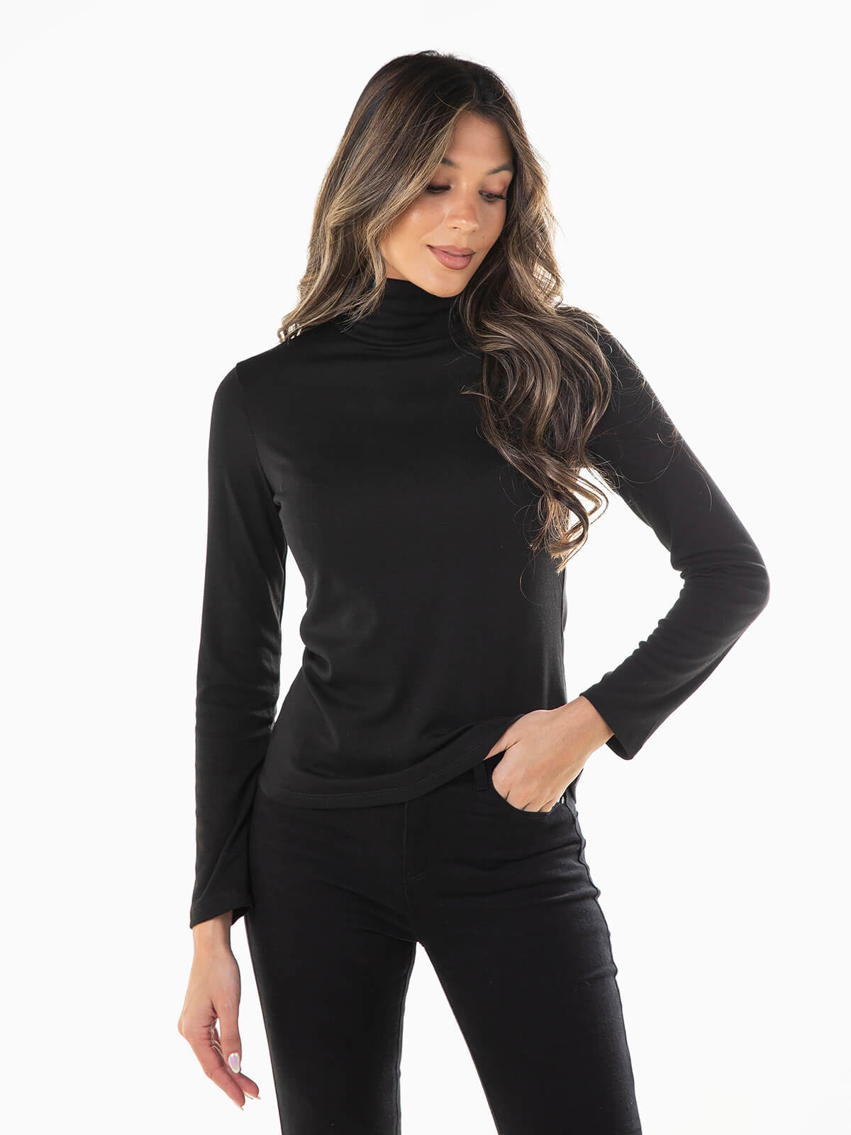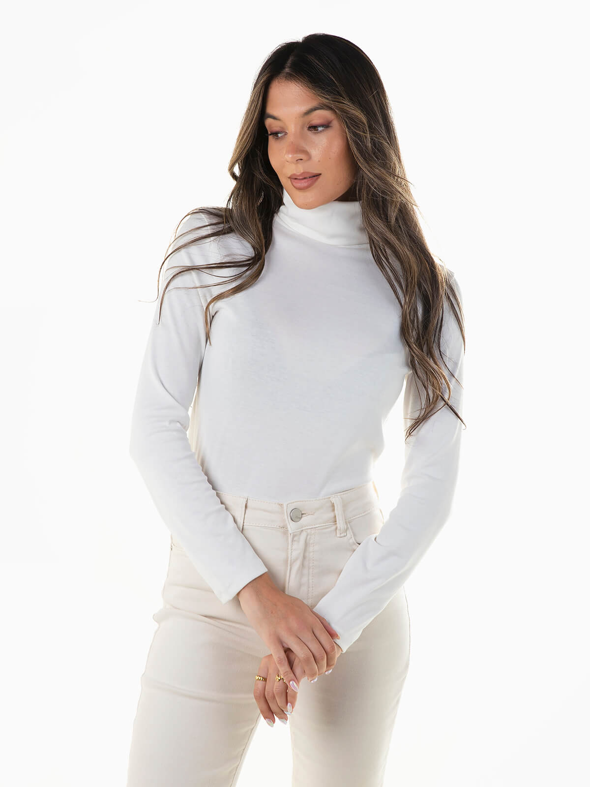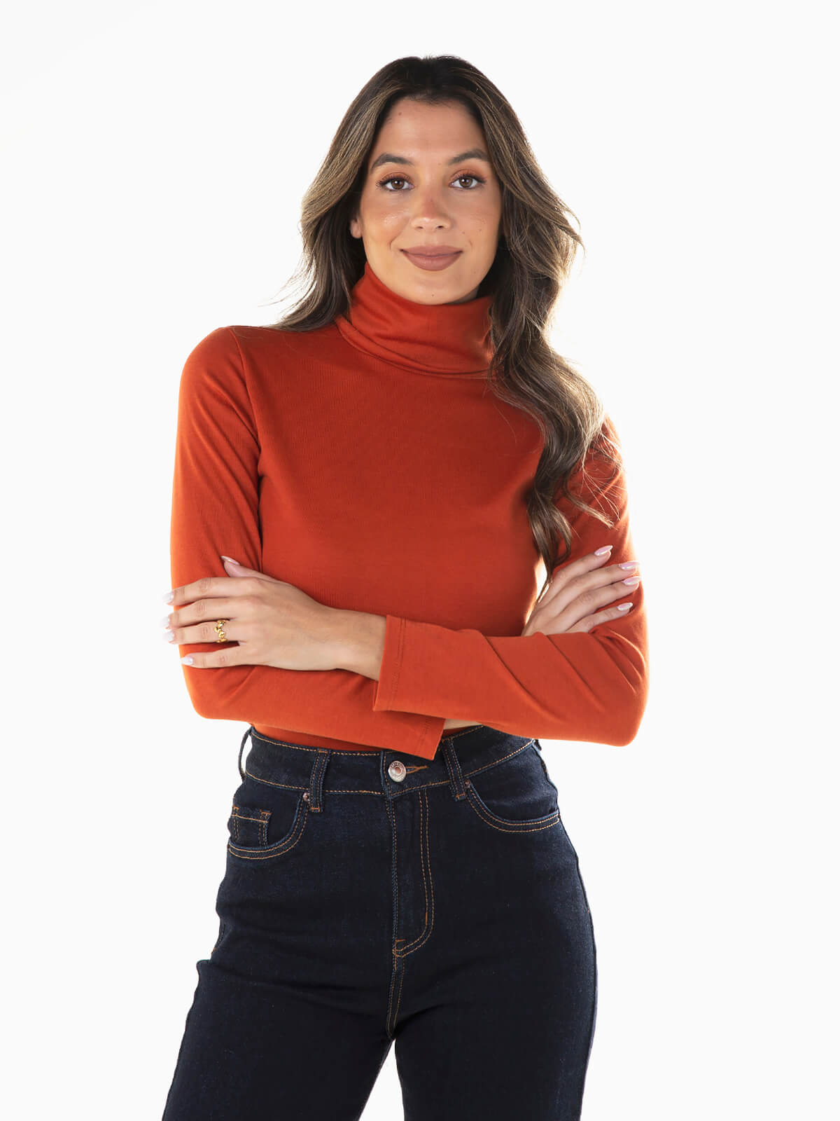 Camisola malha elástica com gola alta dobrada para senhora. Camisola de manga comprida.