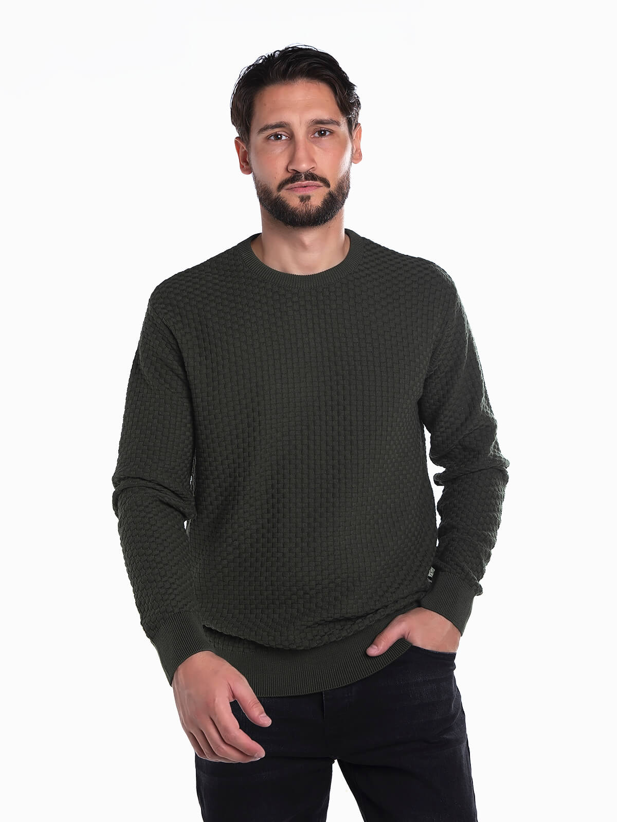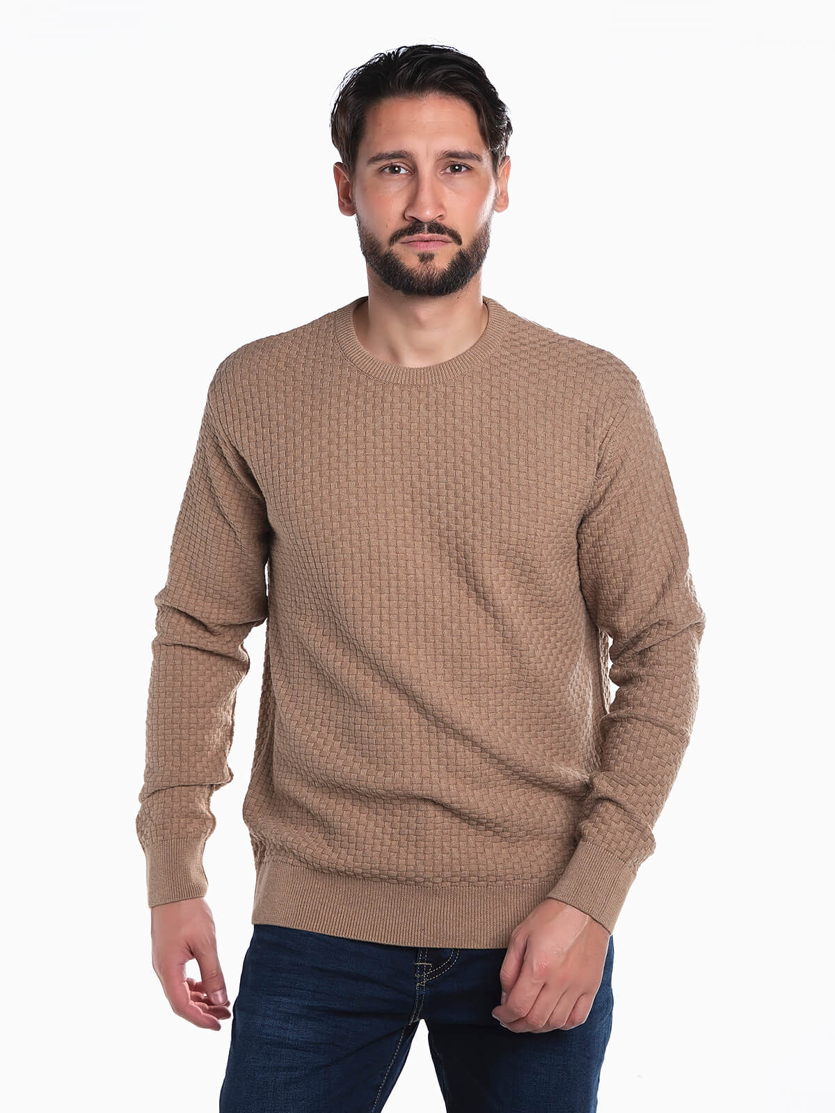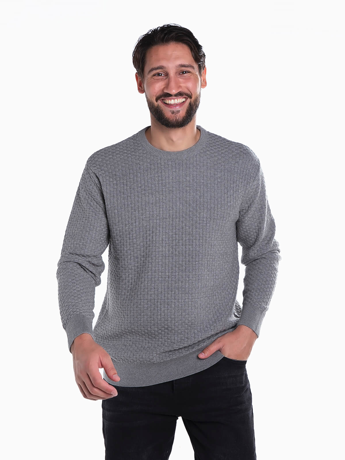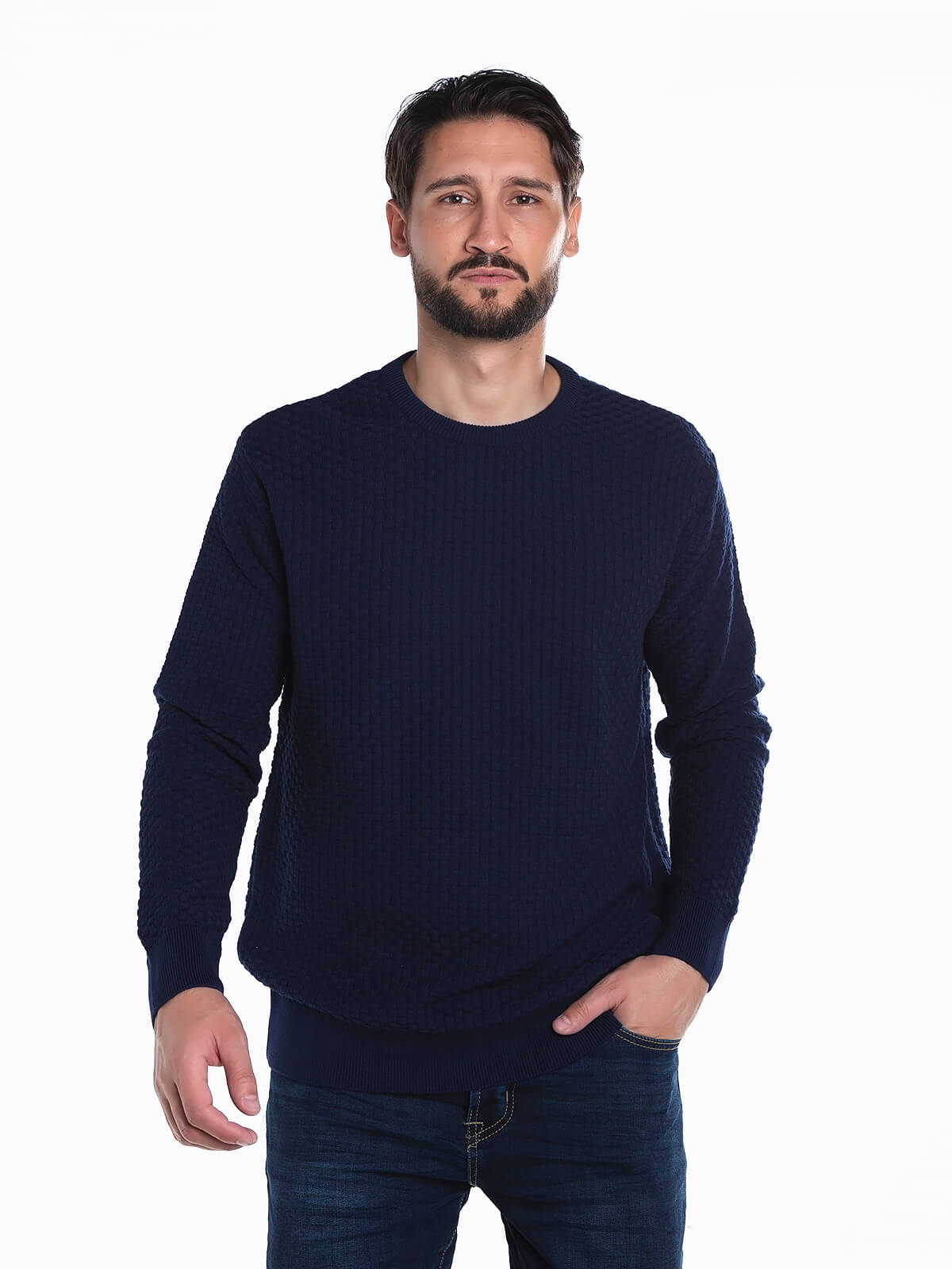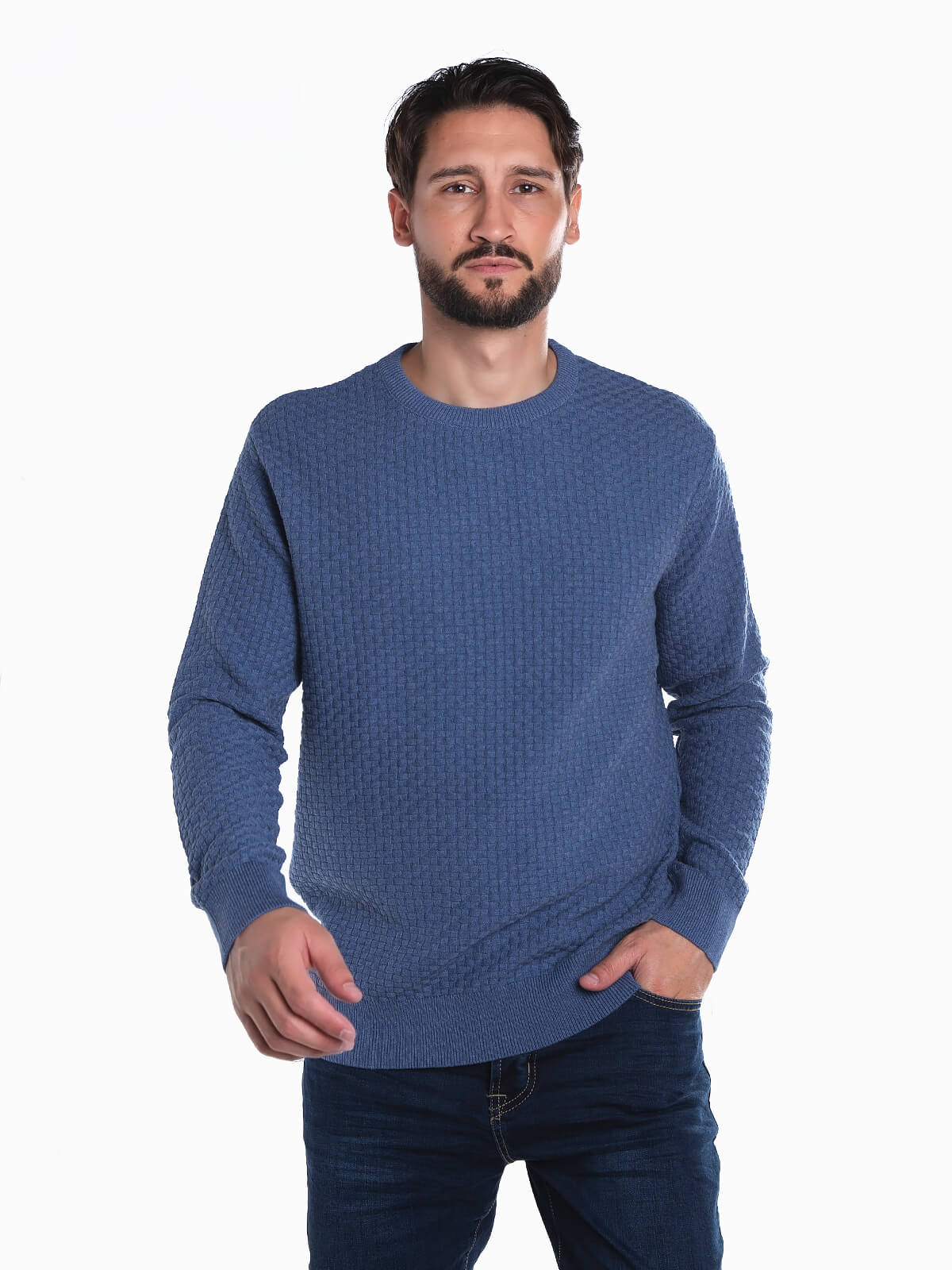 Camisola malha 100% algodão trabalhada com efeito de quadrados. Camisola manga comprida com gola redonda. Acabamentos canelados.