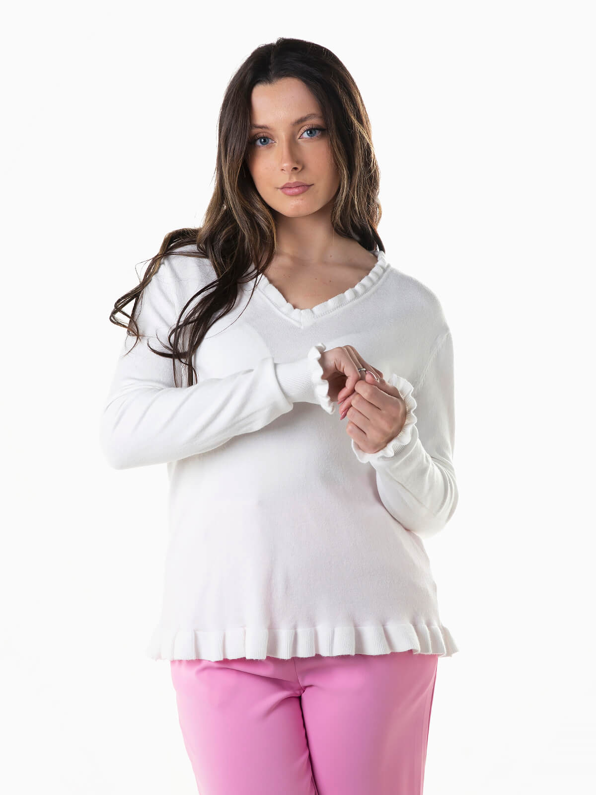 Camisola de malha com decote em V para senhora. Camisa de manga comprida com acabamentos em folhos.