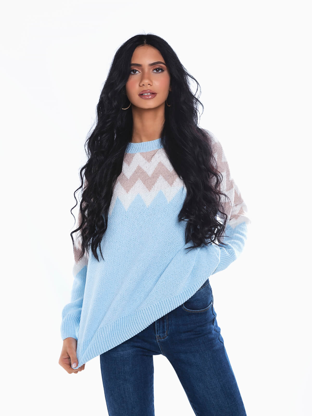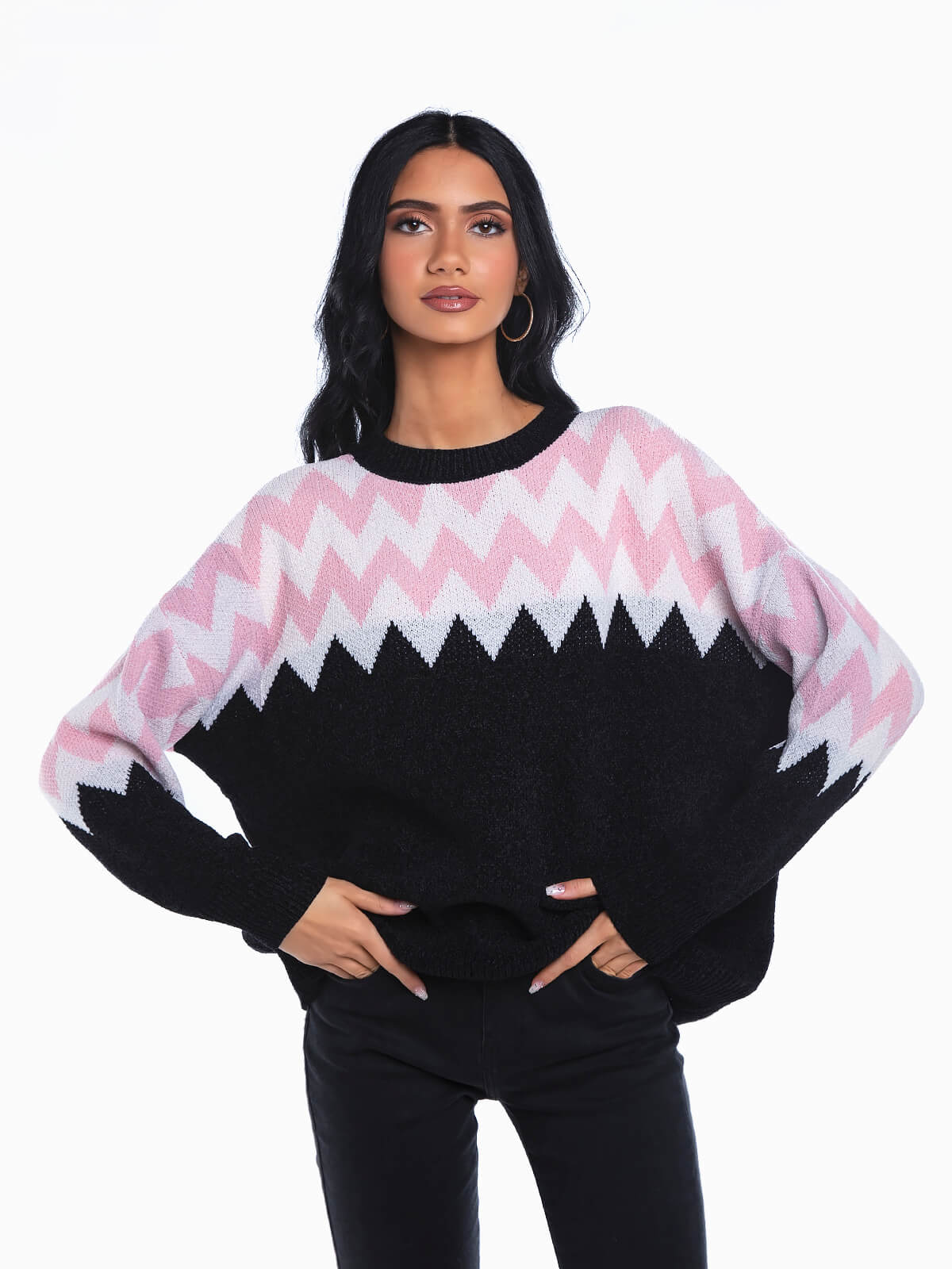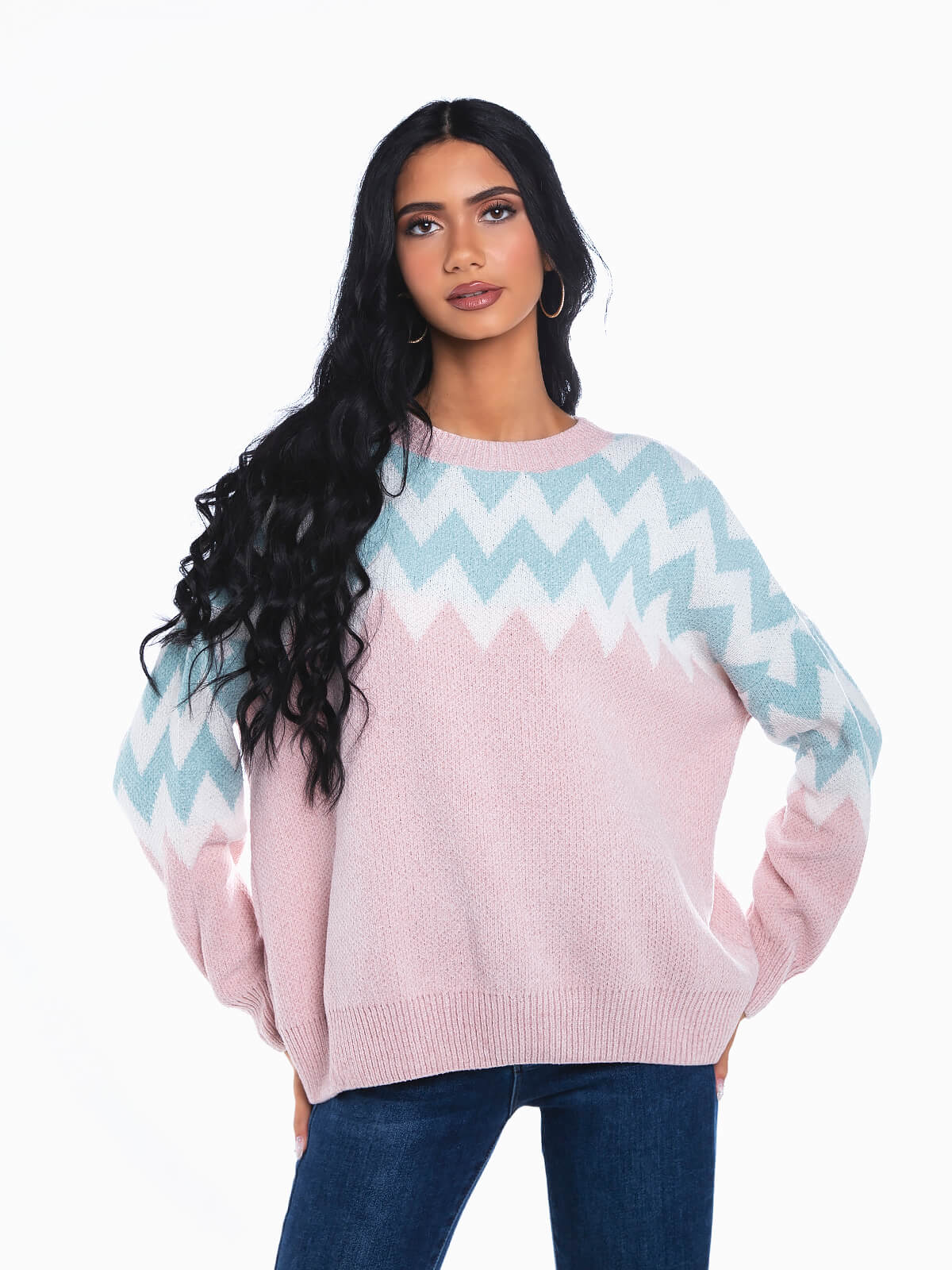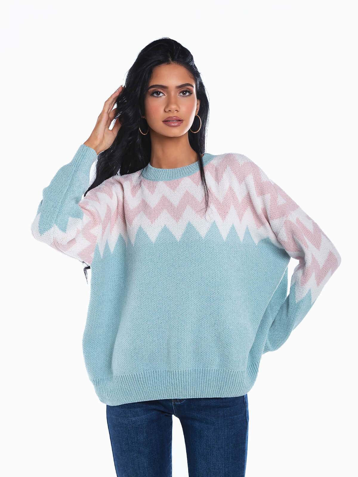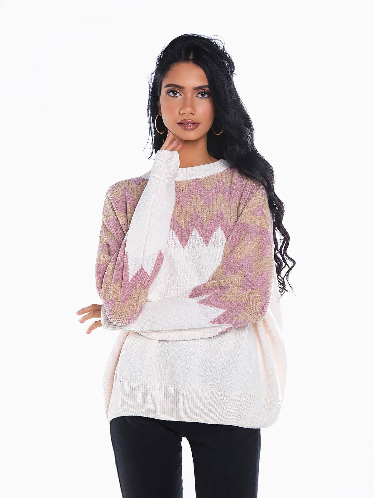 Camisola malha com estampado em ziguezague. Camisola oversize de manga comprida em tecido de toque suave. Decote redondo. Extremidades caneladas.