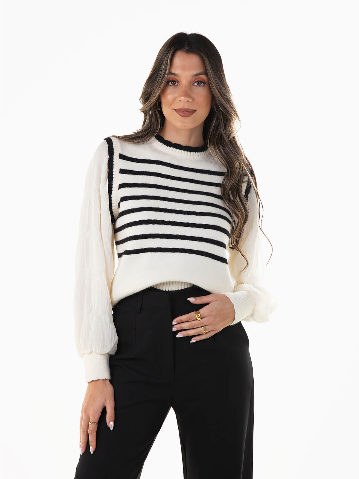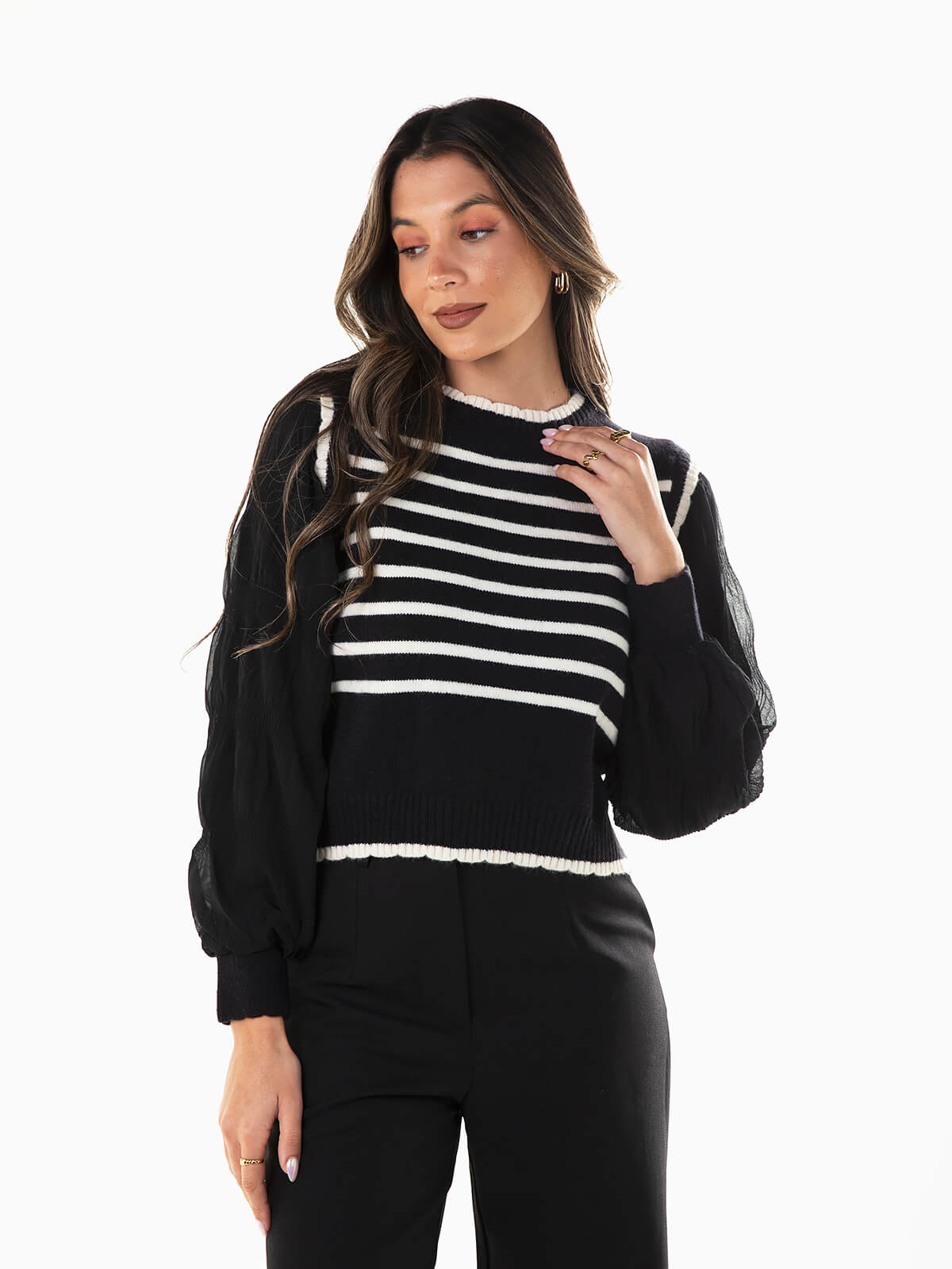 Camisola de malha às riscas com encaixe de tecido plissado nas mangas. Camisola de manga comprida com acabamentos recortados e canelados. Decote redondo.