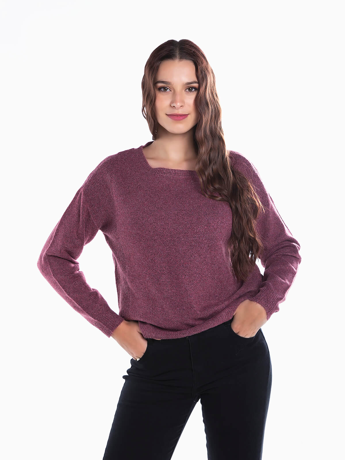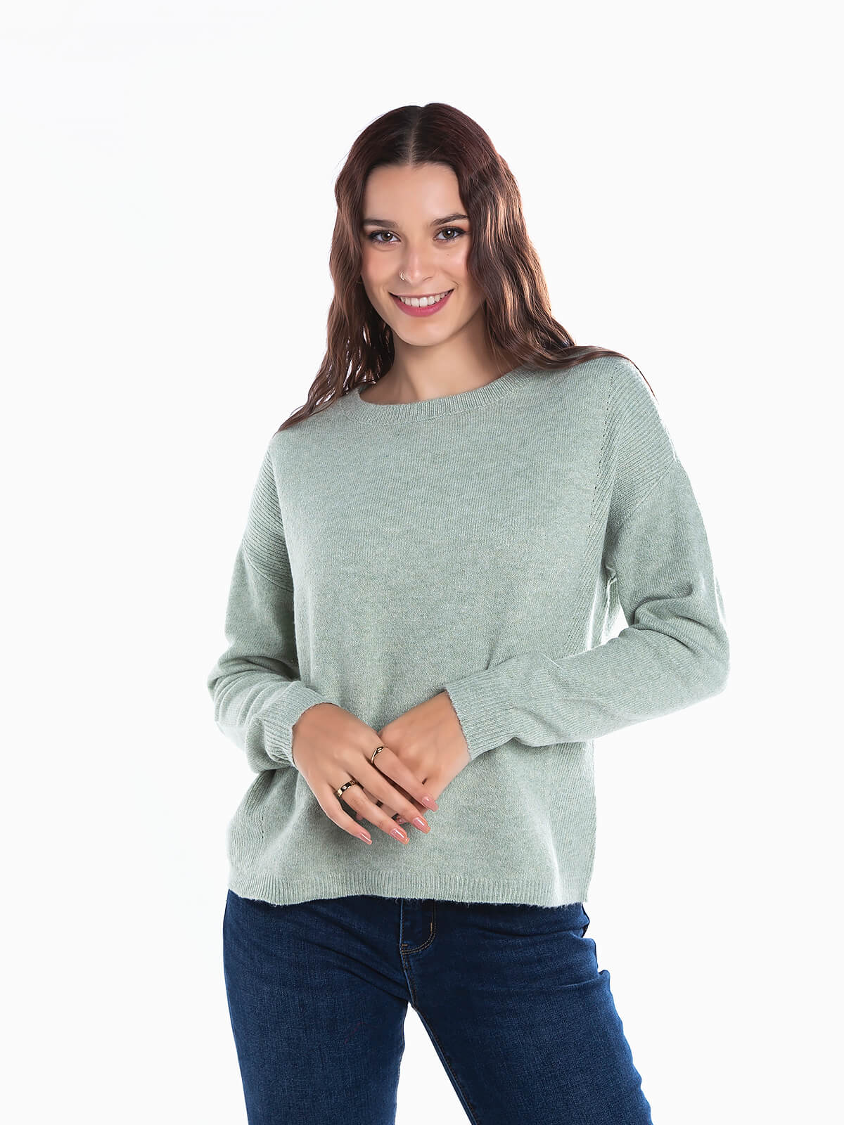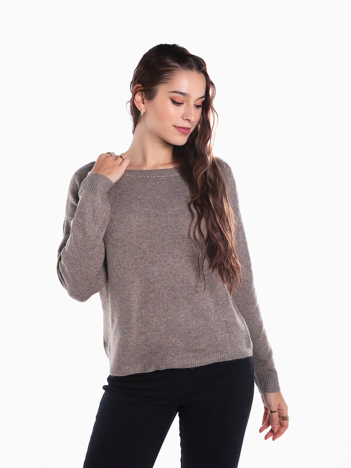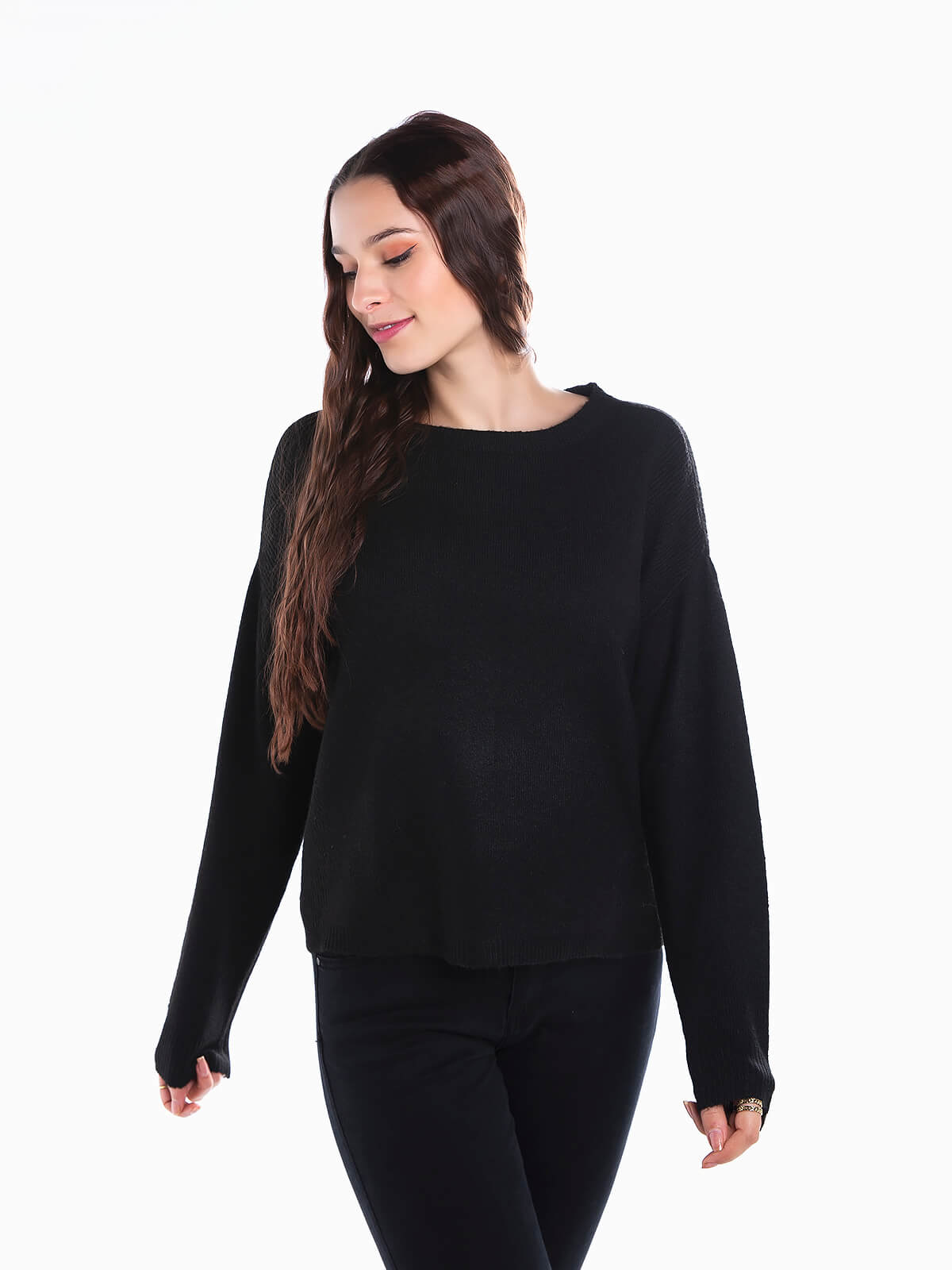 Camisola de malha com encaixe canelado nas extremidades. Camisola de manga comprida com decote redondo. Pormenores abertos. Ombros descaídos.