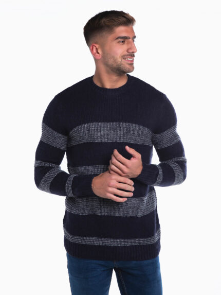 Camisola de malha para homem com encaixe de cores. Camisola manga comprida com gola redonda e acabamentos canelados.