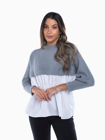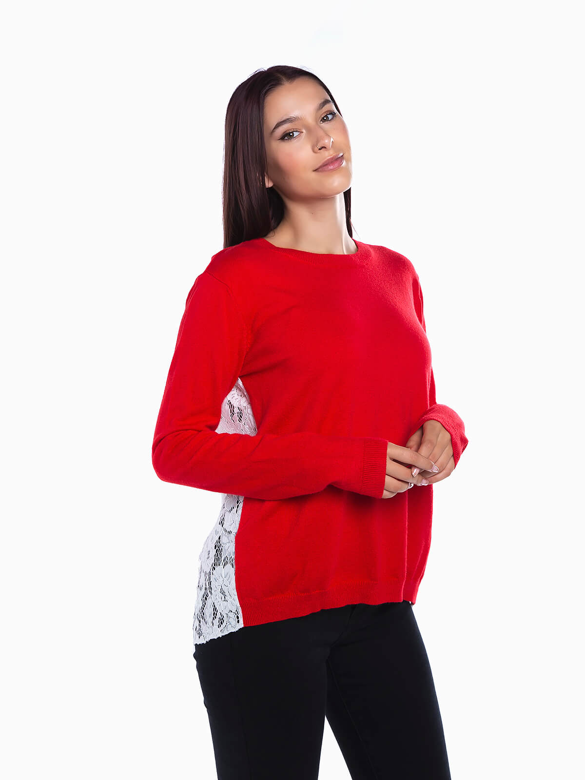 Camisola malha com encaixe posterior em renda. Camisola para senhora de manga comprida com decote redondo. Extremidades caneladas. Cós arredondado mais comprido atrás.