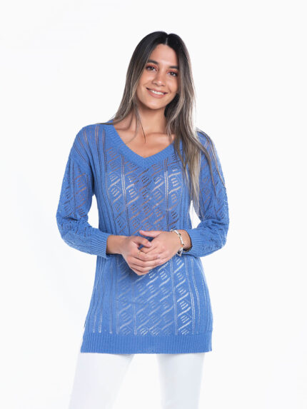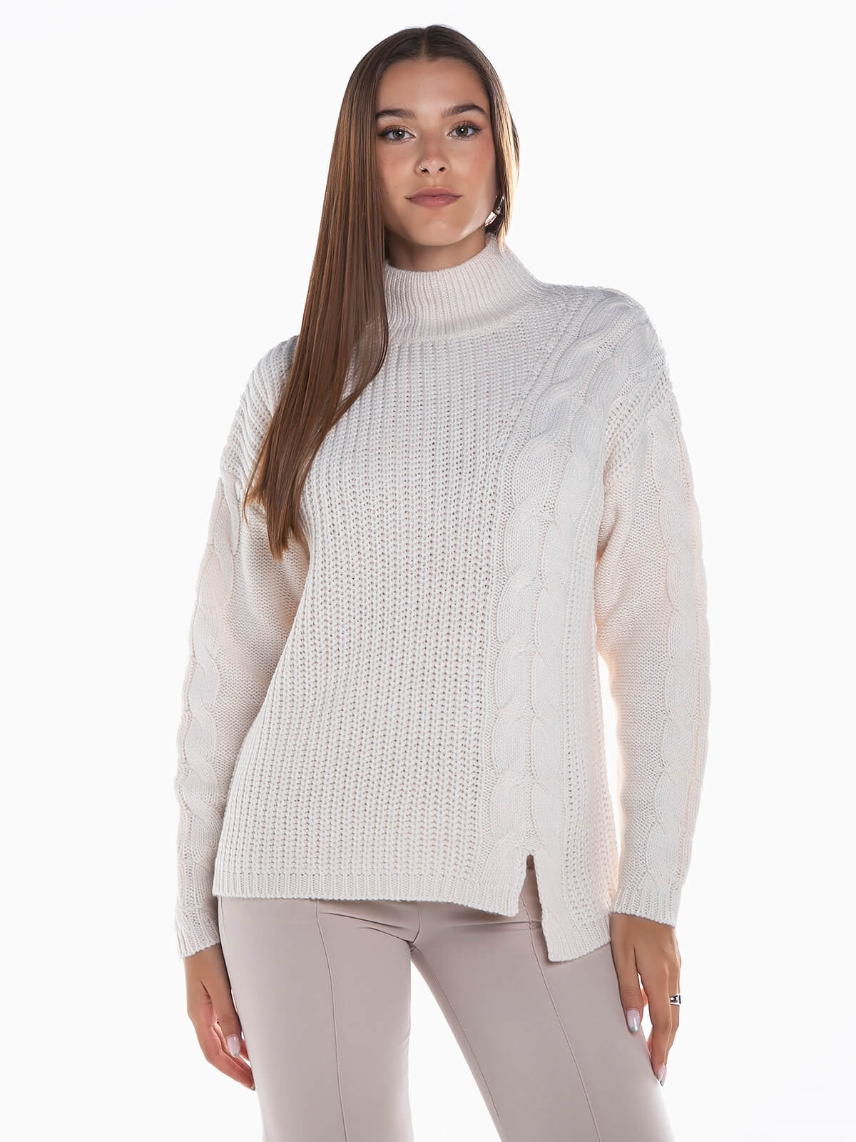 Camisola malha entrançada com gola alta para senhora. Camisola manga comprida com pormenor aberto à frente. Acabamentos canelados.
