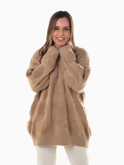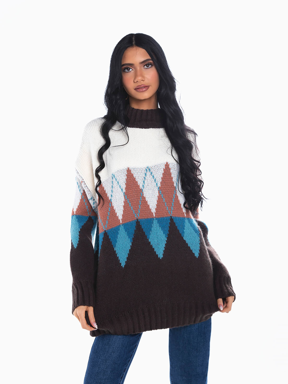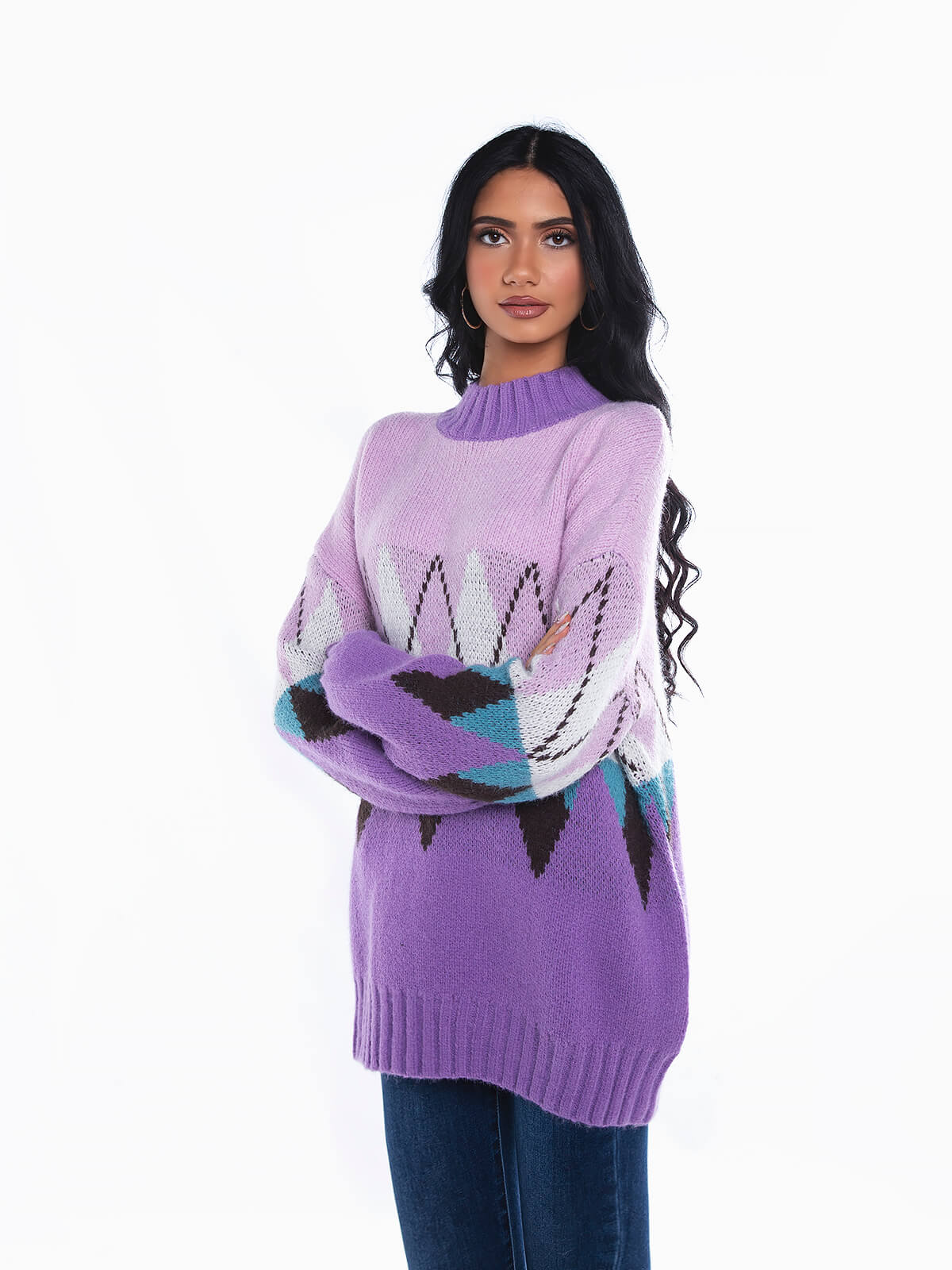 Camisola malha estampado étnico para senhora. Camisola comprida com gola perkins e ombros descaídos. Manga comprida. Acabamentos canelados.