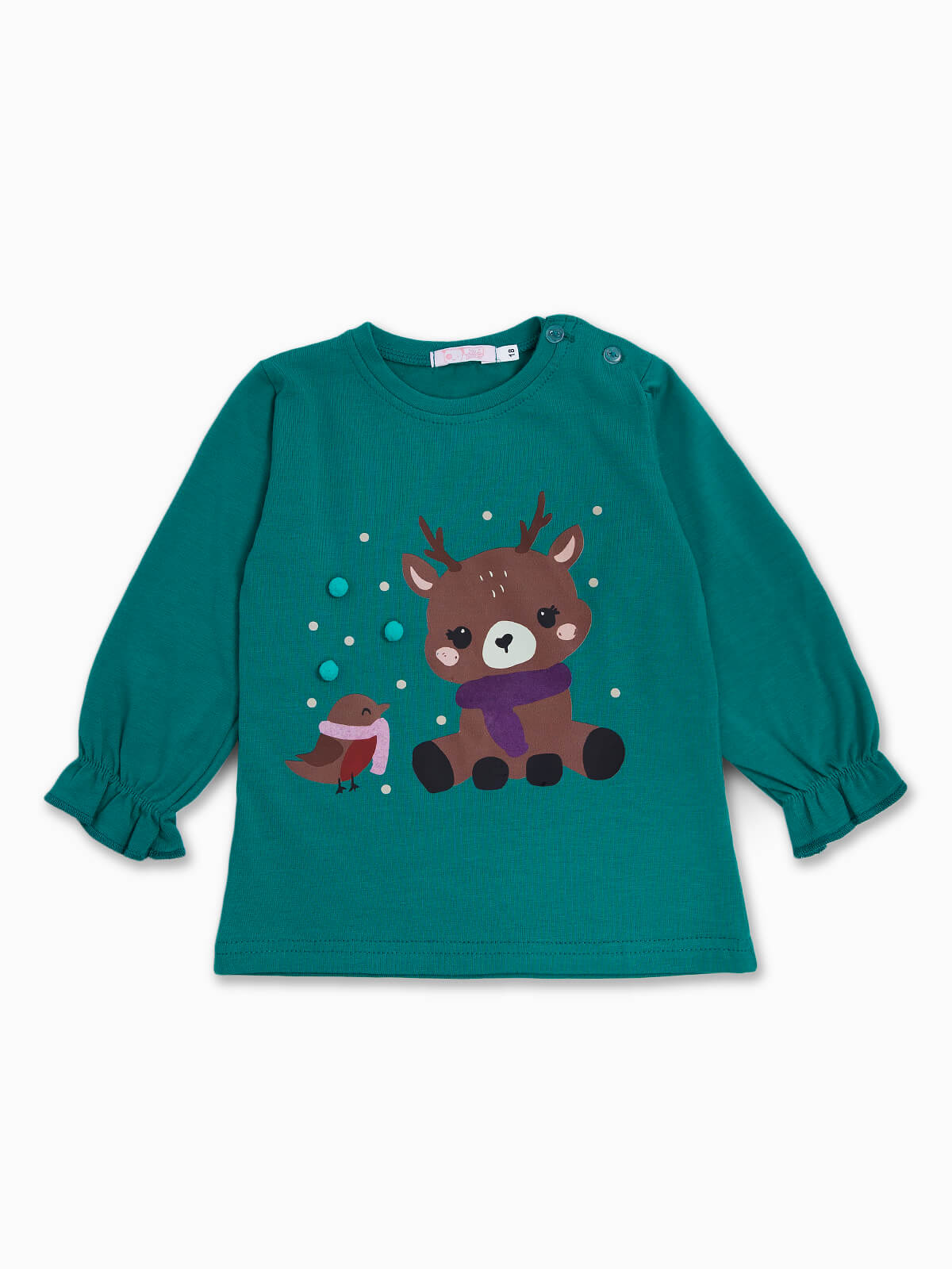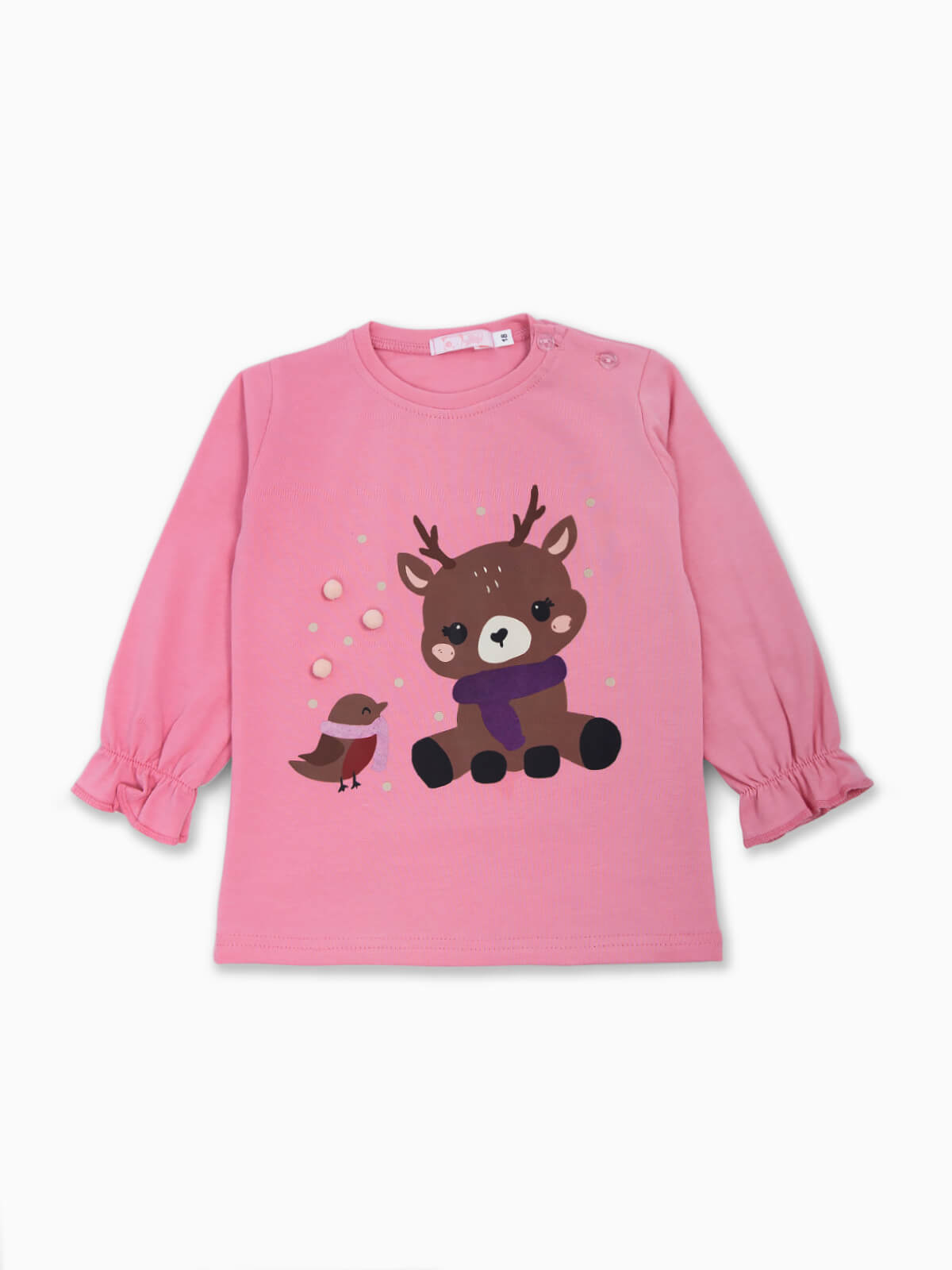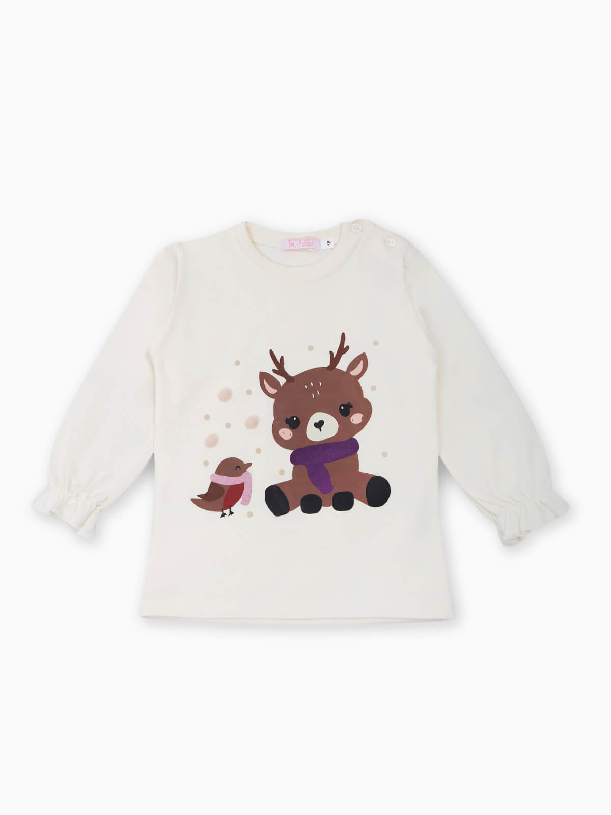 Camisola de malha com estampado rena e pássaro para bebé menina. Camisola cardada de manga comprida com punhos elásticos para acabamento folho. Decote redondo com aperto de dois botões.