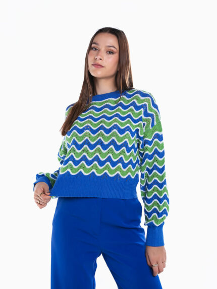Camisola de malha com estampado de riscas para senhora. Camisola de manga comprida justa com decote em bico. Ombros descaídos.