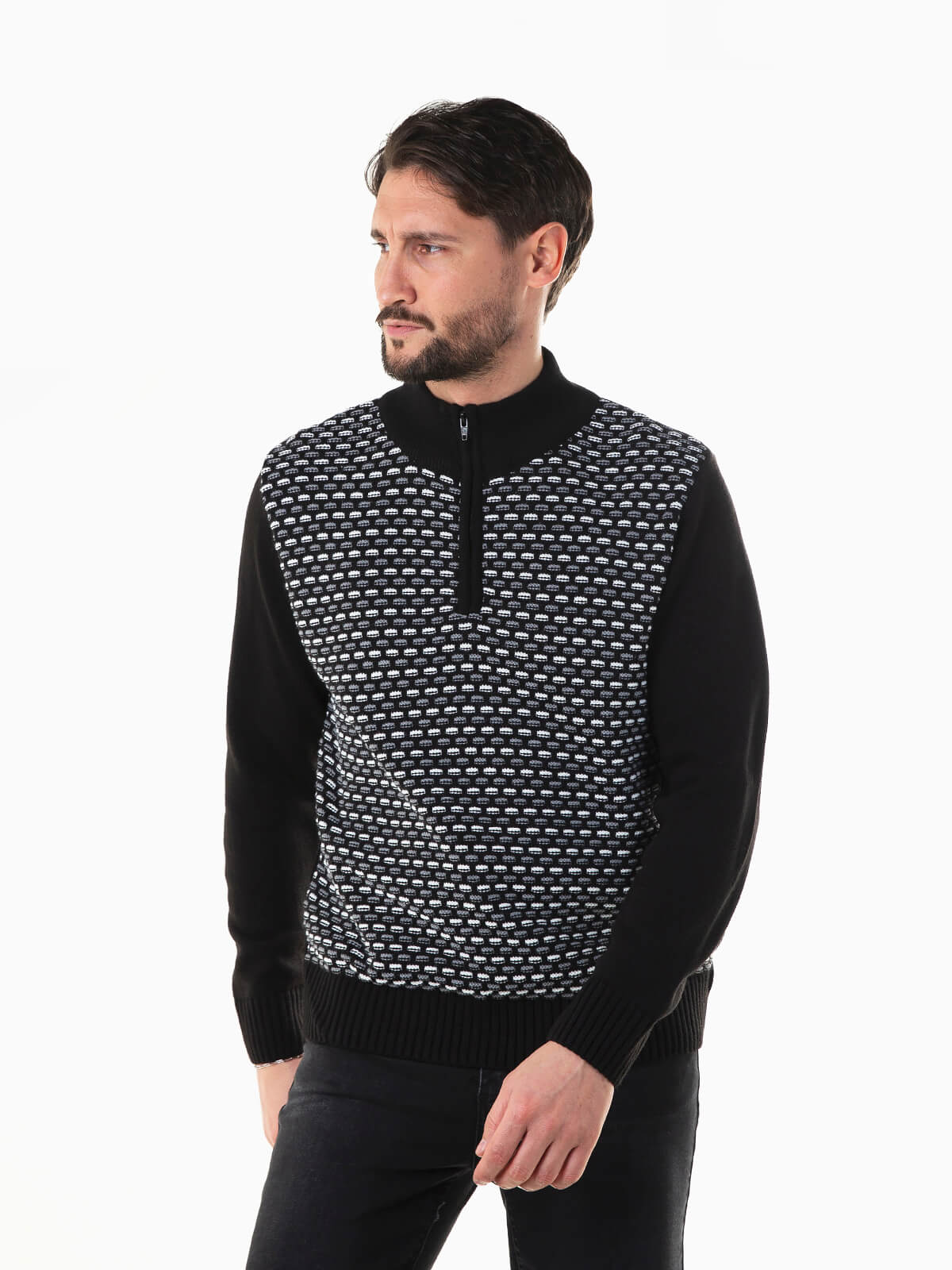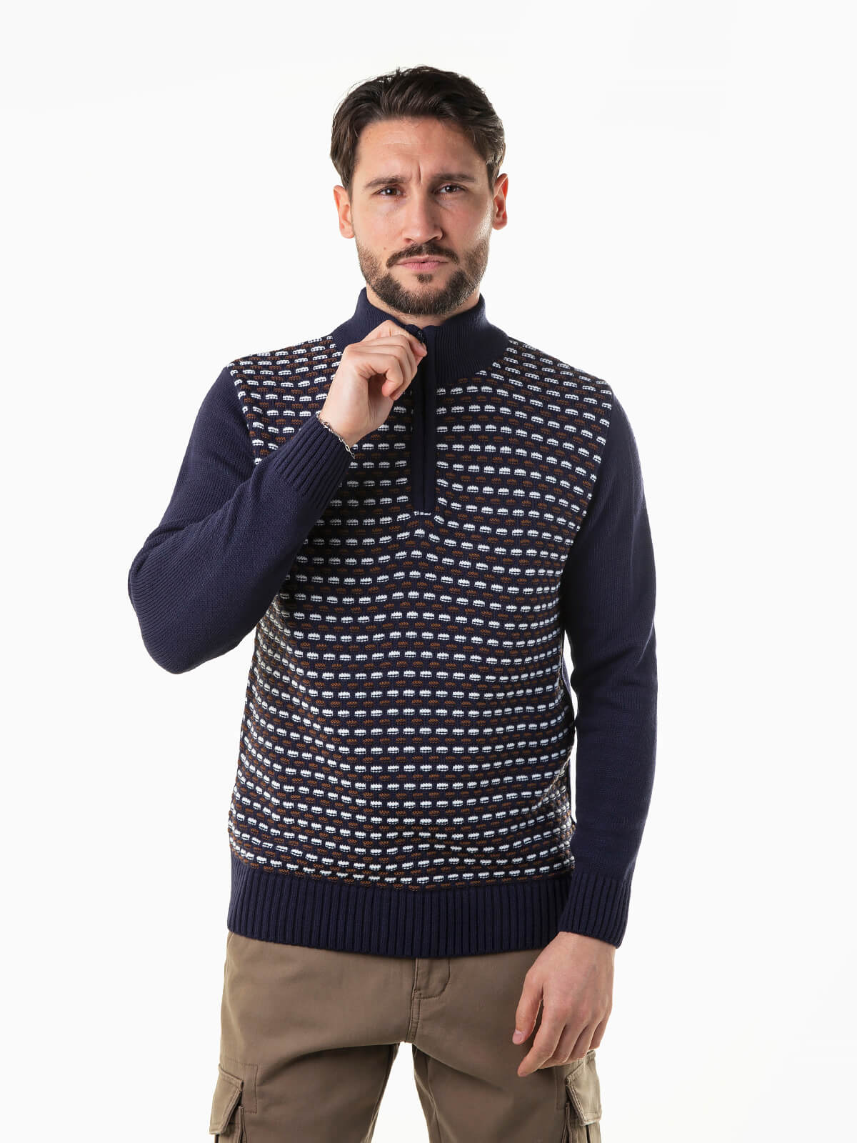 Camisola de malha jaquard com aperto de fecho zíper. Camisola de manga comprida com acabamentos canelados. Gola subida.