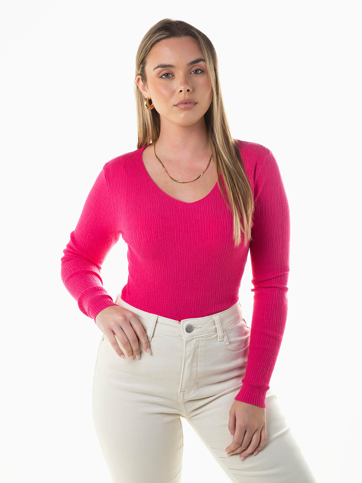 Camisola em malha estruturada com decote em V para senhora. Camisola de manga comprida com mistura de viscose para maior aconchego.